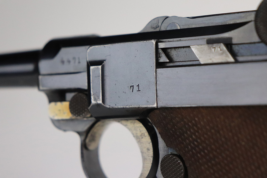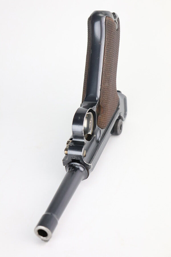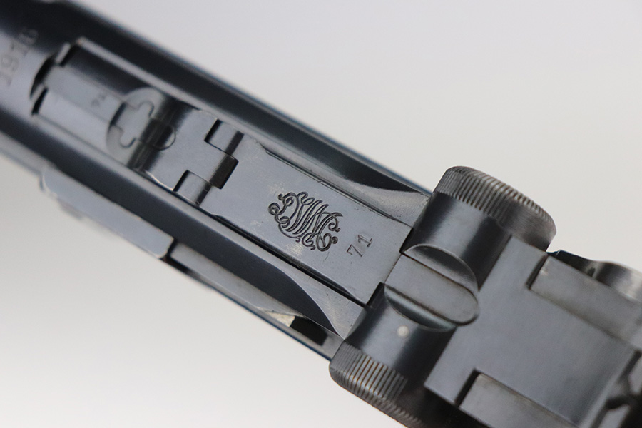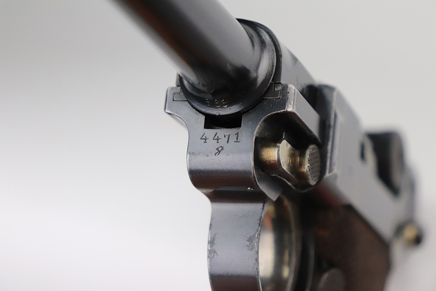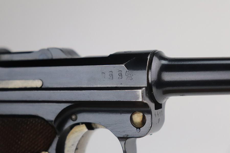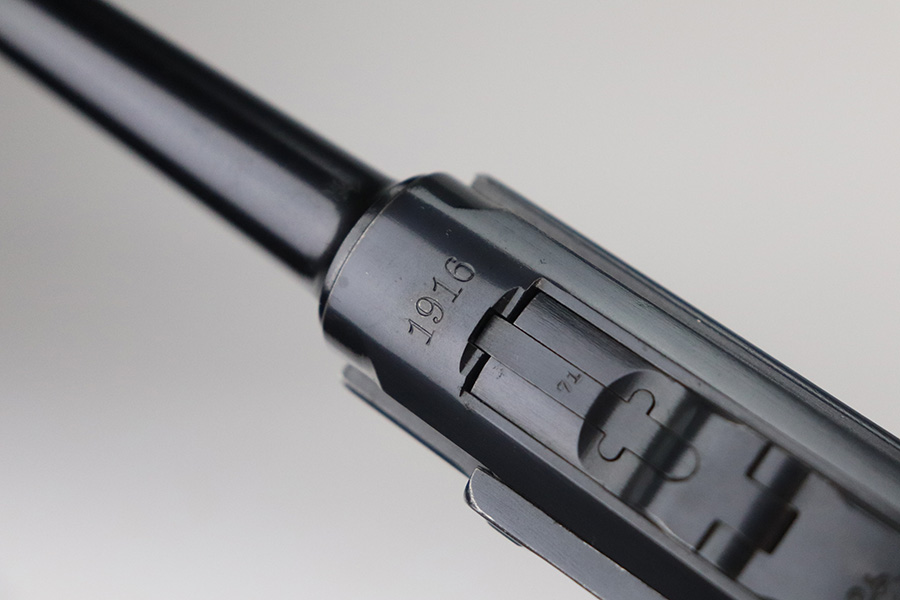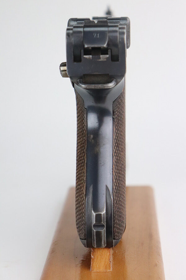7/6/21 – This is an excellent example of a DWM Luger issued to the Imperial German military in 1916. It is all matching and has the proper Imperial proofs. It has retained about 97% of its original finish. There are hints of wear on the side plate, side rails, and around the muzzle. Somewhat spotty wear and minor freckling on both straps. There is an area of pin-pricking on the side plate. Comes with excellent matching grips and a Swiss magazine. The bore is shiny with strong rifling and minor frosting in the grooves.