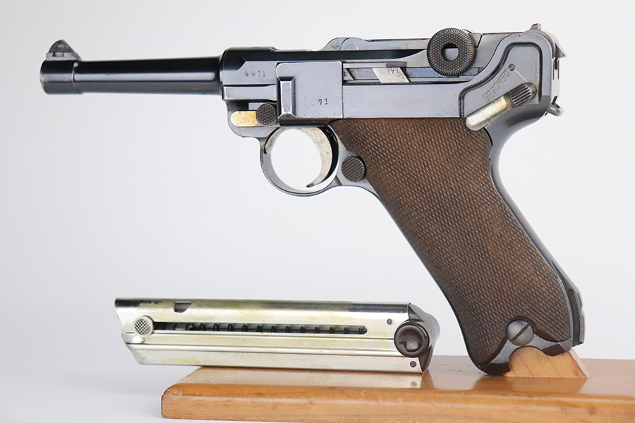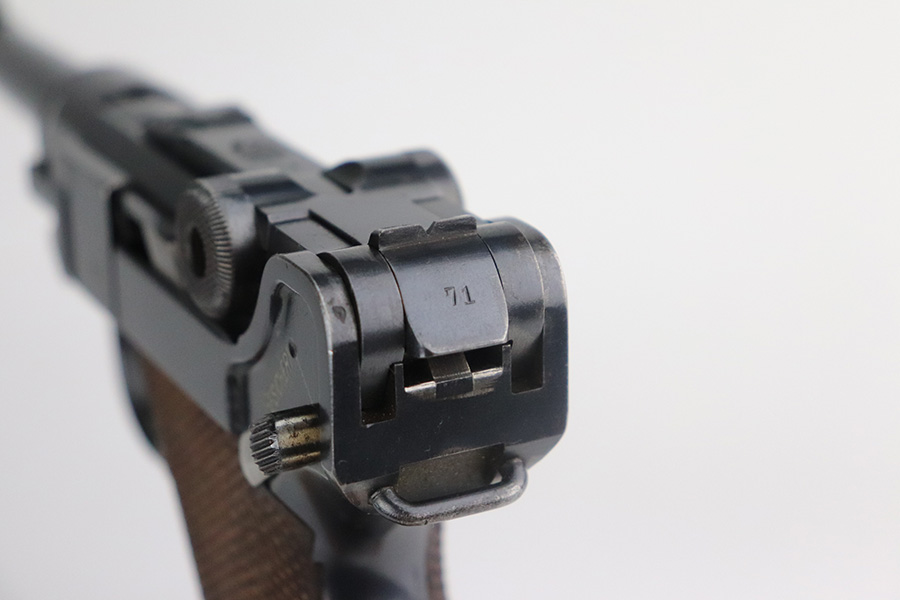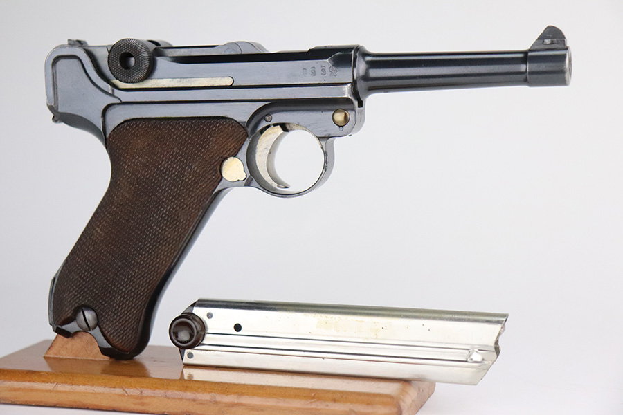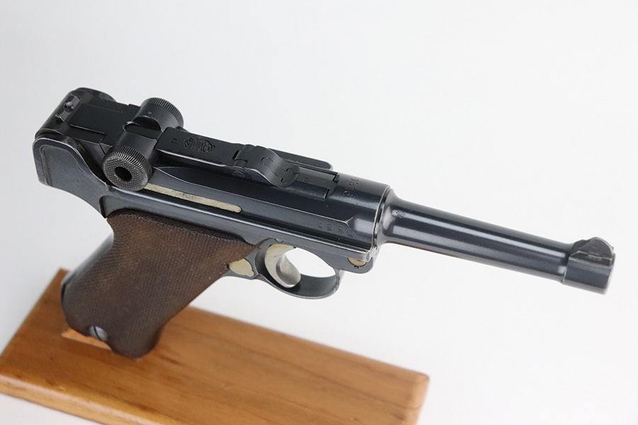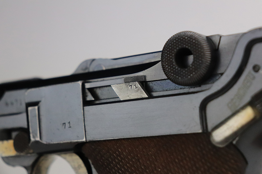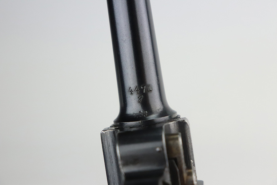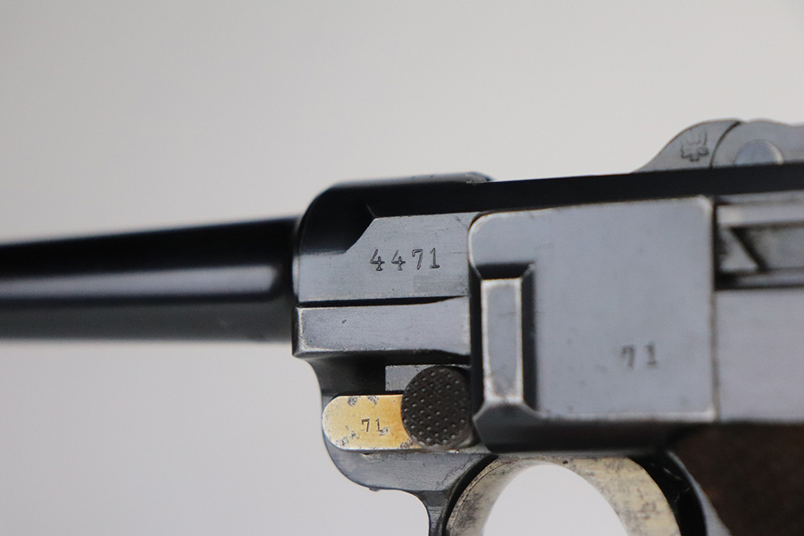 7/6/21 – This is an excellent example of a DWM Luger issued to the Imperial German military in 1916. It is all matching and has the proper Imperial proofs. It has retained about 97% of its original finish. There are hints of wear on the side plate, side rails, and around the muzzle. Somewhat spotty wear and minor freckling on both straps. There is an area of pin-pricking on the side plate. Comes with excellent matching grips and a Swiss magazine. The bore is shiny with strong rifling and minor frosting in the grooves.