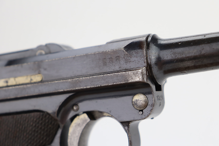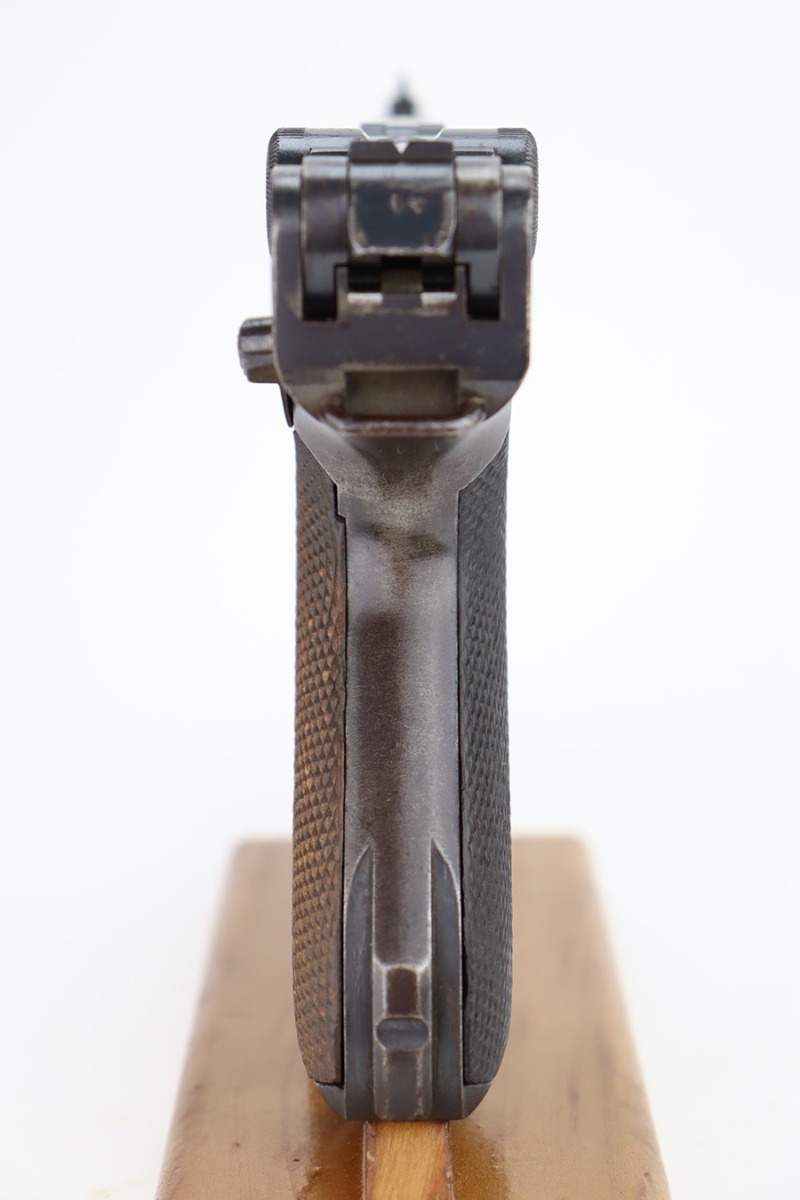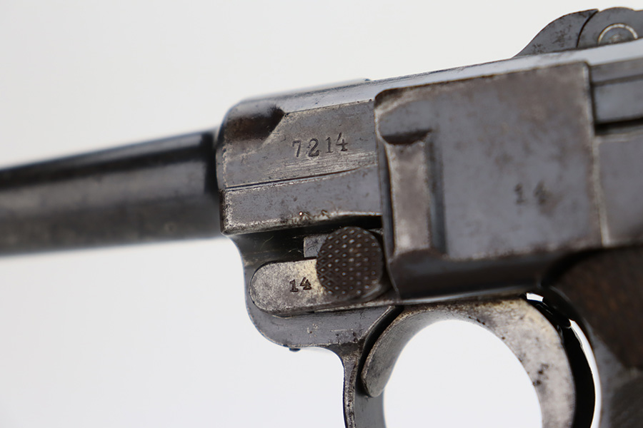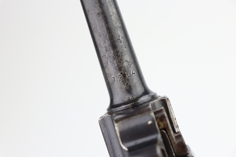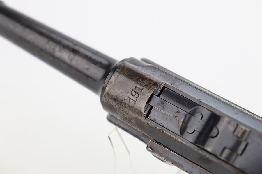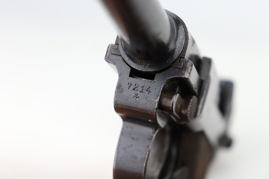 12/1/23 – This is a DWM Luger issued to the Imperial German military in 1916. All matching with the proper Imperial military proofs. The bluing rates roughly 80%. While there isn’t a ton of actual finish loss, there is obvious spotty oxidation covering the whole gun and some areas of minor pitting here and there. Fitted with un-numbered wood grips – they are different colors. Comes with a mismatched but period-correct magazine. The condition of the bore is poor – worn rifling with obvious pitting throughout.