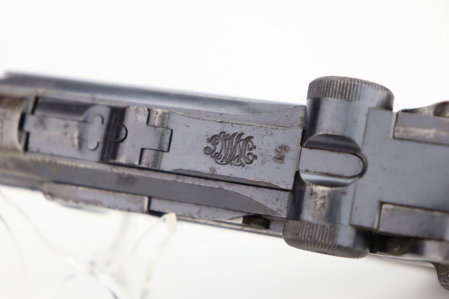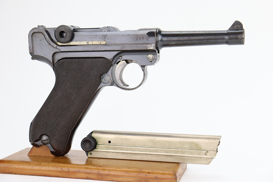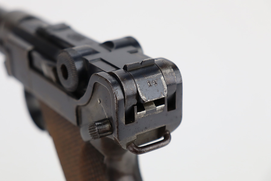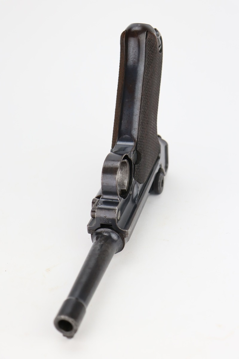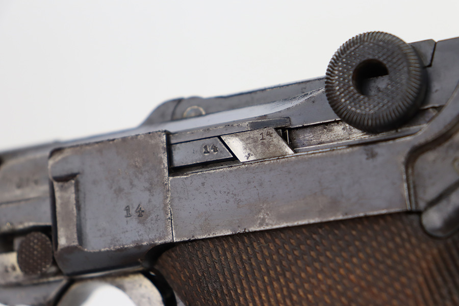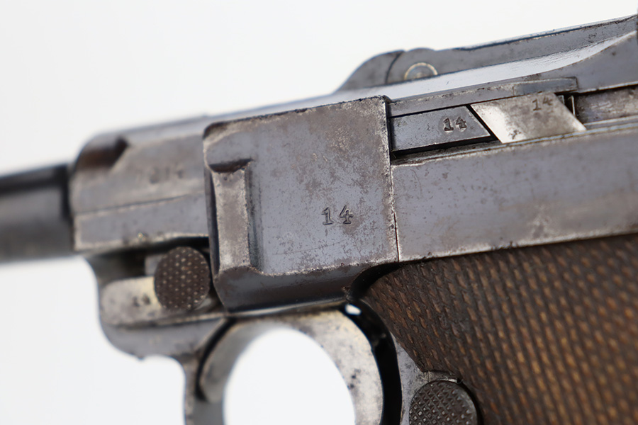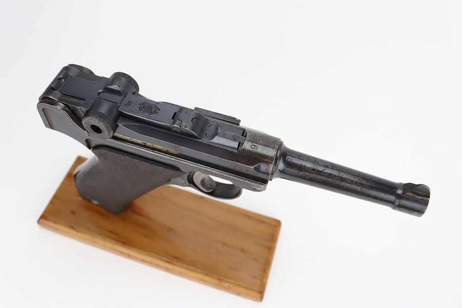 12/1/23 – This is a DWM Luger issued to the Imperial German military in 1916. All matching with the proper Imperial military proofs. The bluing rates roughly 80%. While there isn’t a ton of actual finish loss, there is obvious spotty oxidation covering the whole gun and some areas of minor pitting here and there. Fitted with un-numbered wood grips – they are different colors. Comes with a mismatched but period-correct magazine. The condition of the bore is poor – worn rifling with obvious pitting throughout.