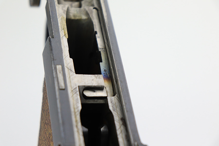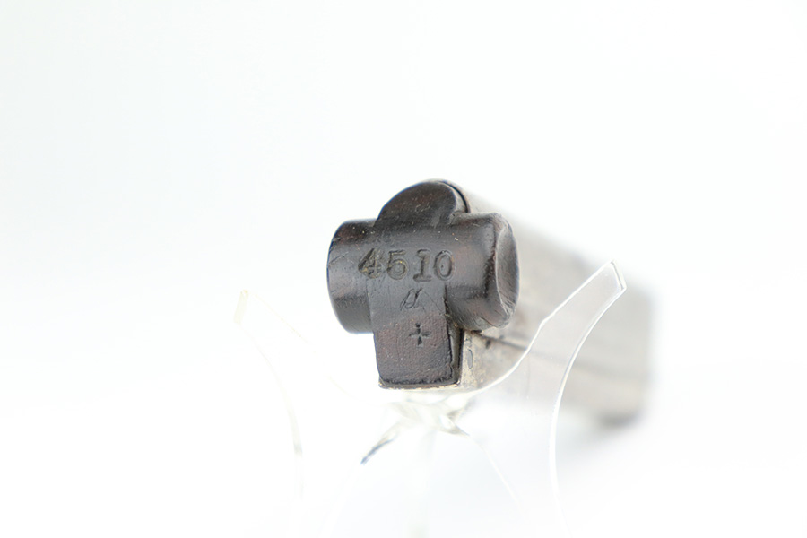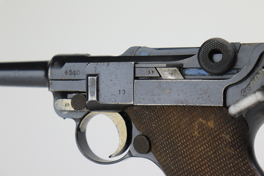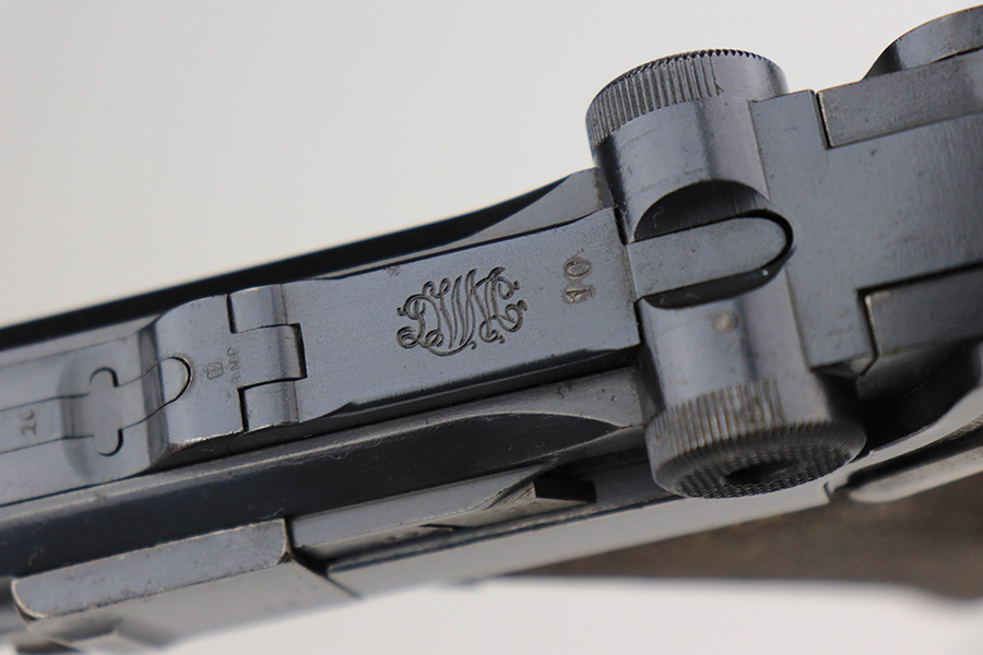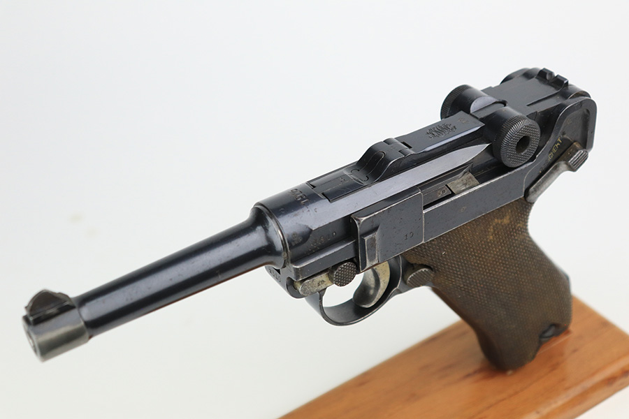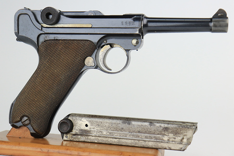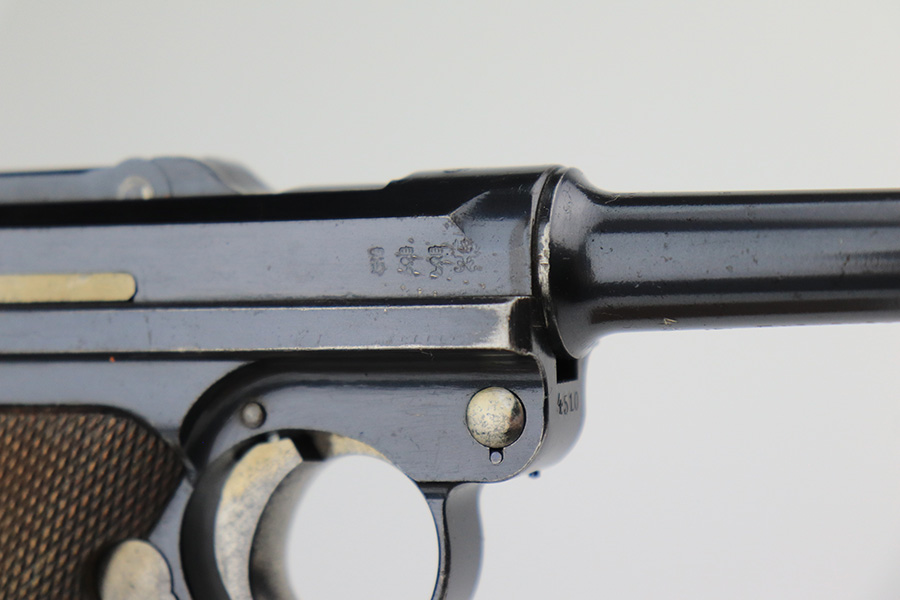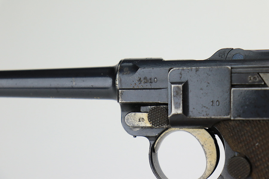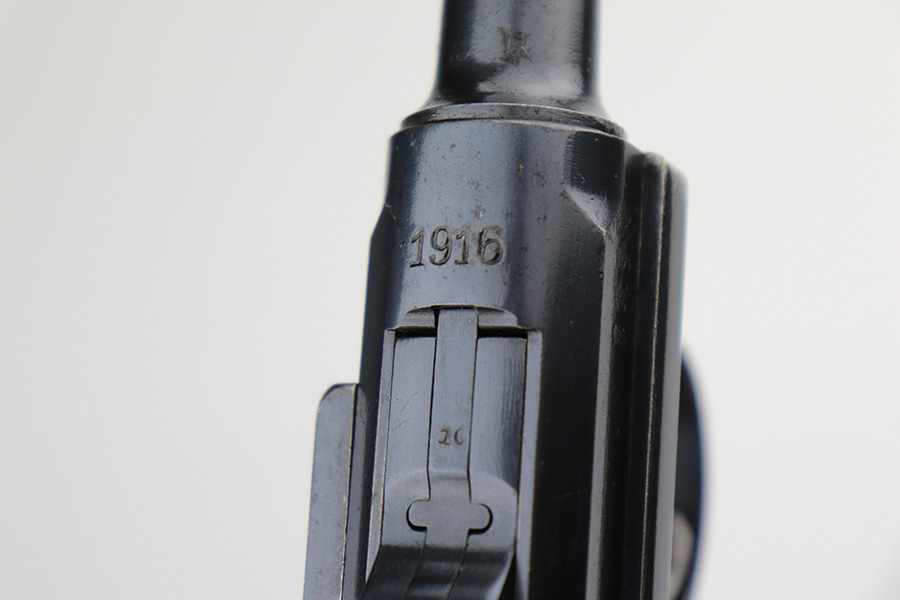 5/19/22 – This is a very nice example of a DWM Luger issued to the Imperial German military in 1916. The gun is all matching and has the proper Imperial proofs. There are British proofs throughout, indicating this was likely a British capture. It does come with a matching-numbered magazine, but the numbering is not original. The gun has retained about 97% of its bluing. There is muzzle wear and minor wear on the side plate and side rails. While there isn’t a ton of actual finish loss, there is noticeable freckling on the straps and both sides of the frame. An area of noticeable pitting on the right side of the frame. There are some marks on the left side of the slide that look like they’re from the jaws of a vice. Comes with nice wood grips that are numbered but not matching. The rifling in the bore is a little worn with minor pitting throughout.