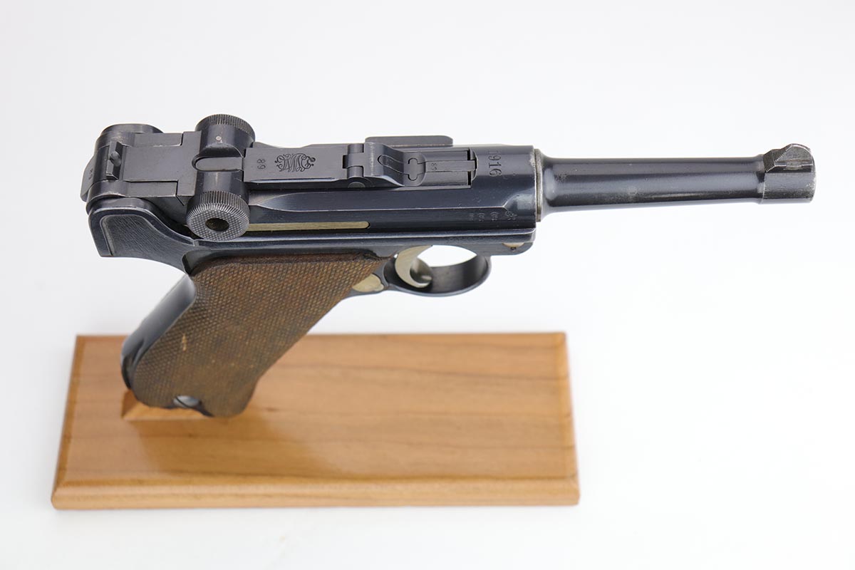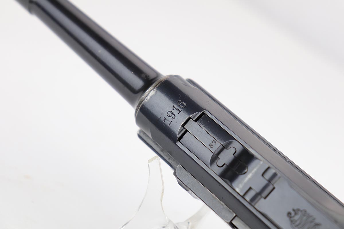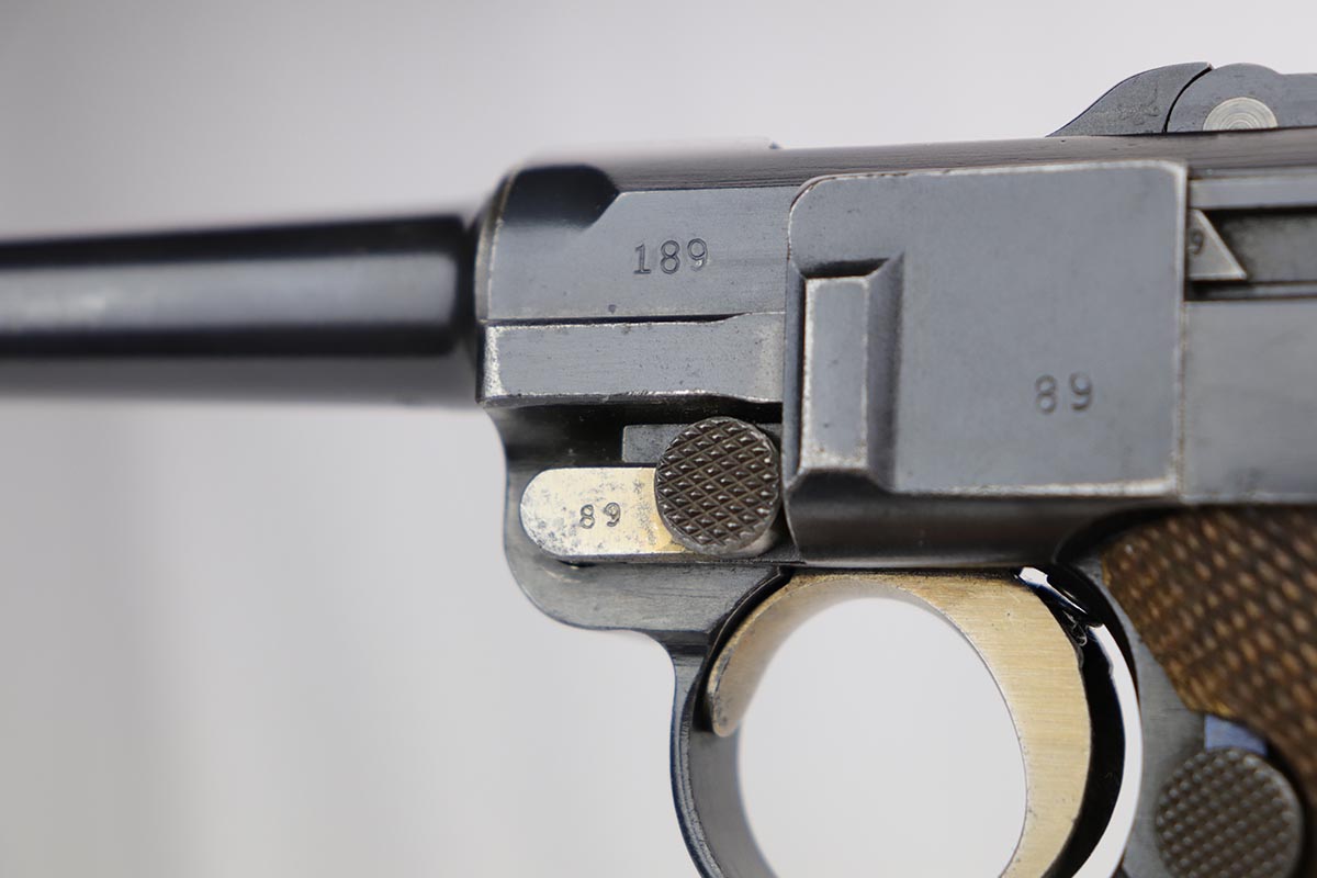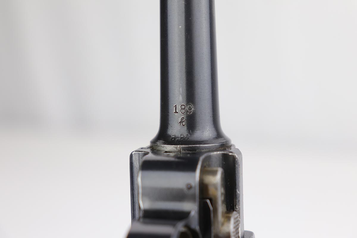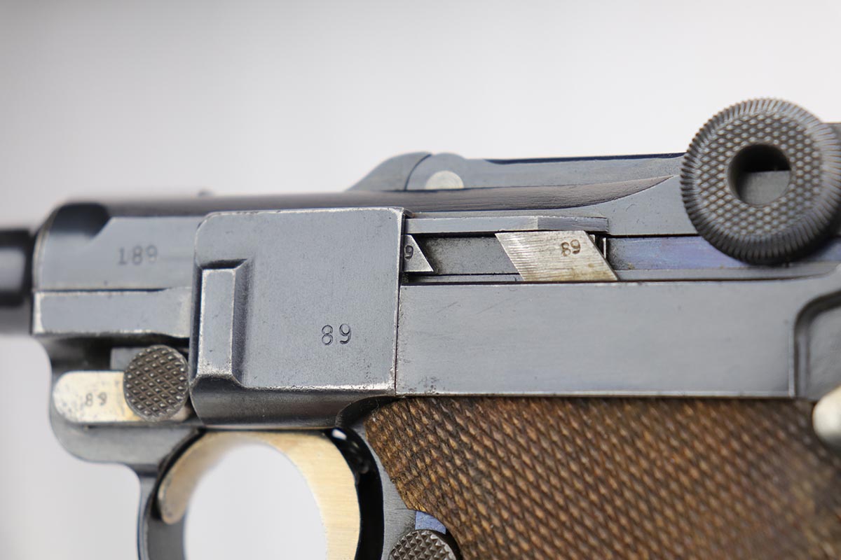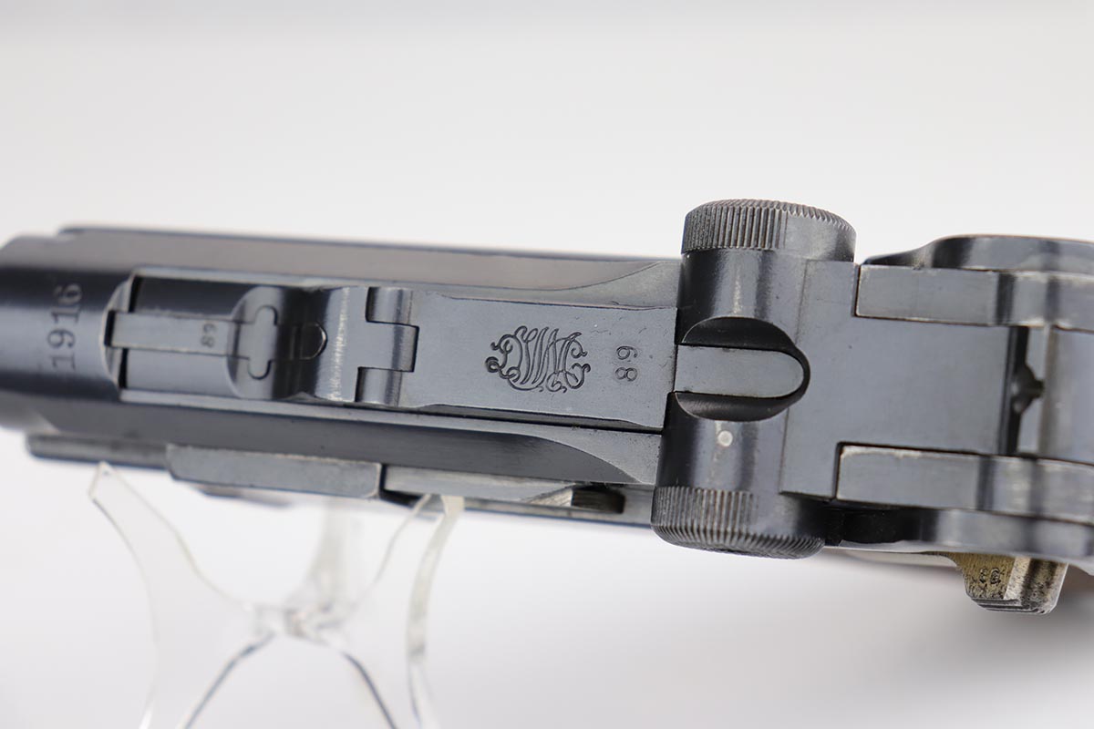 10/11/19 – This is an original WW1 DWM Luger P.08, made in 1916. It is chambered for 9mm. Overall, the pistol is in excellent condition. We rate the original blued finish to be ~97%. There is very little actual finish loss. There are two small areas of wear on the left and right side of the barrel, around the muzzle, and on a few of the high edges. The small parts have retained most of their strawed finish except for the safety lever. All numbered parts are matching. No import marks. There is “46” marking on the bottom of the front strap which we believe to be a unit number. The gun comes with a period-correct mag, not matching to the gun. The grip panels are original and excellent. They are numbered and match the gun. The gun is fully functional. Excellent bore – shiny with strong rifling, 9/10. C&R eligible.