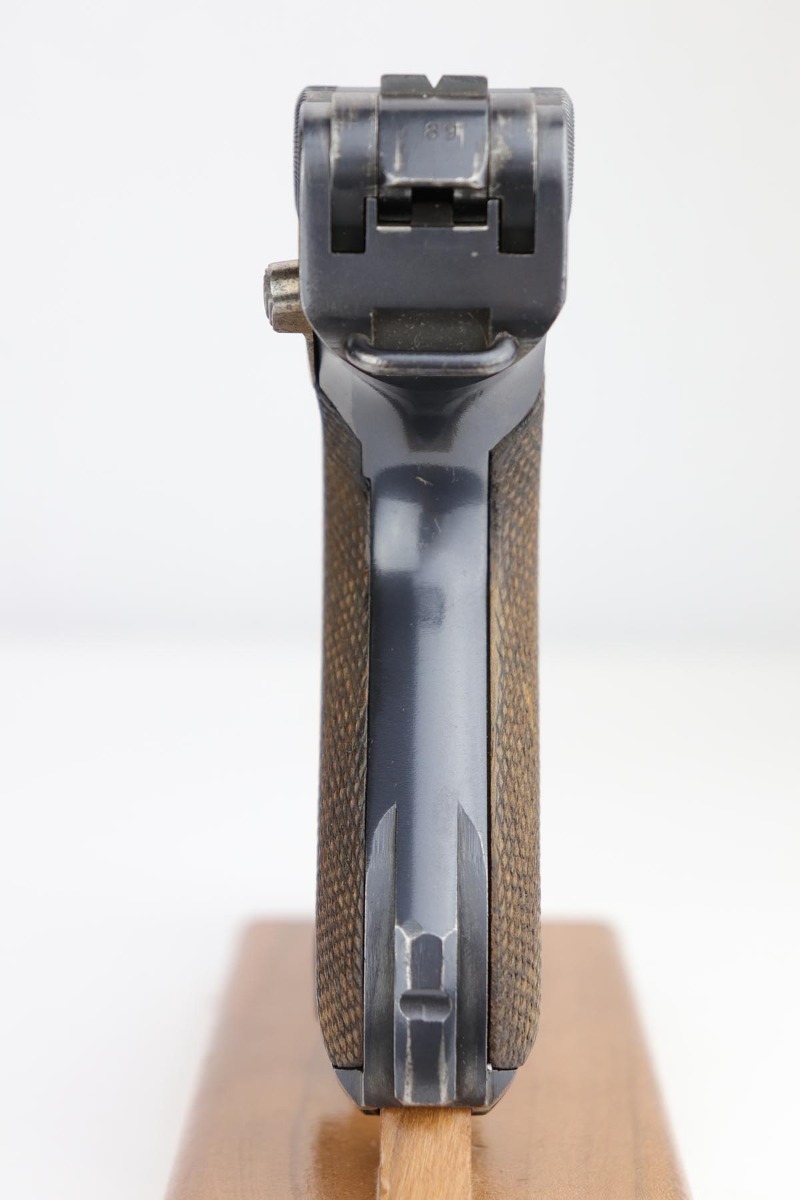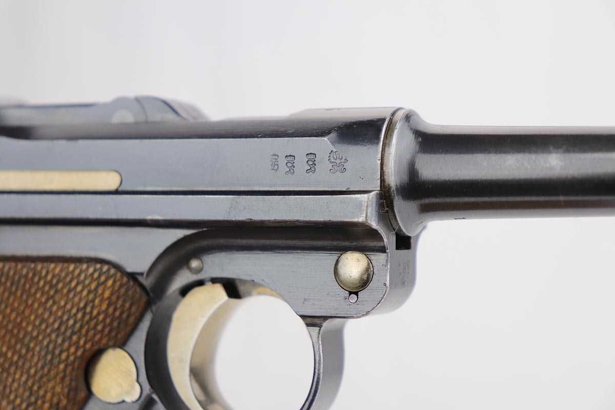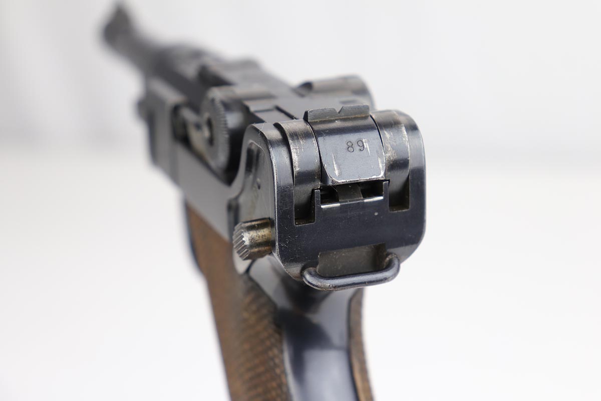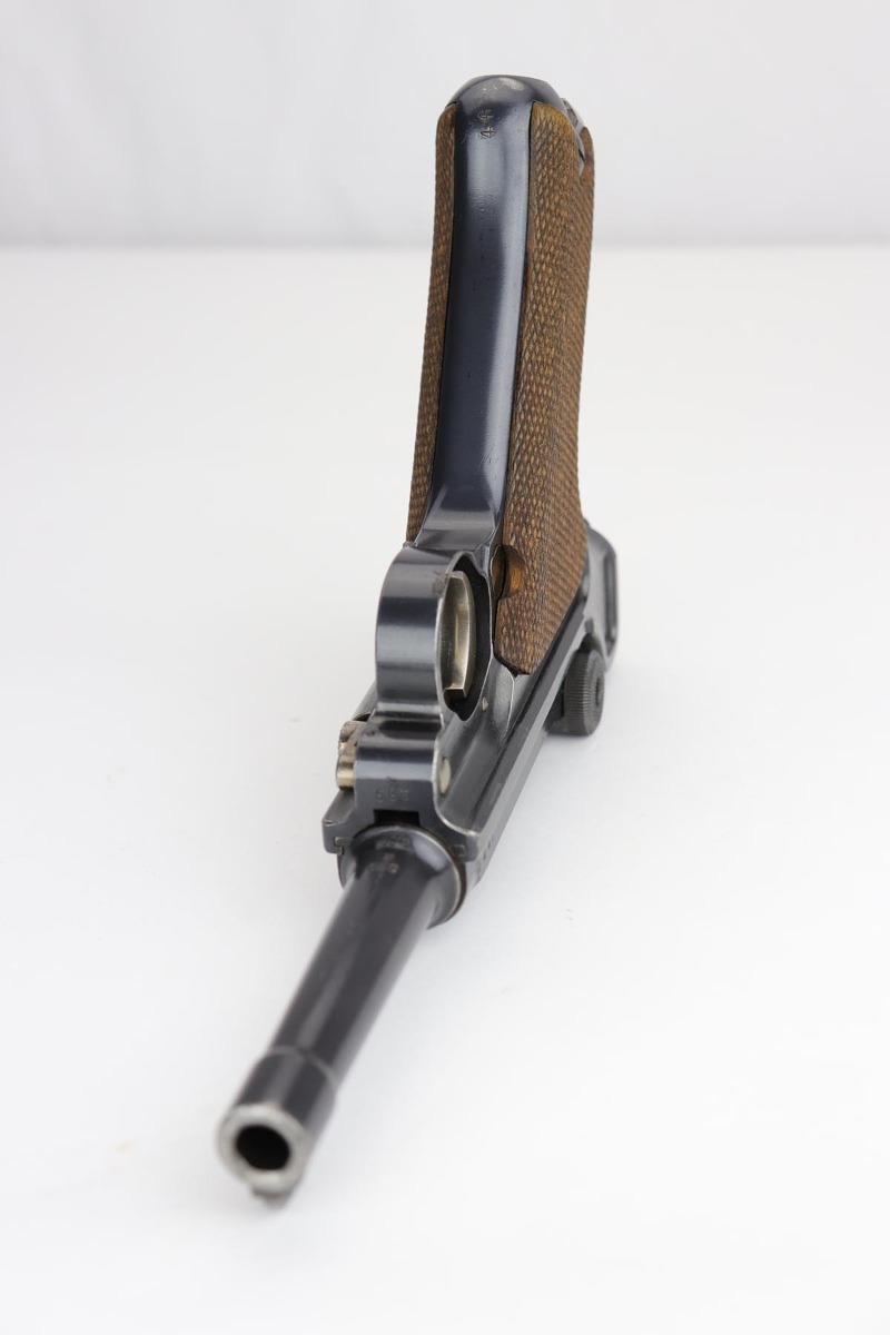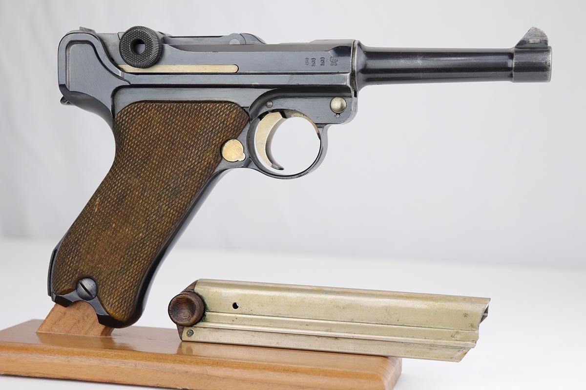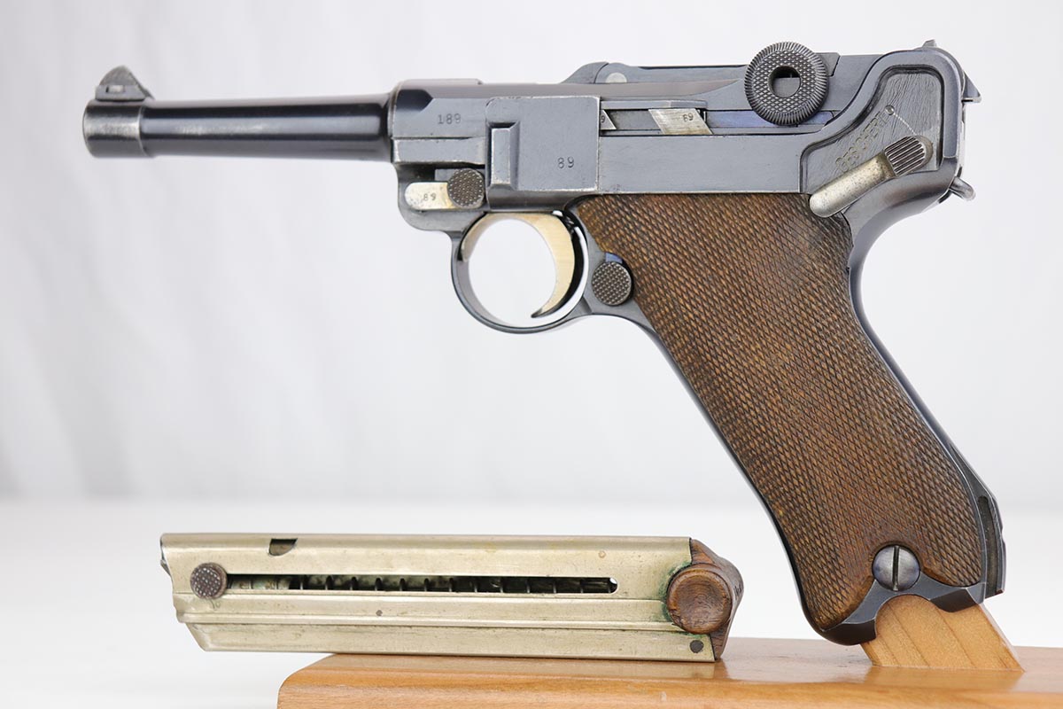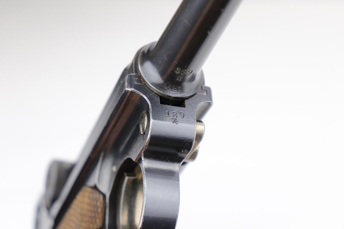 10/11/19 – This is an original WW1 DWM Luger P.08, made in 1916. It is chambered for 9mm. Overall, the pistol is in excellent condition. We rate the original blued finish to be ~97%. There is very little actual finish loss. There are two small areas of wear on the left and right side of the barrel, around the muzzle, and on a few of the high edges. The small parts have retained most of their strawed finish except for the safety lever. All numbered parts are matching. No import marks. There is “46” marking on the bottom of the front strap which we believe to be a unit number. The gun comes with a period-correct mag, not matching to the gun. The grip panels are original and excellent. They are numbered and match the gun. The gun is fully functional. Excellent bore – shiny with strong rifling, 9/10. C&R eligible.