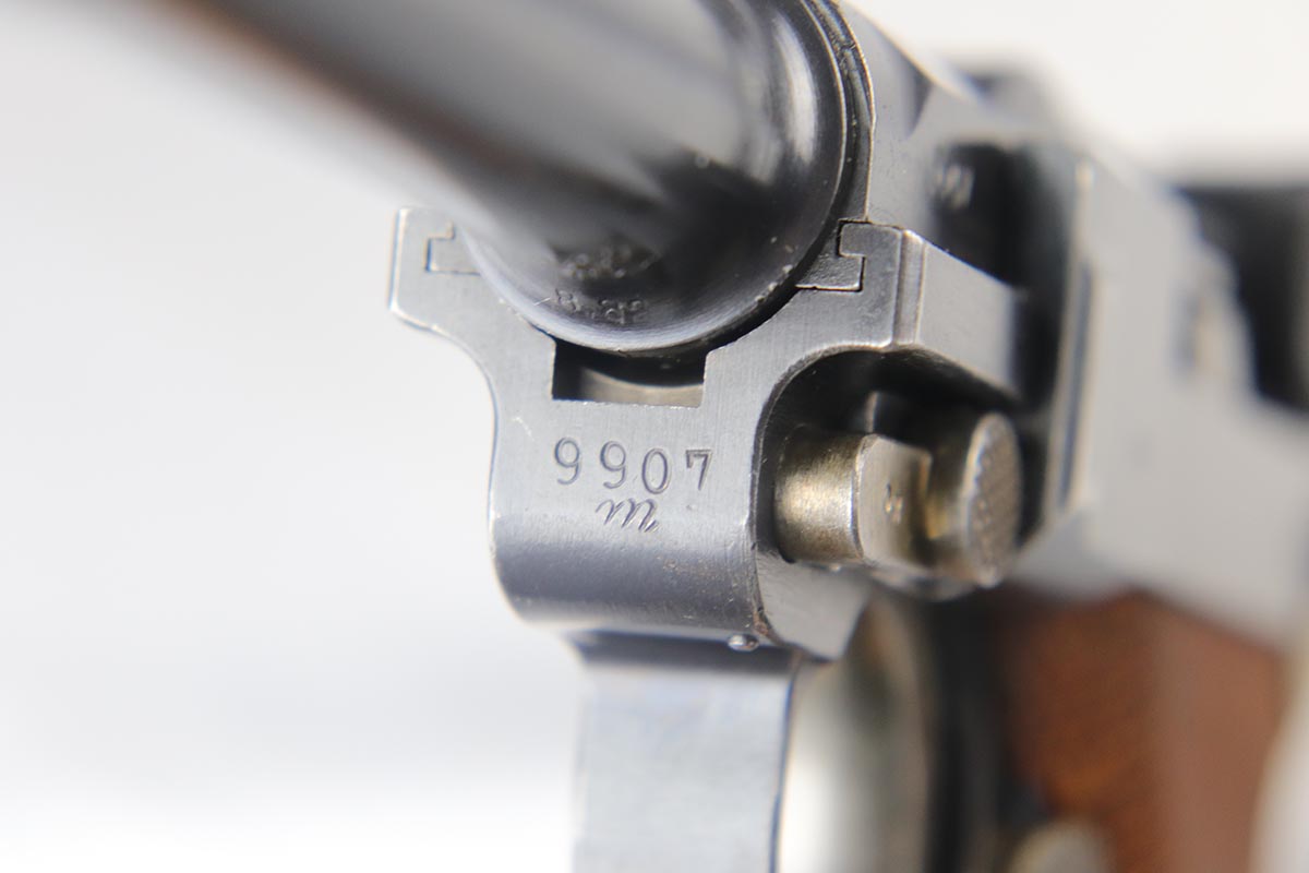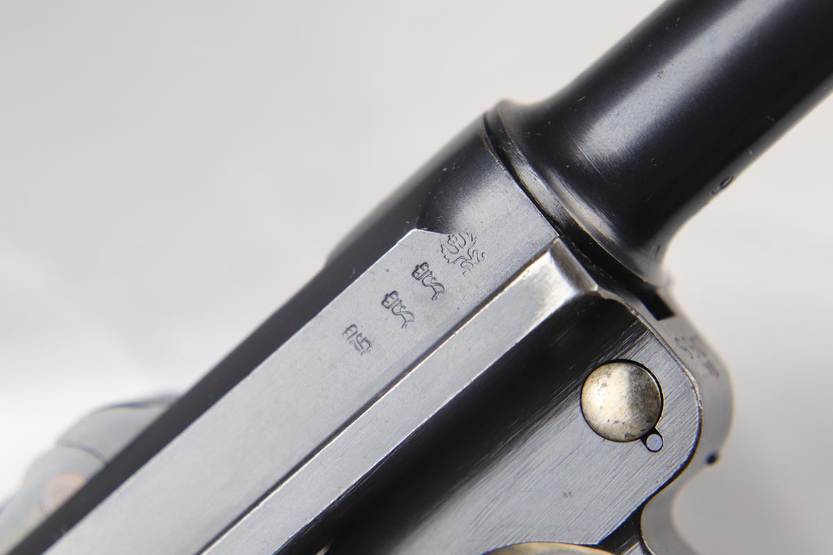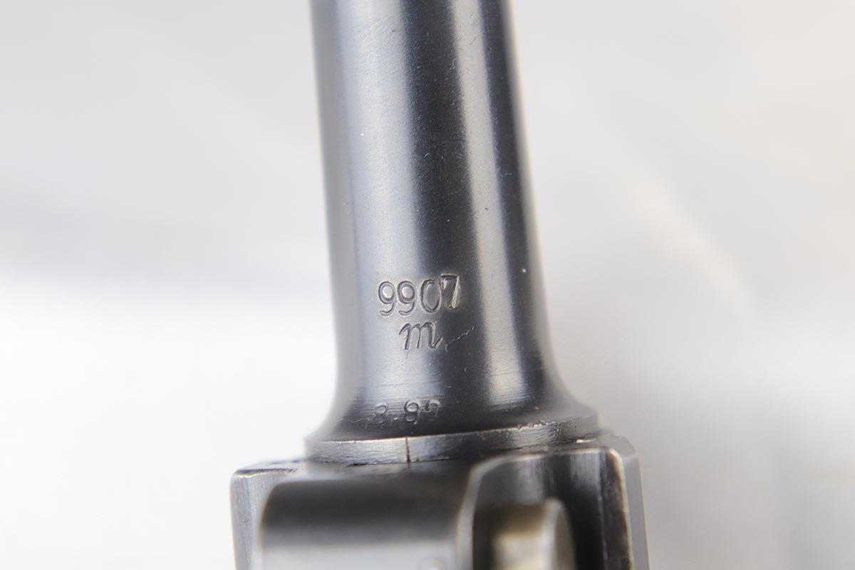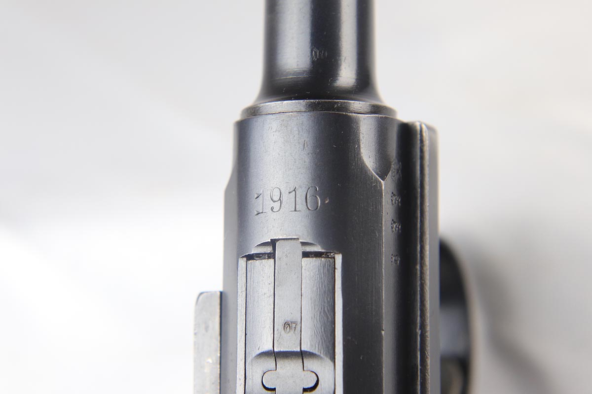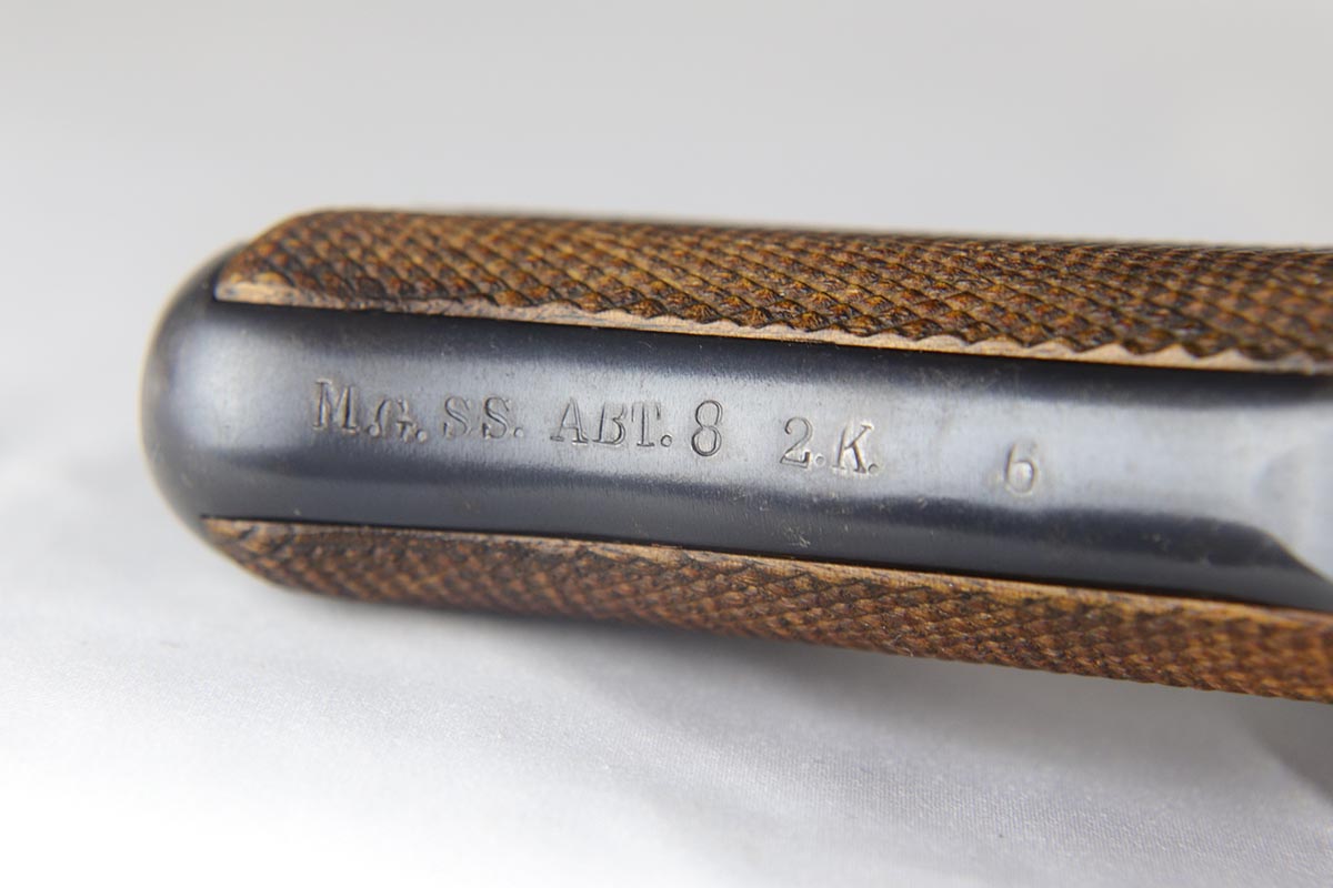 5/2/18 – This is an excellent condition 1916 dated DWM  Luger with the rarest and the most desirable Imperial unit Marking: M.G. S.S. ABT. 8 2K 6.   This stands for MachinenGewehr Scharf Shtutzen Abteilung 8, Kompagnie 2, weapon 6 – a Sharp Shooter Machine gun company.  According to Jan Still, these were elite machine gun companies that received specialized training and were considered to be the best crack troops on the German side during WWI. Only a handful of guns with this rare unit marking have ever been reported, all dated 1916 and all from the same regiment.  This particular gun remains in excellent original condition with about 95% of its original blue present.  It is all matching except the magazine, which is only a few hundred digits off the gun’s serial number with the same M suffix. The bore and grips are excellent as well. Original holster is dated 1916, and has the unit depot marking and a maker mark under the flap. It is in excellent condition. This is probably the rarest unit marked WWI Luger that one can come across.