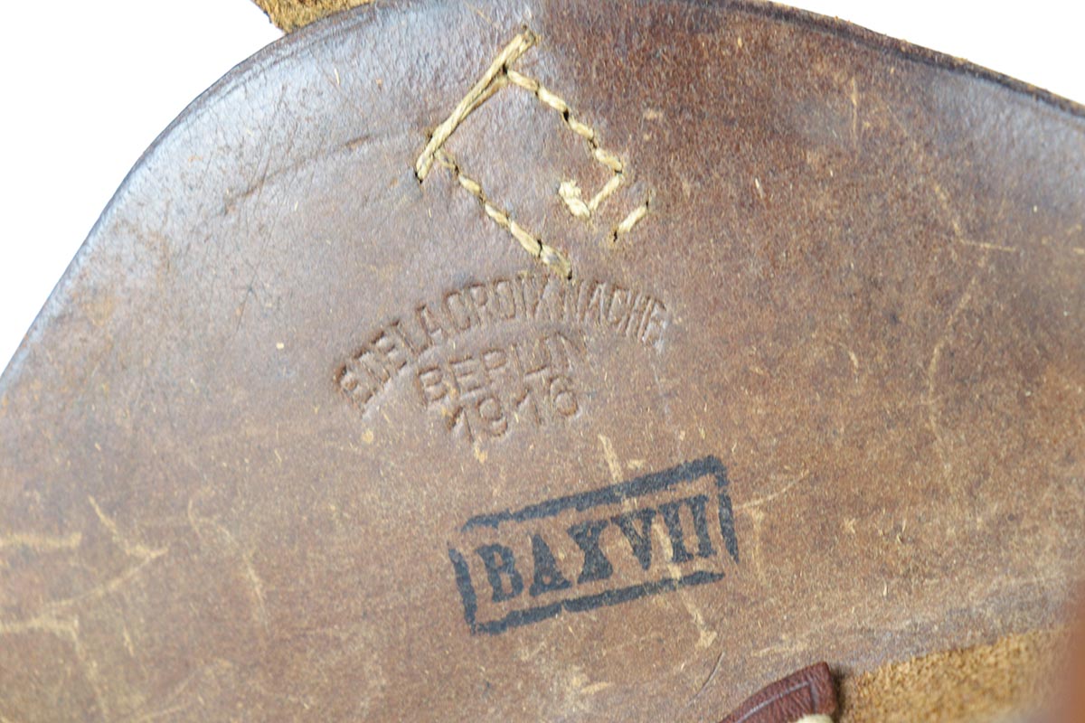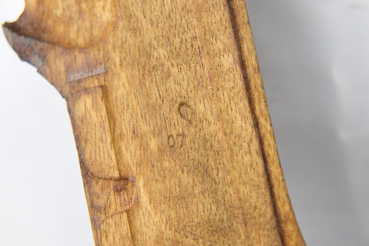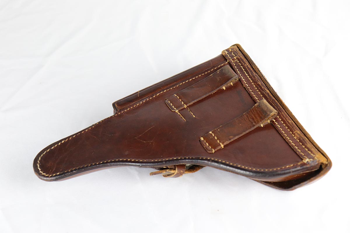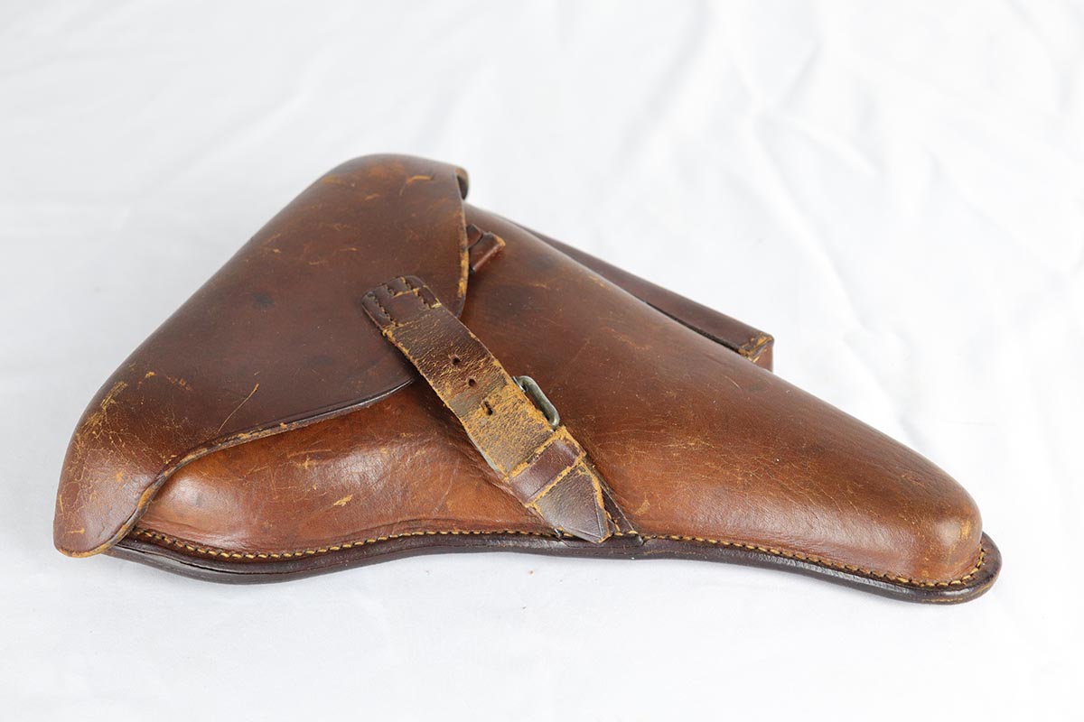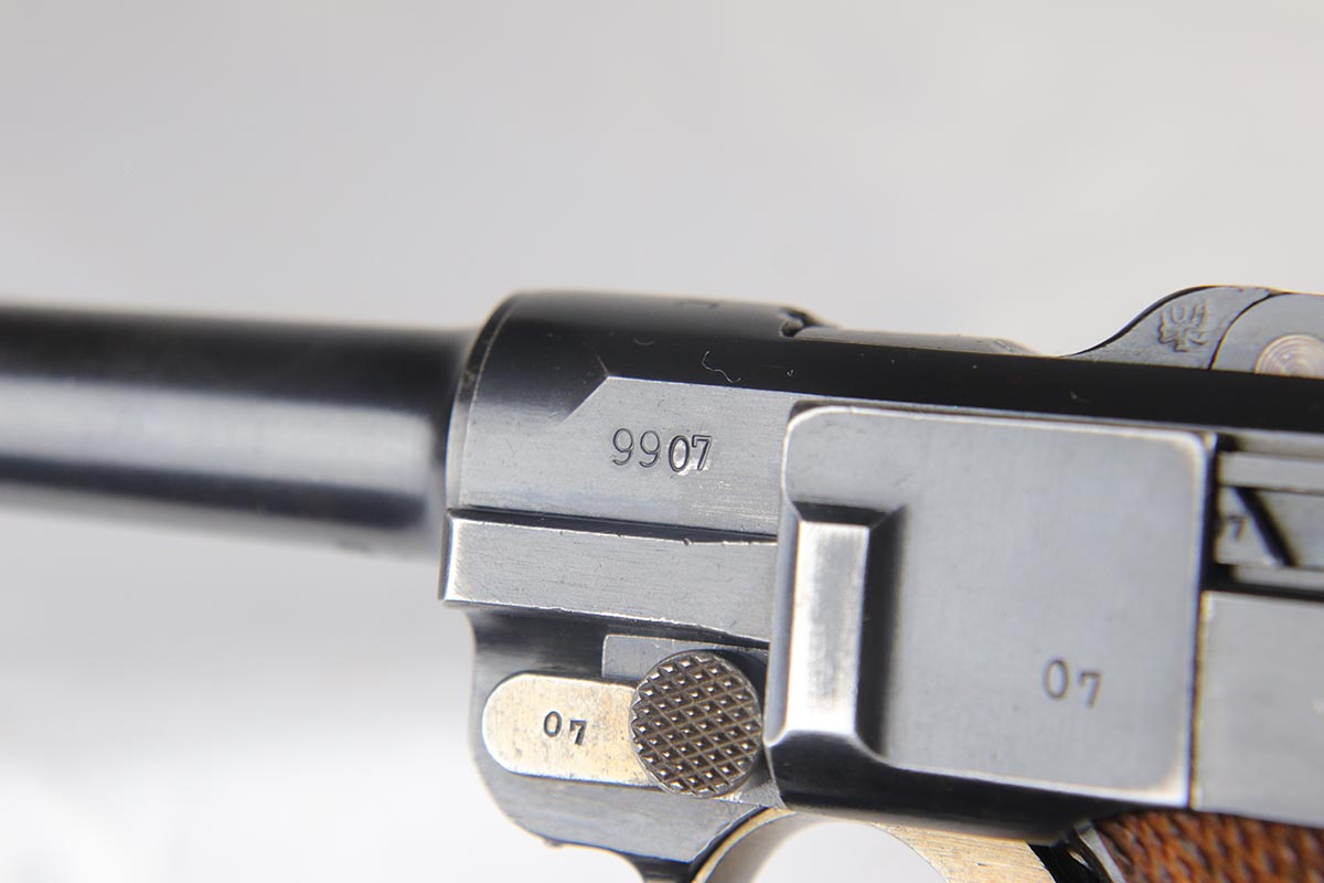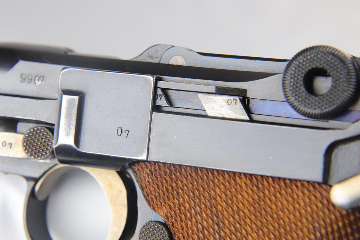 5/2/18 – This is an excellent condition 1916 dated DWM  Luger with the rarest and the most desirable Imperial unit Marking: M.G. S.S. ABT. 8 2K 6.   This stands for MachinenGewehr Scharf Shtutzen Abteilung 8, Kompagnie 2, weapon 6 – a Sharp Shooter Machine gun company.  According to Jan Still, these were elite machine gun companies that received specialized training and were considered to be the best crack troops on the German side during WWI. Only a handful of guns with this rare unit marking have ever been reported, all dated 1916 and all from the same regiment.  This particular gun remains in excellent original condition with about 95% of its original blue present.  It is all matching except the magazine, which is only a few hundred digits off the gun’s serial number with the same M suffix. The bore and grips are excellent as well. Original holster is dated 1916, and has the unit depot marking and a maker mark under the flap. It is in excellent condition. This is probably the rarest unit marked WWI Luger that one can come across.