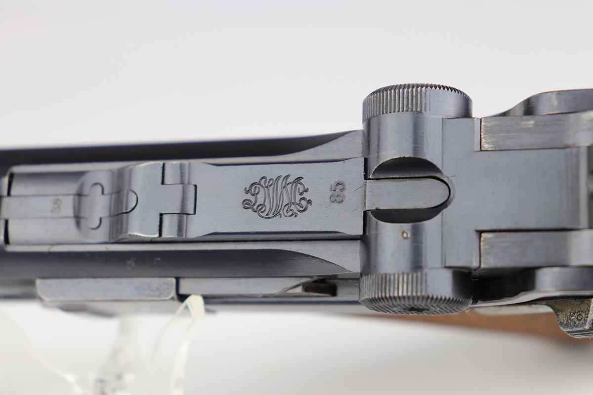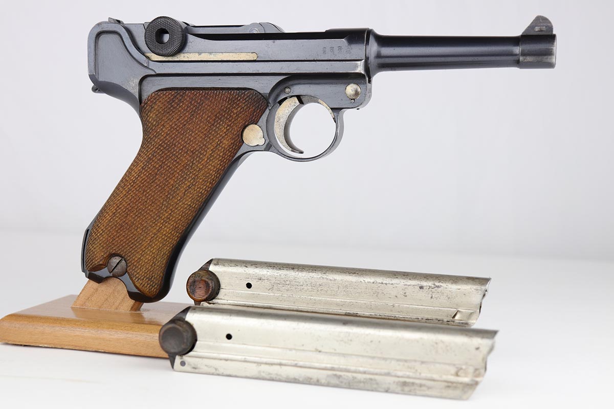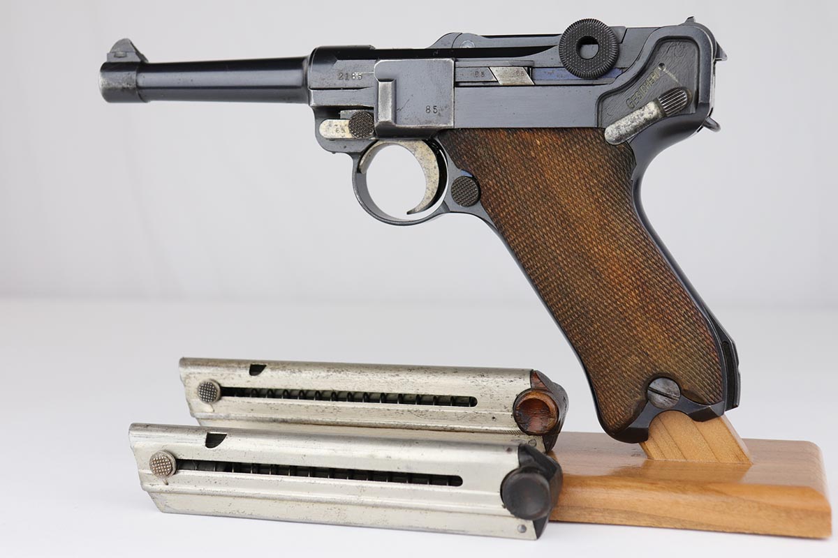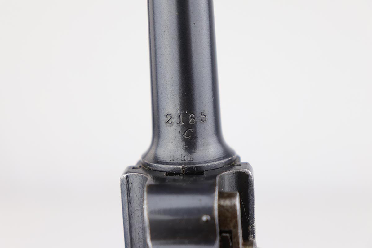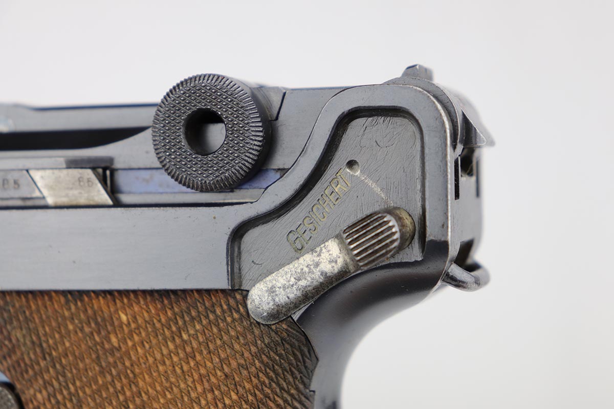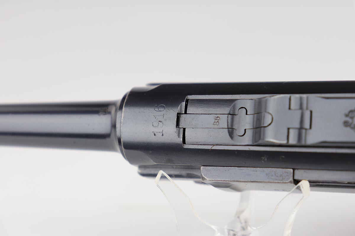 6/11/19 – This is an excellent DWM Luger from 1916, with spare magazine and 1916 dated holster. The pistol is all matching and original, including the grips but not the magazine. The bluing is in great condition, with minor holster wear on the sideplate and muzzle. Beautiful straps and minimal other bluing loss. Small parts retain about 50% original straw. The grips are in excellent condition, but both magazines have cracks in their bases. They are period original magazines but mismatched to this gun. Bore is shiny with strong rifling. The grouping is completed by an excellent, original holster. It is 1916 dated with G.A. Roever maker mark. It has some stitches missing in the top flap but nothing that affects the functionality.