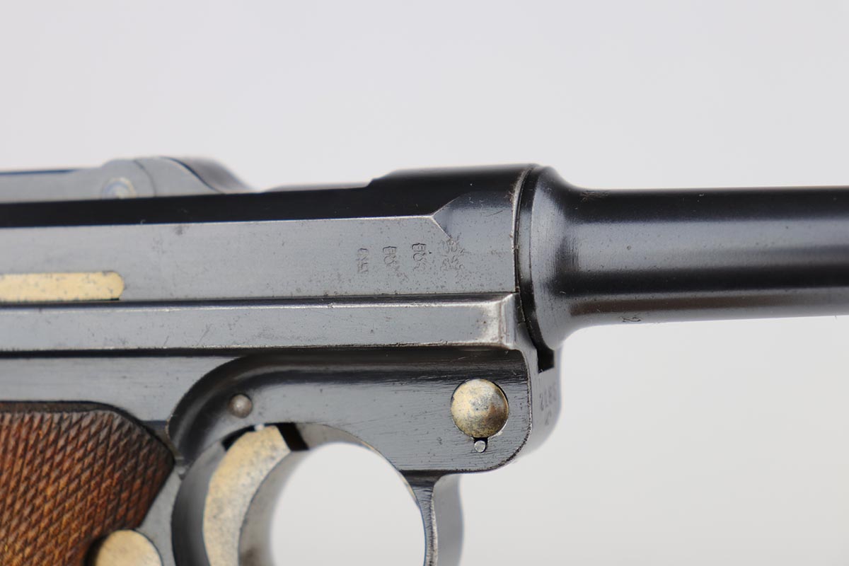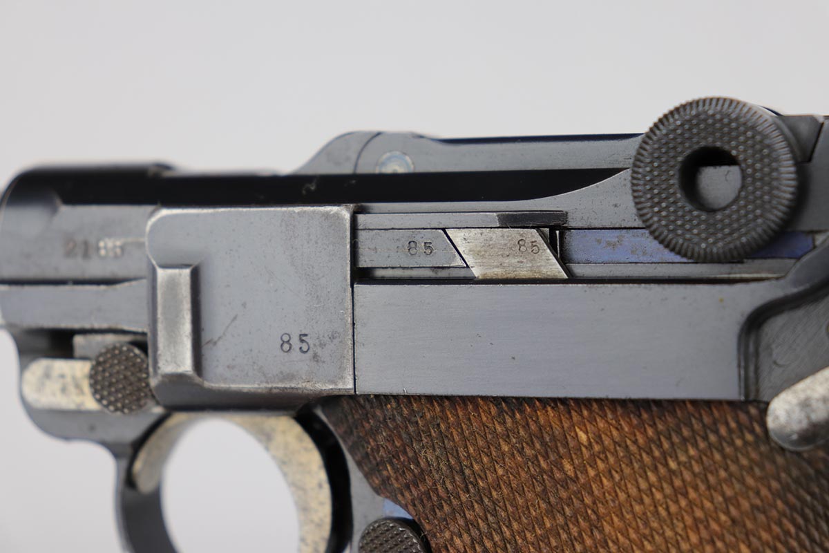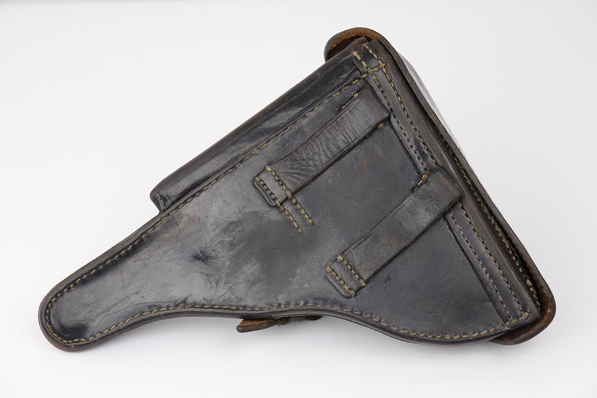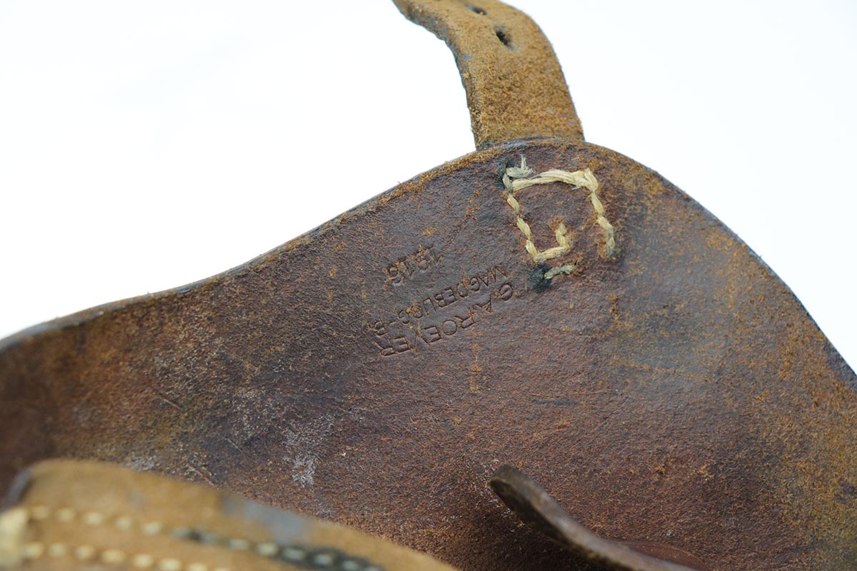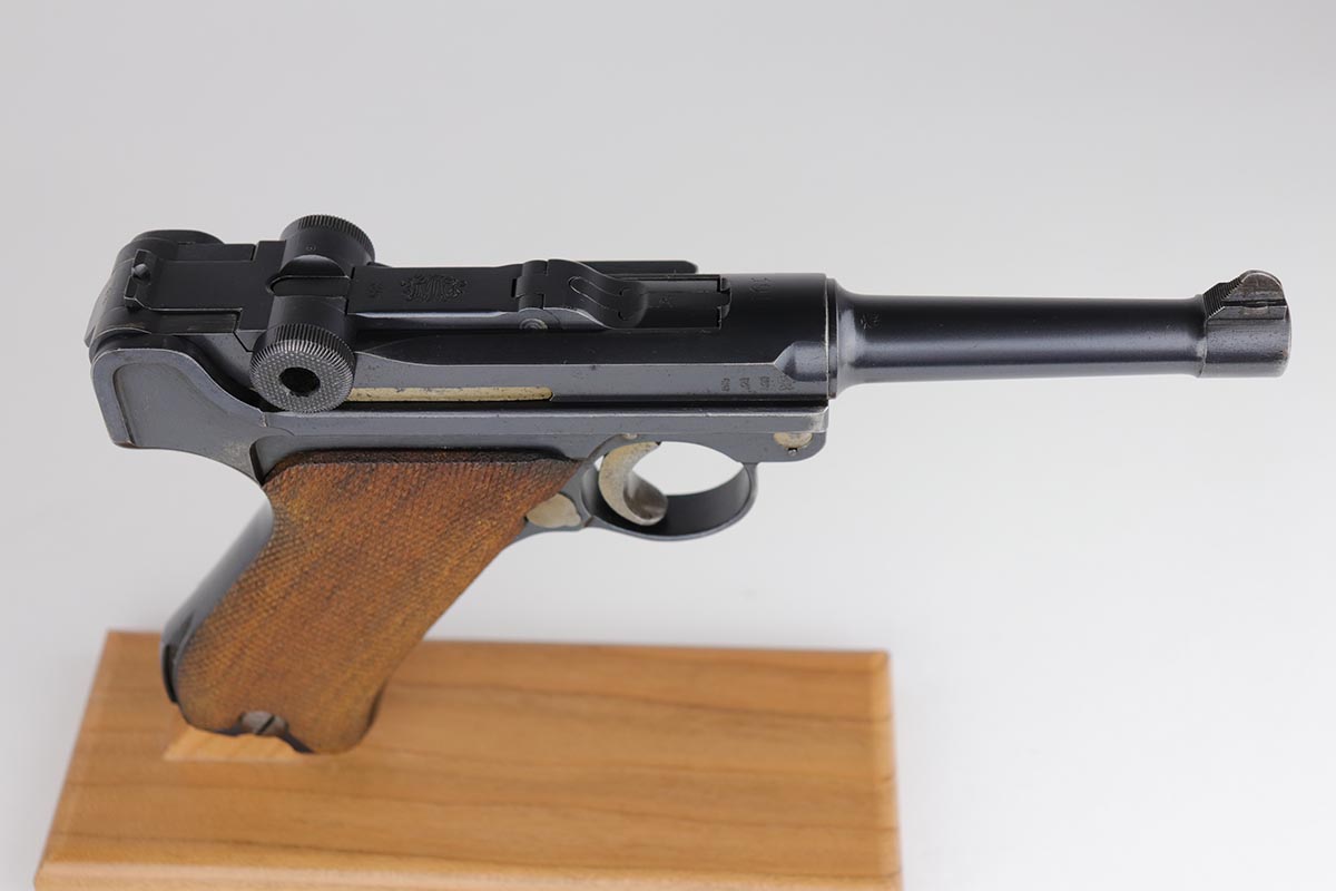 6/11/19 – This is an excellent DWM Luger from 1916, with spare magazine and 1916 dated holster. The pistol is all matching and original, including the grips but not the magazine. The bluing is in great condition, with minor holster wear on the sideplate and muzzle. Beautiful straps and minimal other bluing loss. Small parts retain about 50% original straw. The grips are in excellent condition, but both magazines have cracks in their bases. They are period original magazines but mismatched to this gun. Bore is shiny with strong rifling. The grouping is completed by an excellent, original holster. It is 1916 dated with G.A. Roever maker mark. It has some stitches missing in the top flap but nothing that affects the functionality.