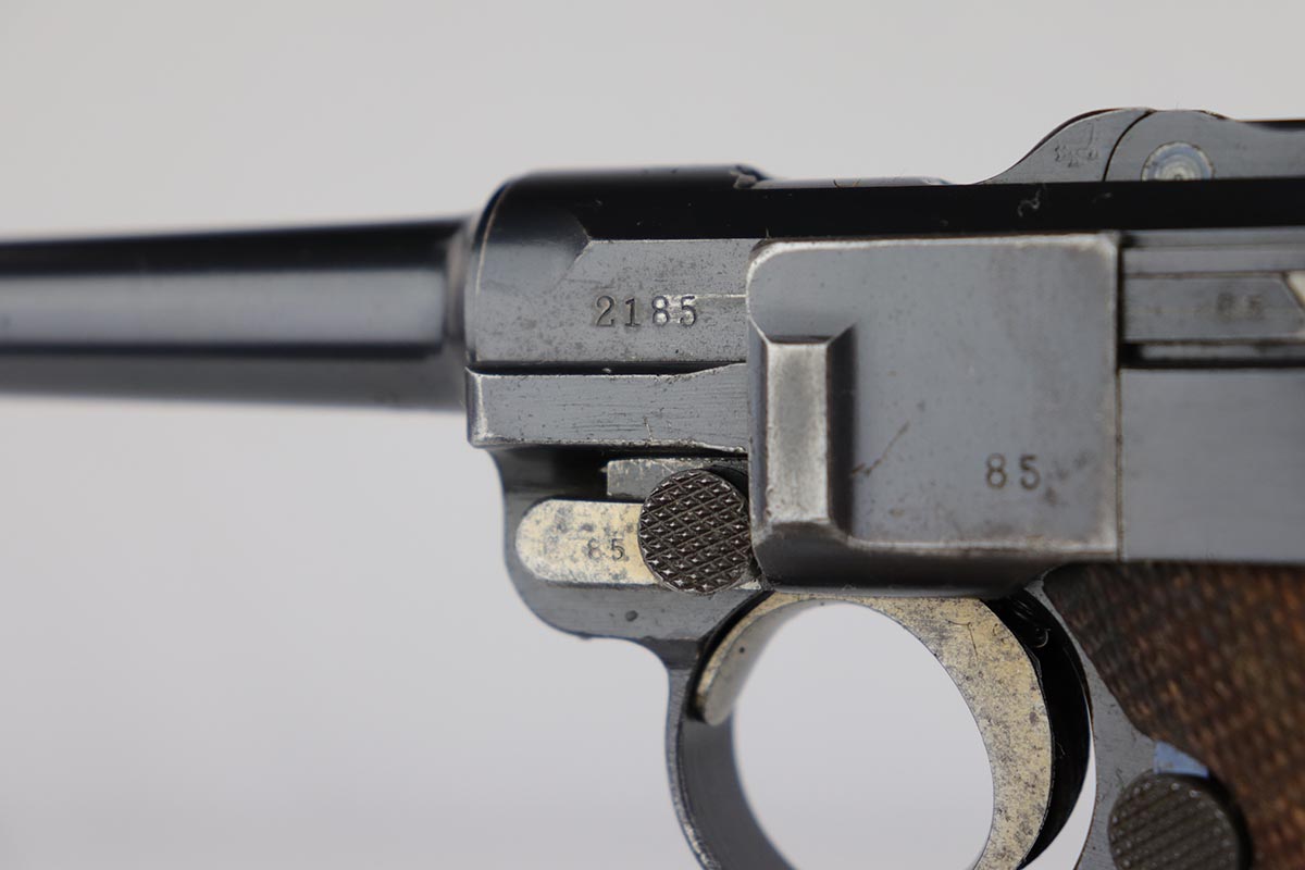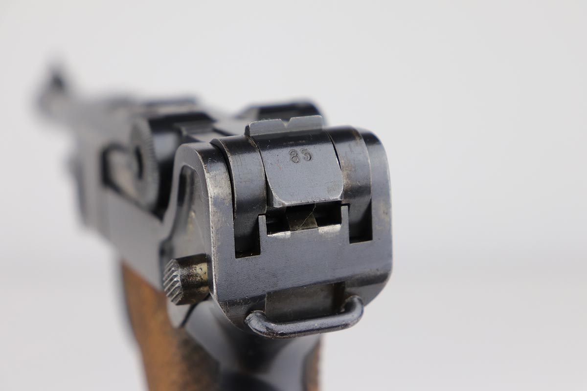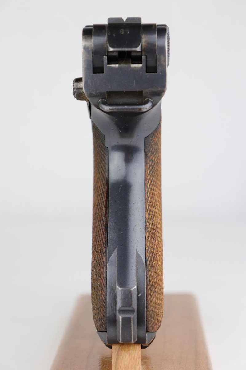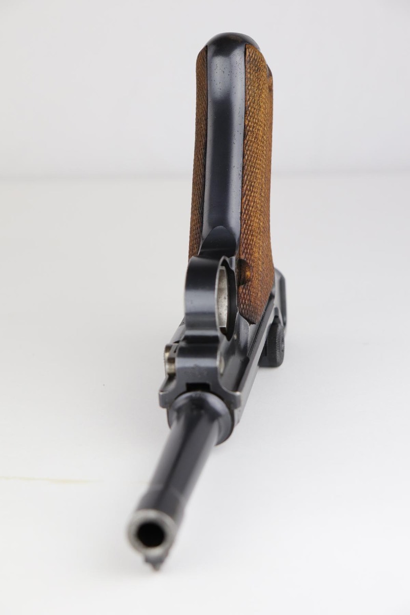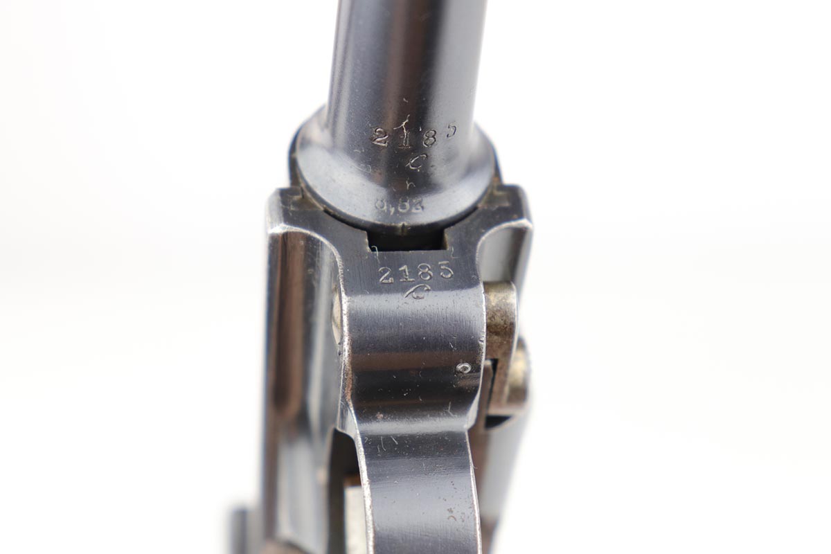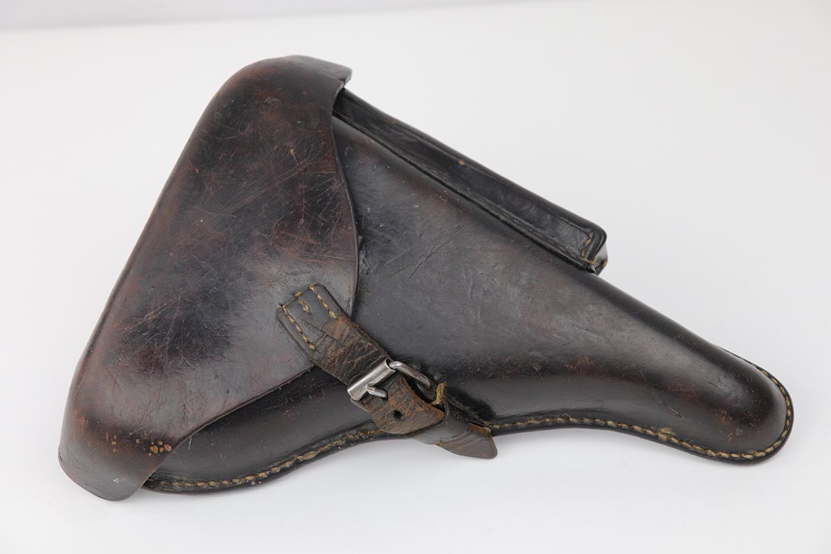 6/11/19 – This is an excellent DWM Luger from 1916, with spare magazine and 1916 dated holster. The pistol is all matching and original, including the grips but not the magazine. The bluing is in great condition, with minor holster wear on the sideplate and muzzle. Beautiful straps and minimal other bluing loss. Small parts retain about 50% original straw. The grips are in excellent condition, but both magazines have cracks in their bases. They are period original magazines but mismatched to this gun. Bore is shiny with strong rifling. The grouping is completed by an excellent, original holster. It is 1916 dated with G.A. Roever maker mark. It has some stitches missing in the top flap but nothing that affects the functionality.