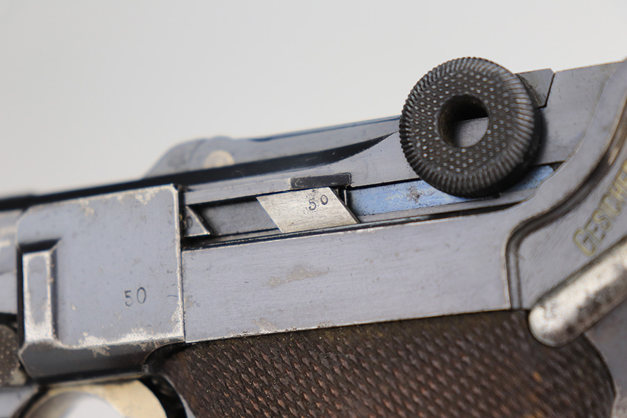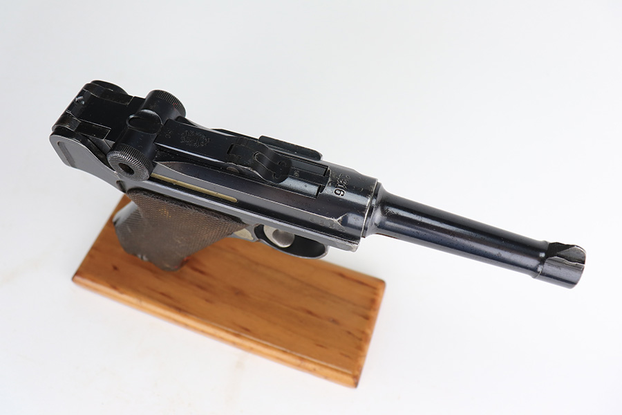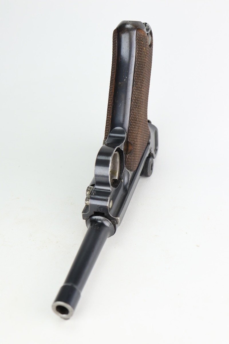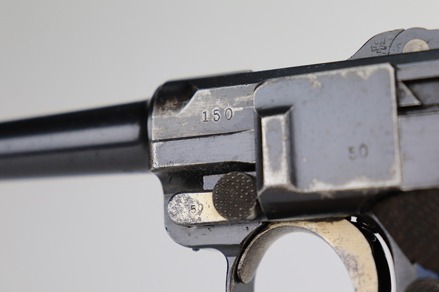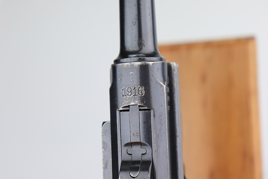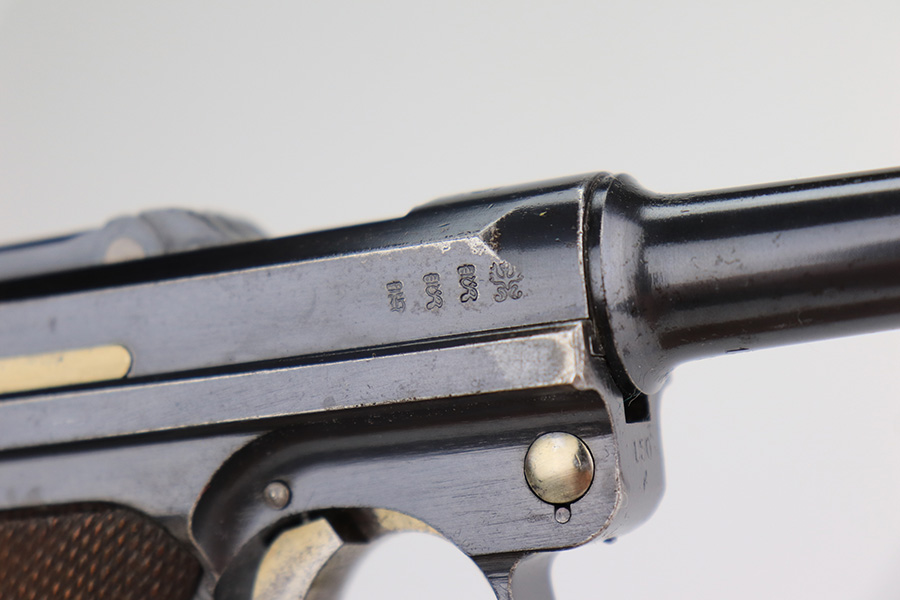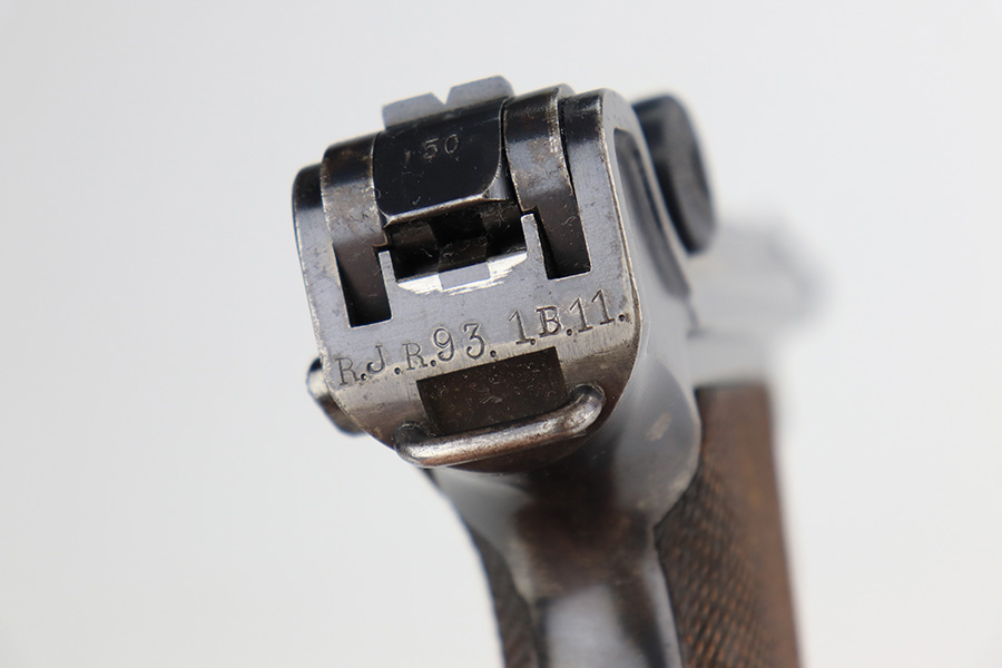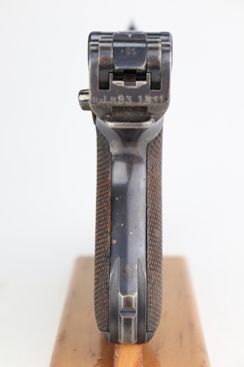 1/12/23 – This is a very nice example of a DWM Luger issued to the Imperial German military in 1916. It is all matching, has the proper Imperial military proofs, and has a “R.J.R,93. 1.B.11.” unit marking on the back of the frame. It has retained about 92-93% of its original finish. There are areas of light, somewhat spotty wear on the side plate, left side of the frame, and on the grip straps. Minor wear around the muzzle and on the high edges in general. Fitted with a very nice set of matching-numbered wood grips and comes with a period-correct un-numbered magazine. The bore has decent rifling, but there is minor pitting in the grooves.