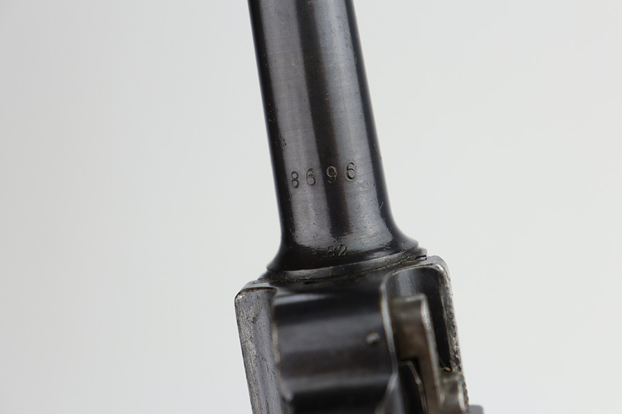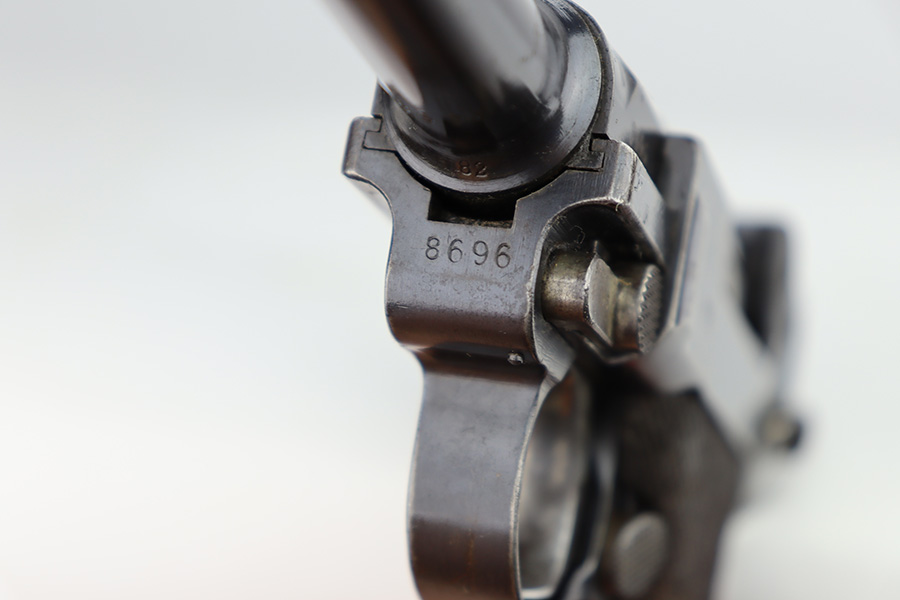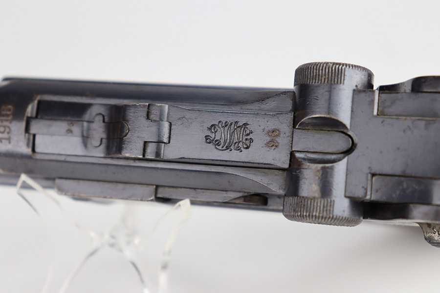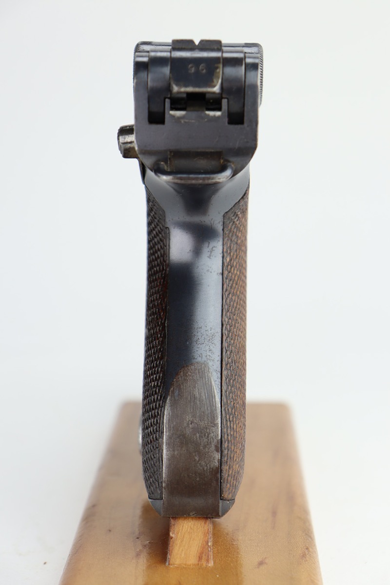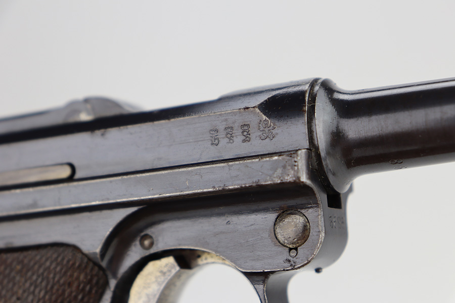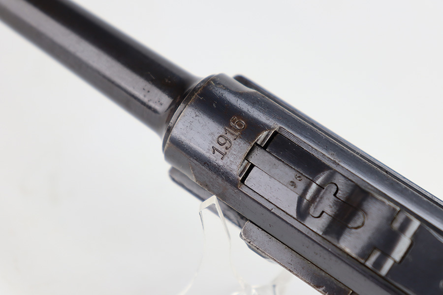 11/17/23 – This is a WW1 production Luger by DWM with some interesting history. Initially, this pistol was made for the German army in 1916. The finish is probably original but it may have been an arsenal refinish right after the war. The gun appears to be in all original condition except that the stock lug was ground off. Due to treaty obligations at the end of WW1, the Germans had to destroy, export or alter pistols to comply with new restrictions and regulations. The stock addition was viewed as a military threat and “upgrade” for the pistol, so the stock lug was ground off. There’s mild patina throughout, mostly light speckling wear, and high edge / handling wear. Around 92-94% overall condition. The bore rates 6/10 with strong rifling but some mild corrosion within the grooves. The grips fit well and seem original but not numbered to the gun. Comes with a WW2 era magazine.