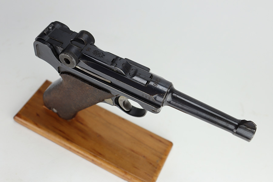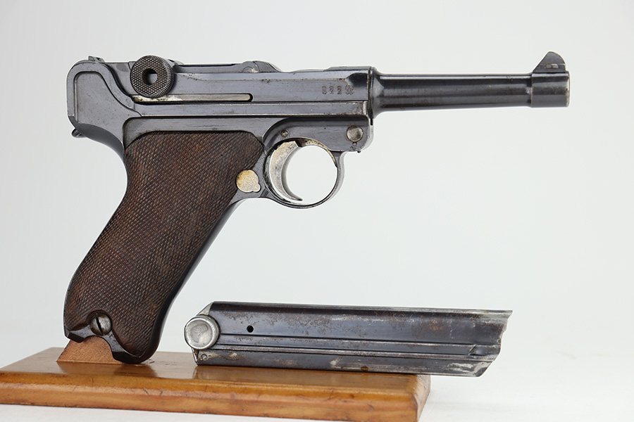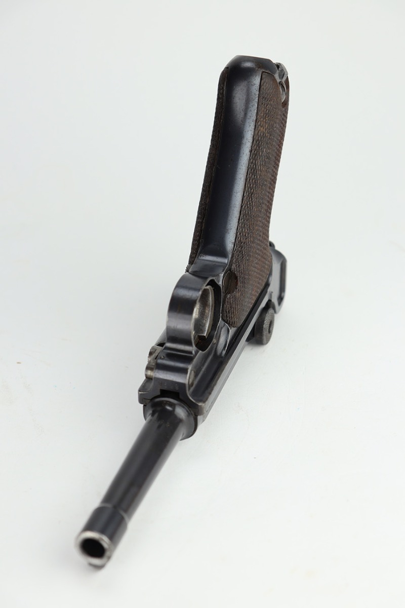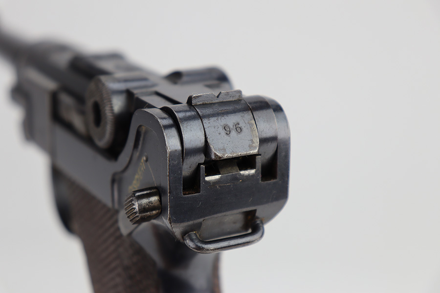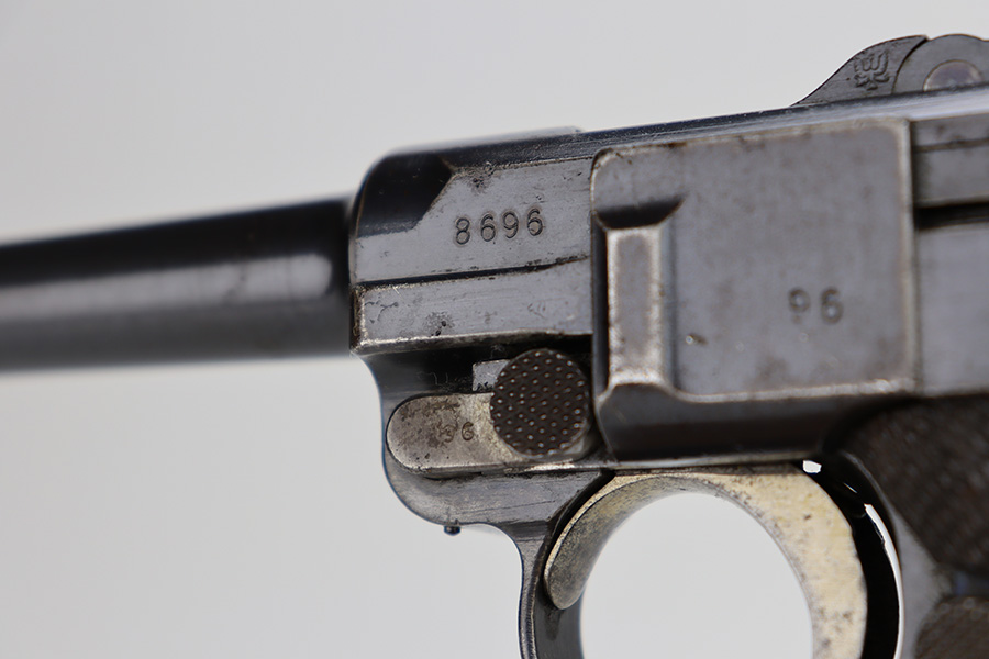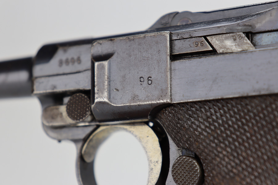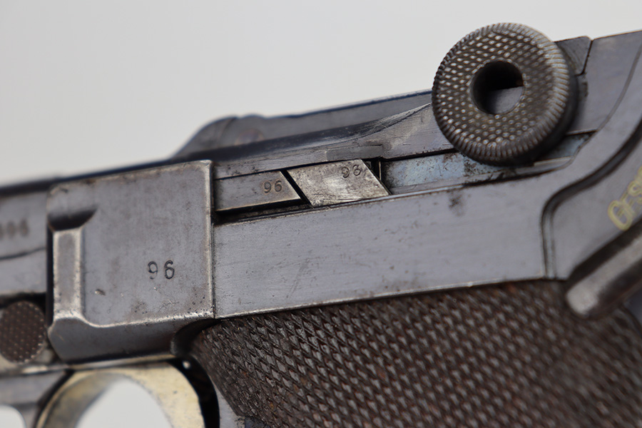 11/17/23 – This is a WW1 production Luger by DWM with some interesting history. Initially, this pistol was made for the German army in 1916. The finish is probably original but it may have been an arsenal refinish right after the war. The gun appears to be in all original condition except that the stock lug was ground off. Due to treaty obligations at the end of WW1, the Germans had to destroy, export or alter pistols to comply with new restrictions and regulations. The stock addition was viewed as a military threat and “upgrade” for the pistol, so the stock lug was ground off. There’s mild patina throughout, mostly light speckling wear, and high edge / handling wear. Around 92-94% overall condition. The bore rates 6/10 with strong rifling but some mild corrosion within the grooves. The grips fit well and seem original but not numbered to the gun. Comes with a WW2 era magazine.