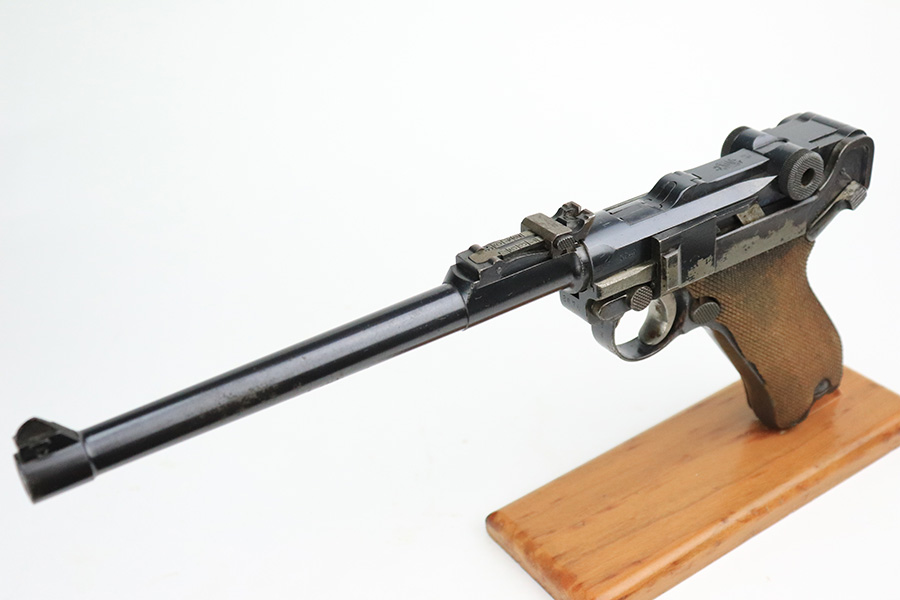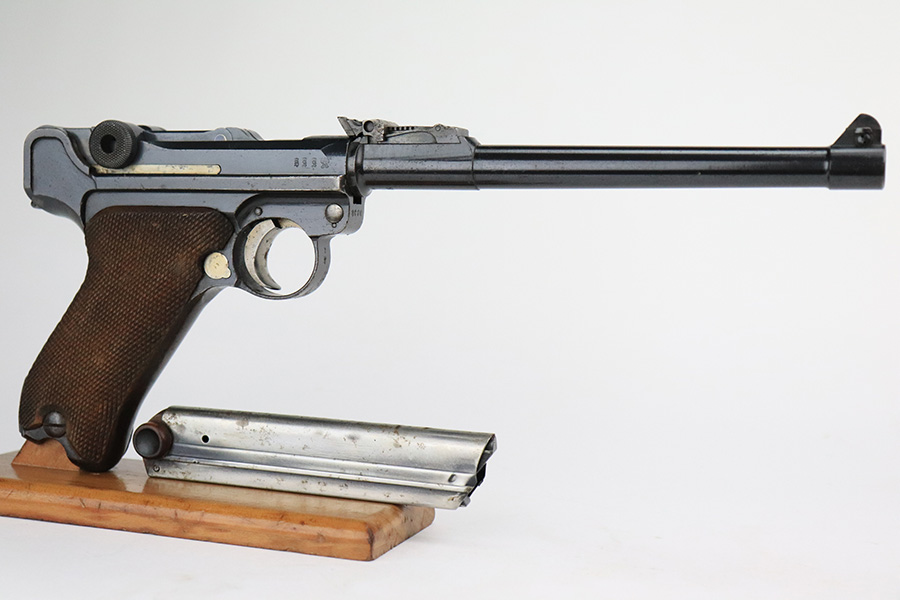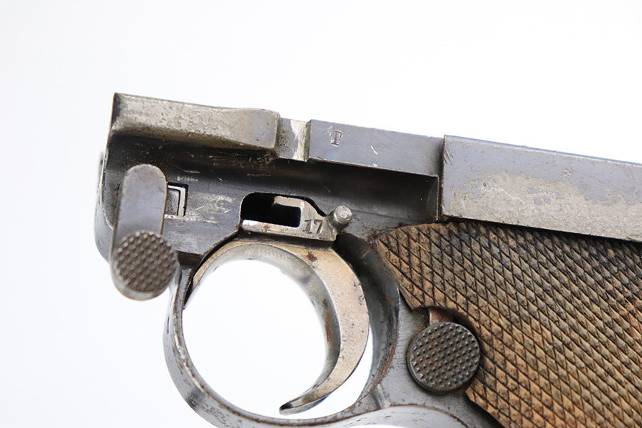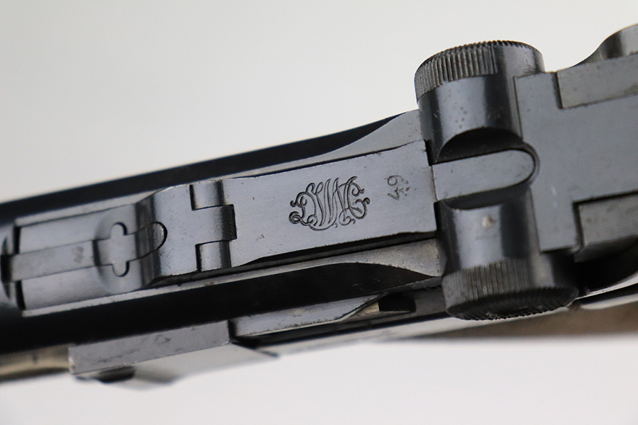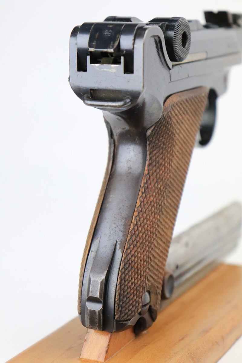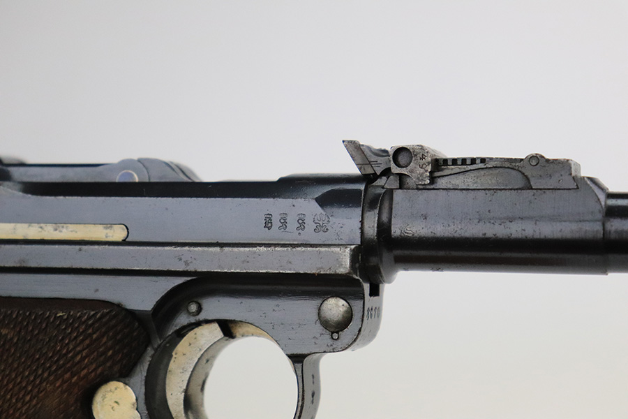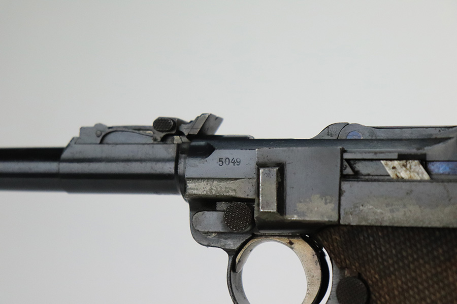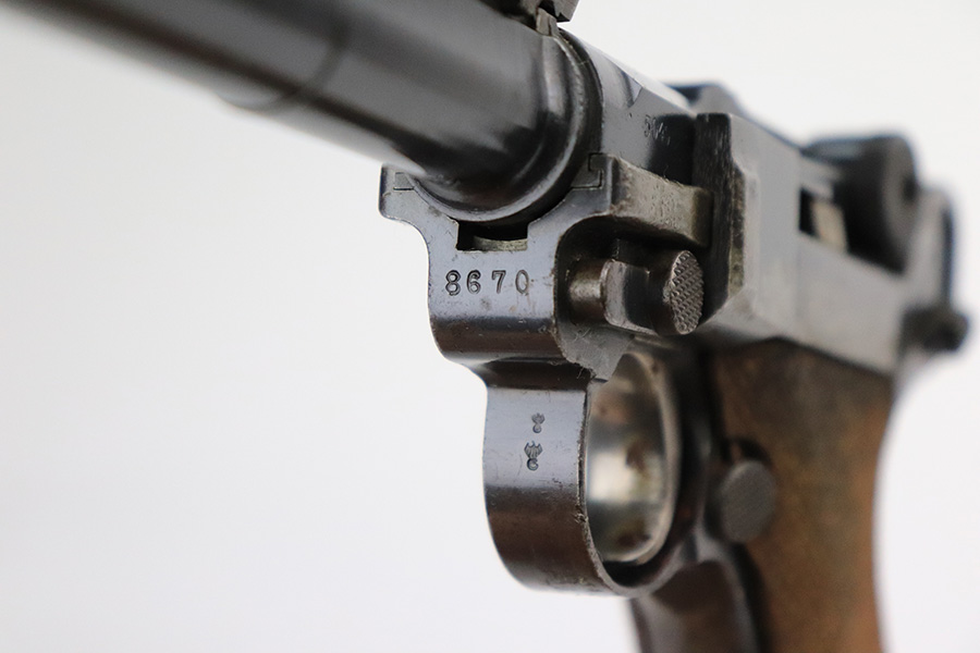 7/22/22 – This is a nice Artillery Luger that was put together from a 1916 DWM Artillery Luger upper and a 1920’s era Simson frame. The gun is almost entirely mismatched, has Imperial military proofs on the upper, and has Simson “Eagle 6” proofs on the frame. It has retained roughly 75% of its bluing. Most of the finish loss is on the left side of the frame and side plate, where the wear is spotty and there is some pitting as well. Minor pitting along the barrel. Thinning on the front strap and spotty oxidation on both grip straps. Comes with wood grips – the left panel is worn and mildly chipped along the edge. Also comes with an un-numbered wood-bottom magazine. The bore is excellent with great rifling. This gun would make a fantastic shooter.
