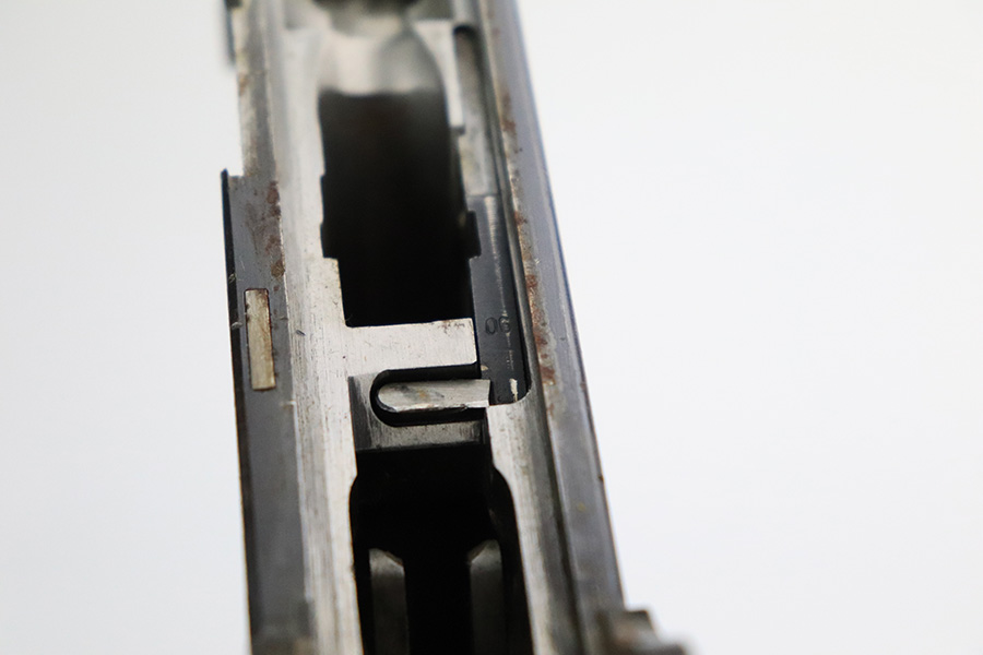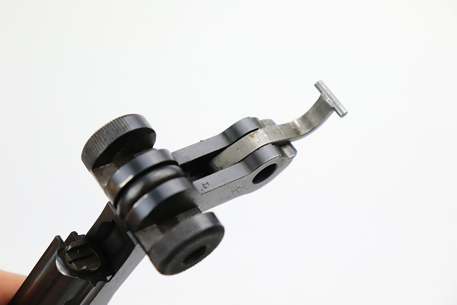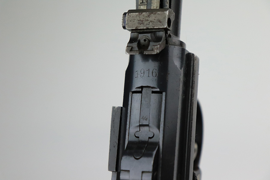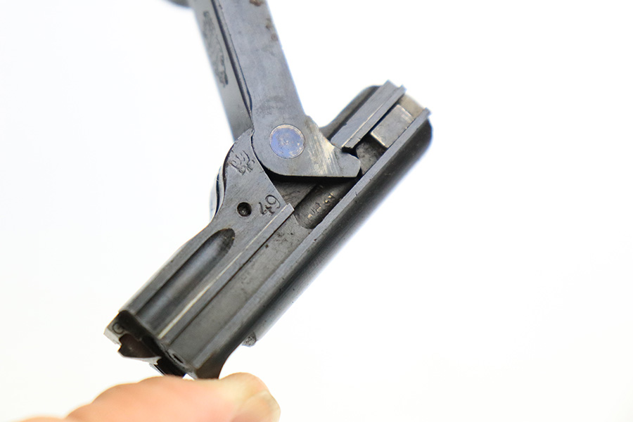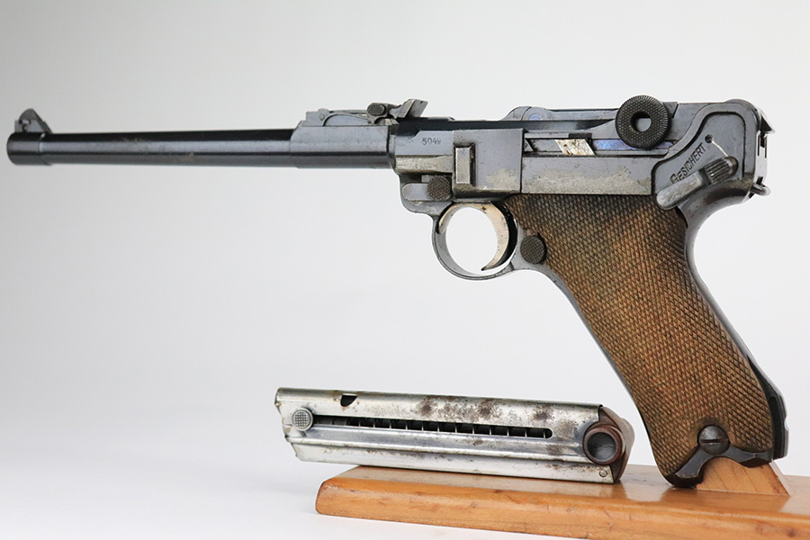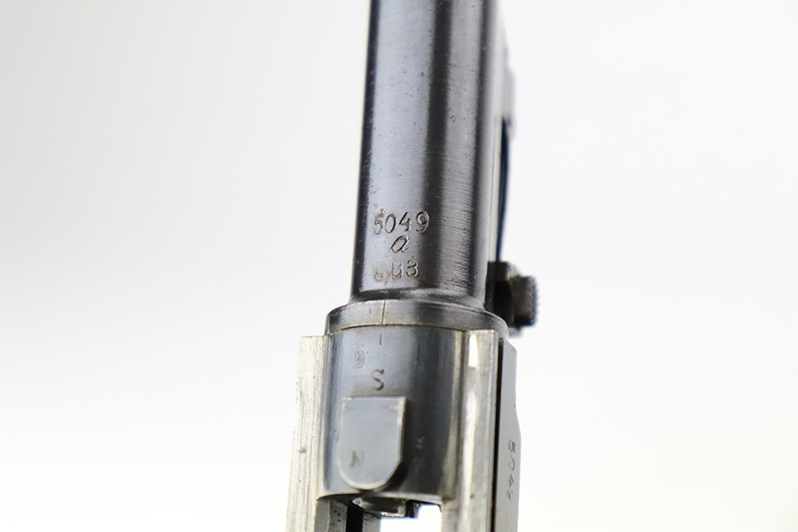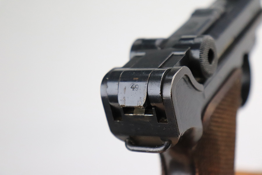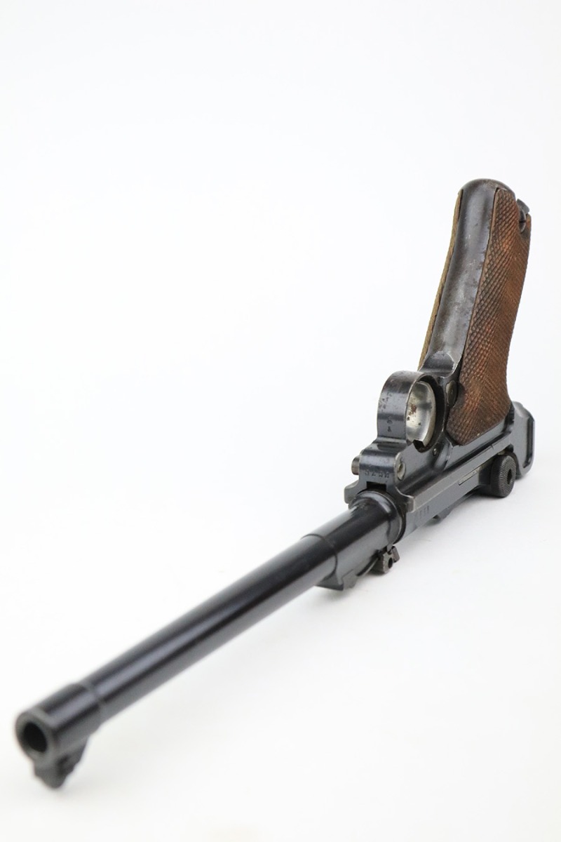7/22/22 – This is a nice Artillery Luger that was put together from a 1916 DWM Artillery Luger upper and a 1920’s era Simson frame. The gun is almost entirely mismatched, has Imperial military proofs on the upper, and has Simson “Eagle 6” proofs on the frame. It has retained roughly 75% of its bluing. Most of the finish loss is on the left side of the frame and side plate, where the wear is spotty and there is some pitting as well. Minor pitting along the barrel. Thinning on the front strap and spotty oxidation on both grip straps. Comes with wood grips – the left panel is worn and mildly chipped along the edge. Also comes with an un-numbered wood-bottom magazine. The bore is excellent with great rifling. This gun would make a fantastic shooter.