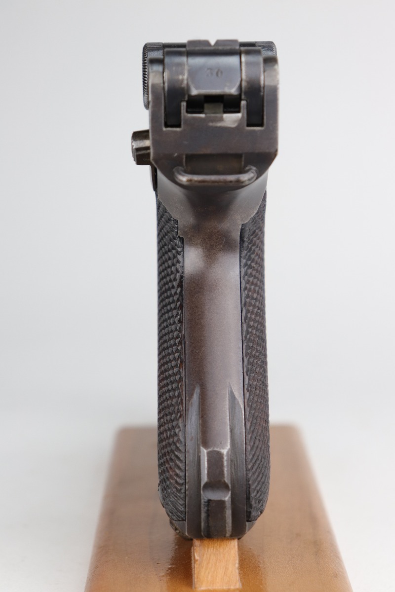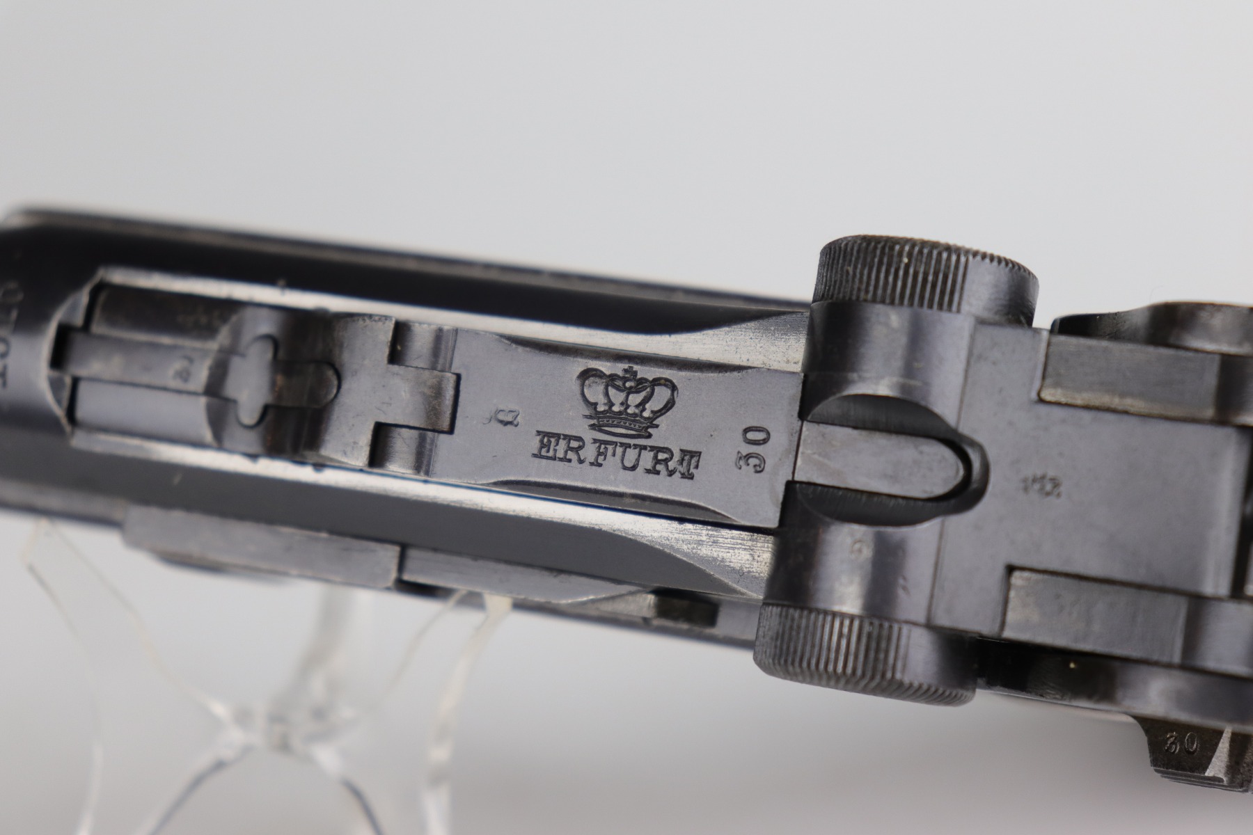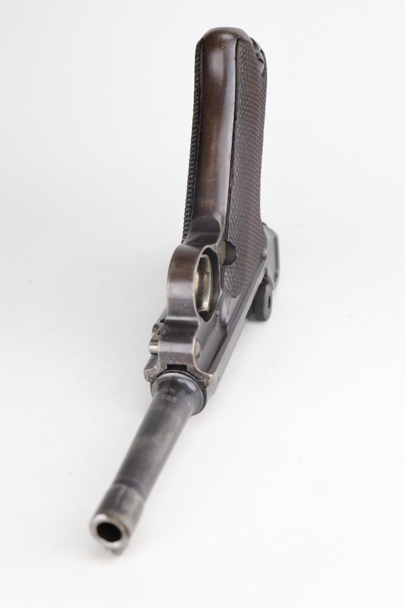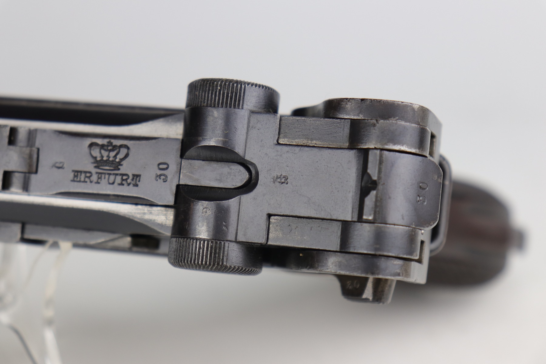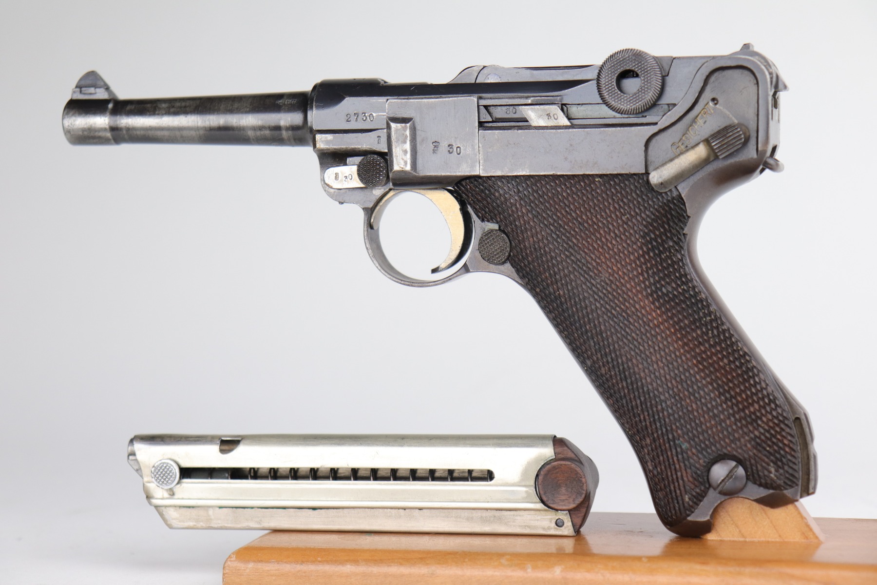 10/7/24 – This is a nice, honest example of an Erfurt Luger issued to the German Imperial Army in 1916. It is all matching and has the correct Imperial and Erfurt proofs. It has retained roughly 70% of its original bluing. Minor thinning and patina on the straps. There is spotty wear throughout, most noticeable on the barrel, side plate, and high edges of the frame. Straw finish is still visible on the small parts. Comes with excellent original grips. Both are Erfurt-proofed. One is matching, the other is un-numbered. It also comes with a period-correct magazine with an un-numbered wood bottom. The bore has good rifling with just minor patina.