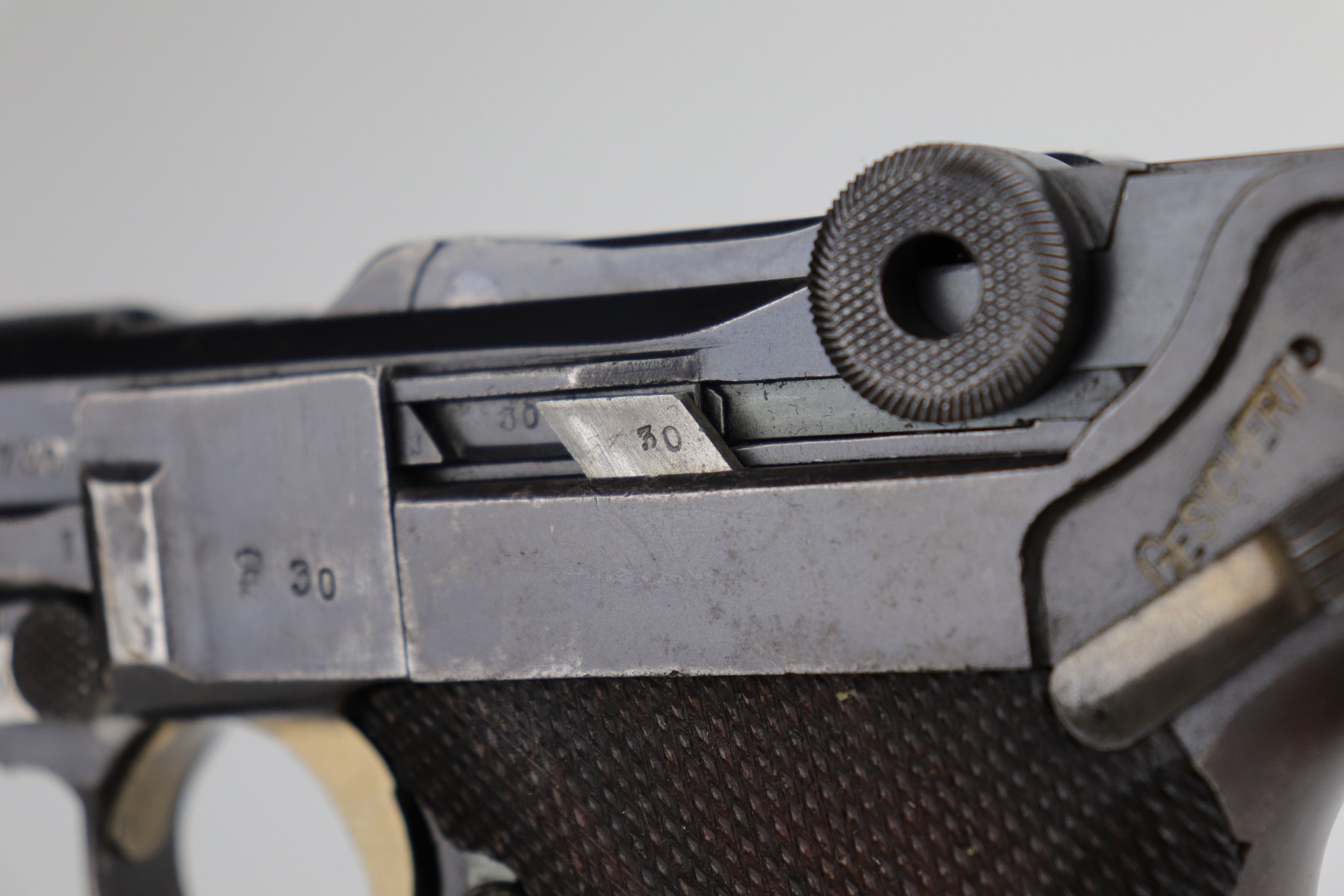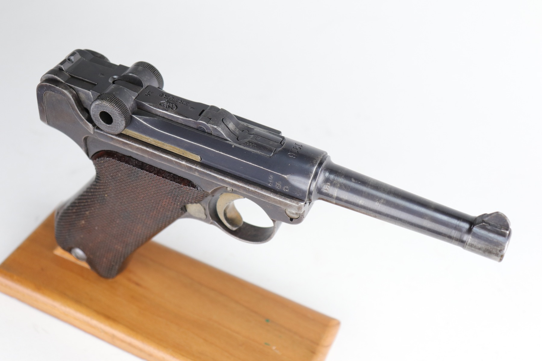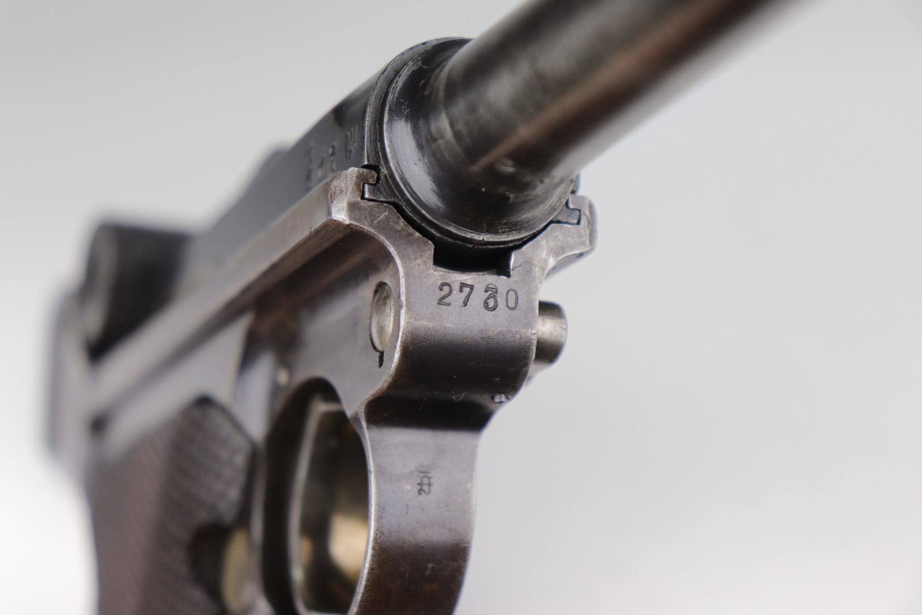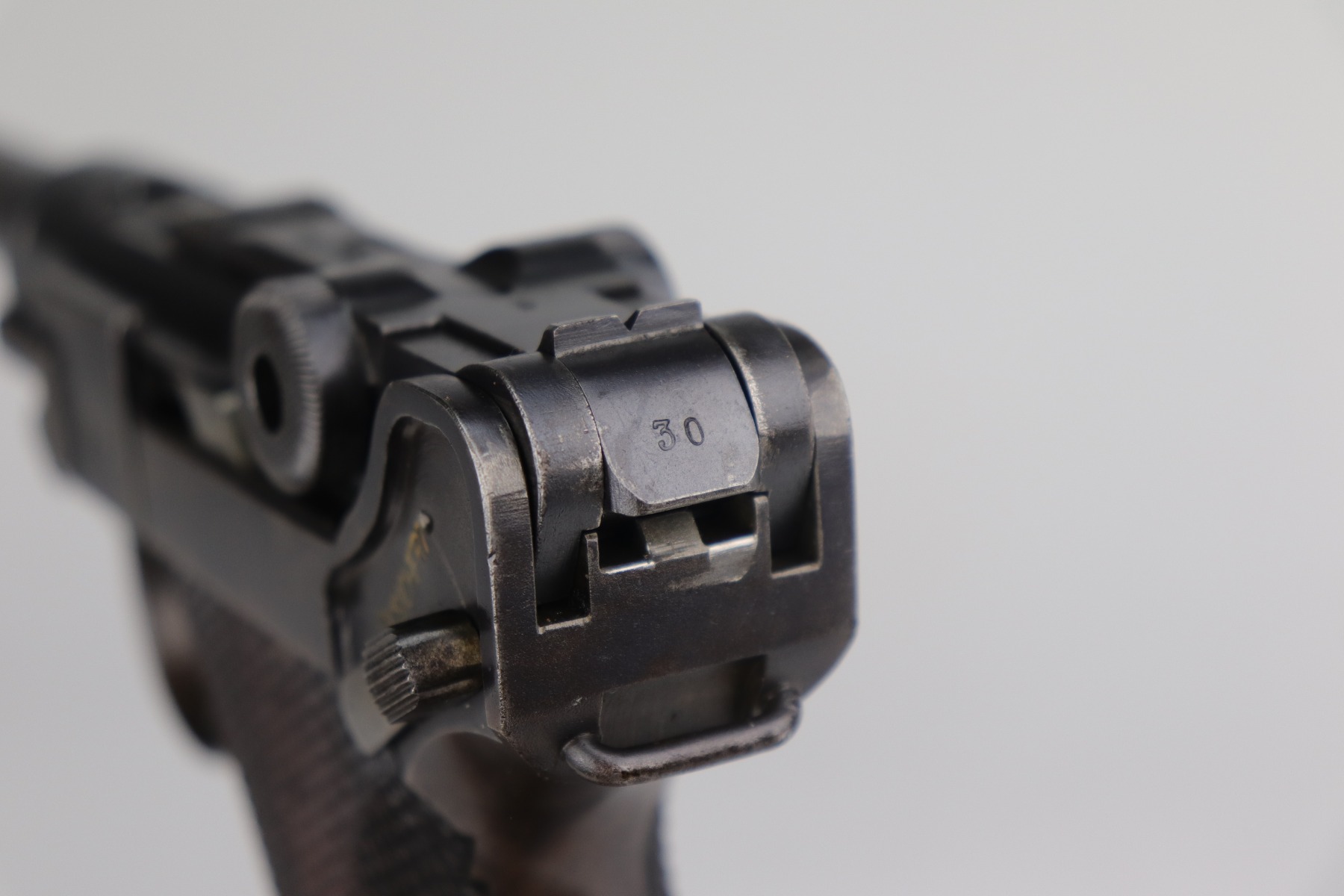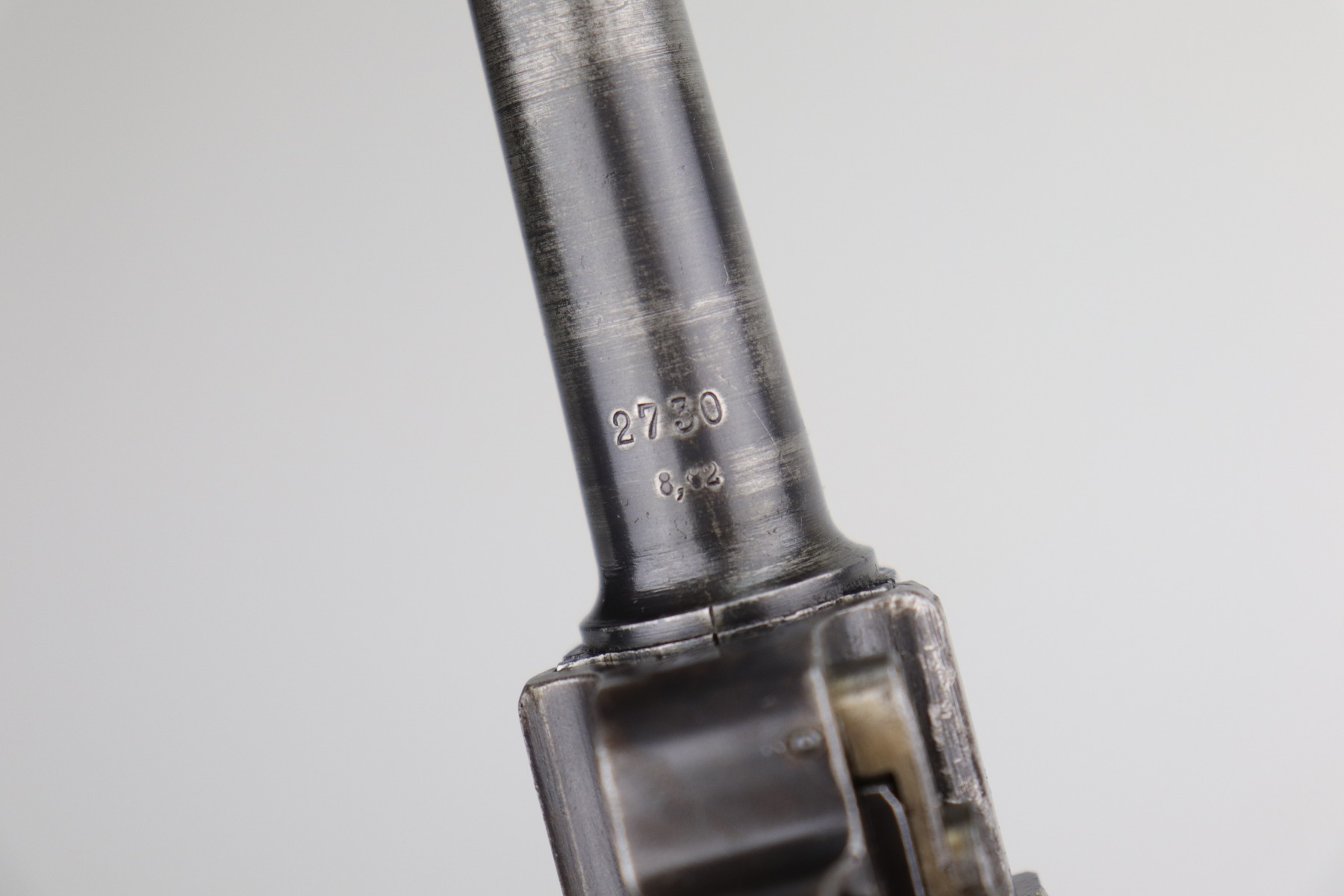 10/7/24 – This is a nice, honest example of an Erfurt Luger issued to the German Imperial Army in 1916. It is all matching and has the correct Imperial and Erfurt proofs. It has retained roughly 70% of its original bluing. Minor thinning and patina on the straps. There is spotty wear throughout, most noticeable on the barrel, side plate, and high edges of the frame. Straw finish is still visible on the small parts. Comes with excellent original grips. Both are Erfurt-proofed. One is matching, the other is un-numbered. It also comes with a period-correct magazine with an un-numbered wood bottom. The bore has good rifling with just minor patina.