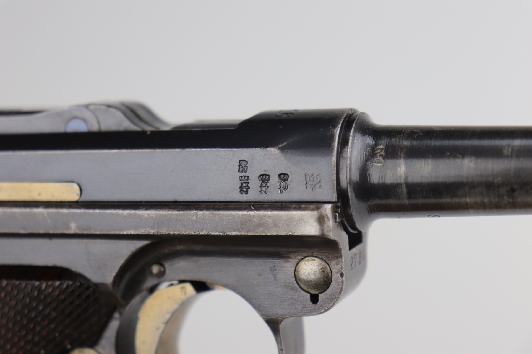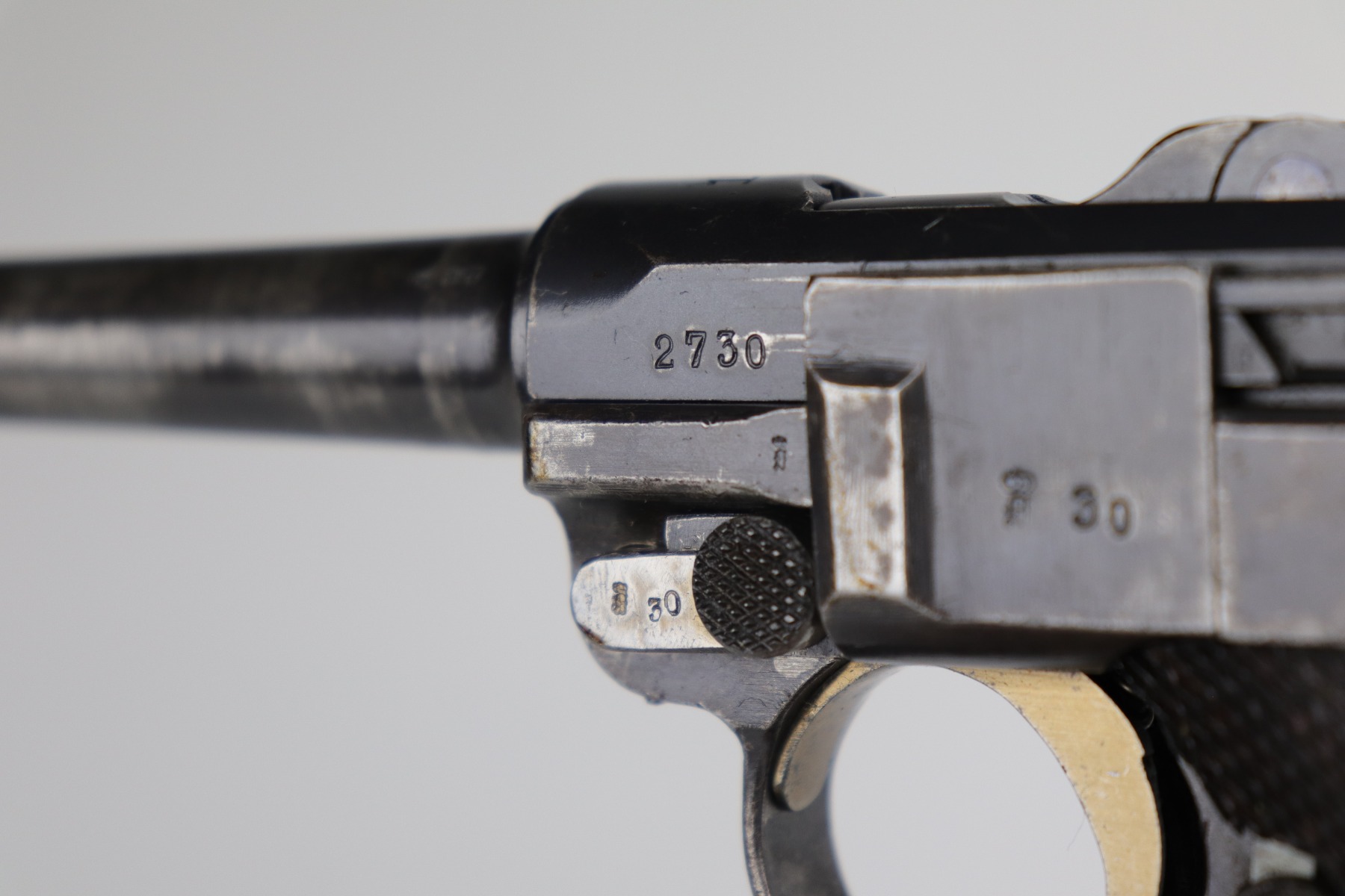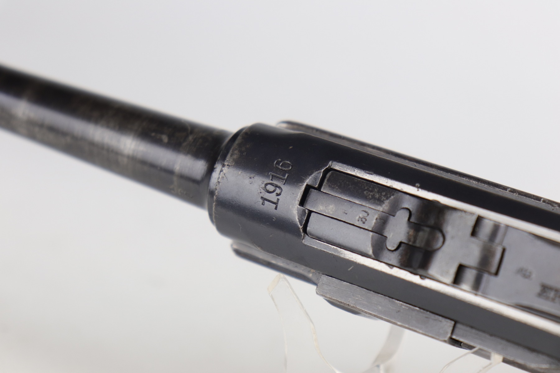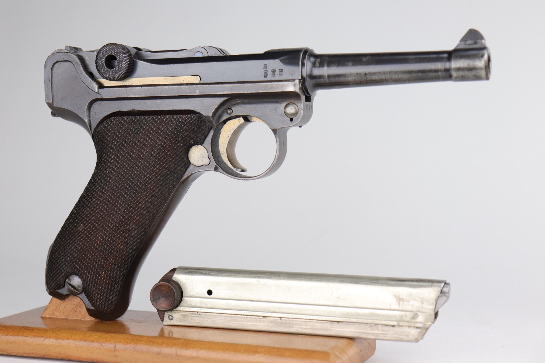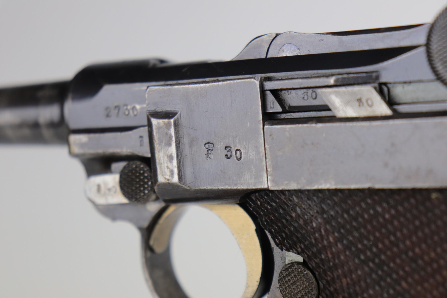 10/7/24 – This is a nice, honest example of an Erfurt Luger issued to the German Imperial Army in 1916. It is all matching and has the correct Imperial and Erfurt proofs. It has retained roughly 70% of its original bluing. Minor thinning and patina on the straps. There is spotty wear throughout, most noticeable on the barrel, side plate, and high edges of the frame. Straw finish is still visible on the small parts. Comes with excellent original grips. Both are Erfurt-proofed. One is matching, the other is un-numbered. It also comes with a period-correct magazine with an un-numbered wood bottom. The bore has good rifling with just minor patina.