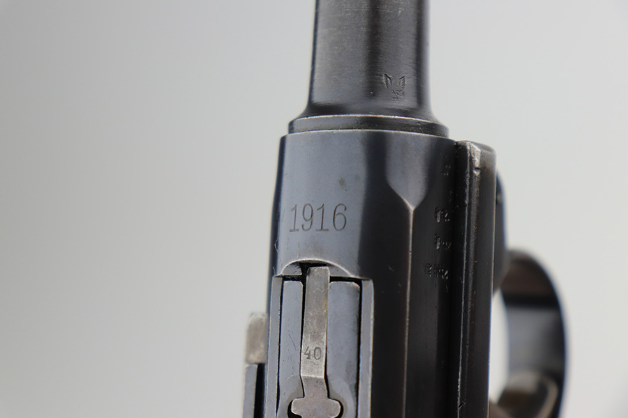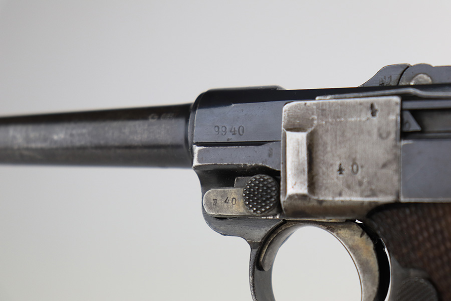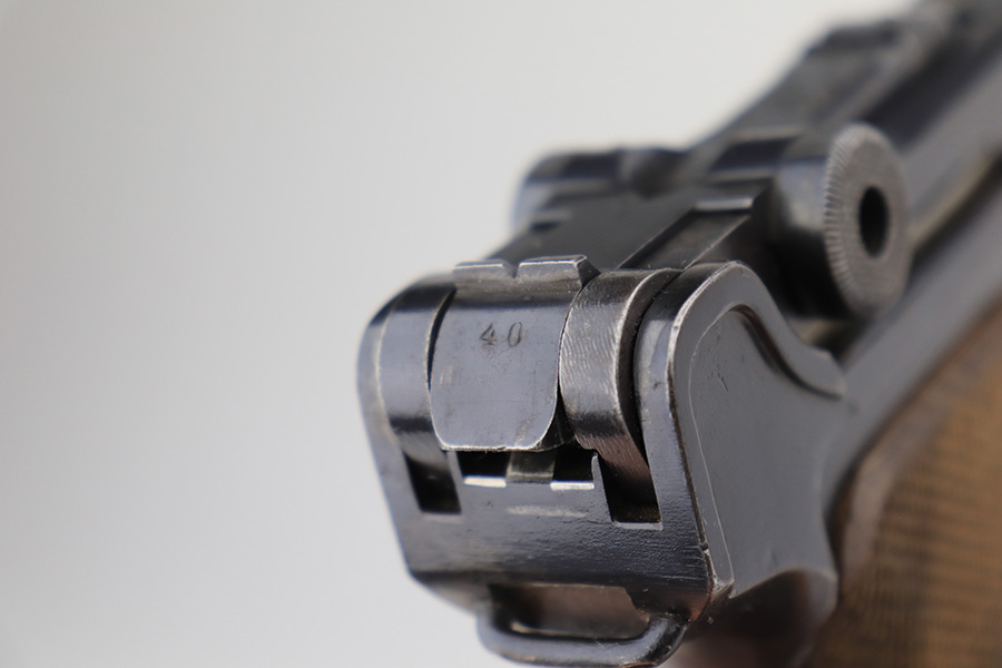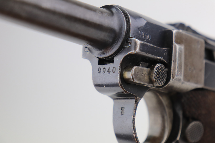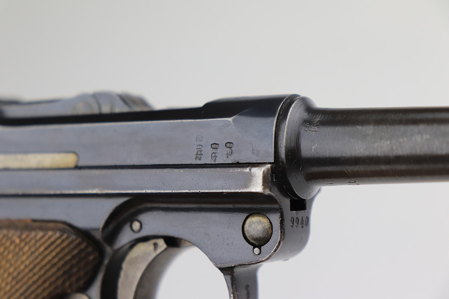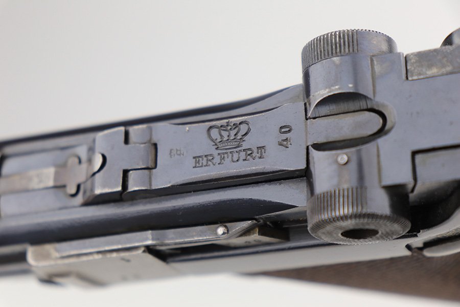 3/1/22 – This is a nice example of an Erfurt Luger manufactured in 1916. It was initially issued to the Imperial German military, as evidenced by the Imperial proofs on the right side of the slide. It was later reworked and issued to the German police, as evidenced by the added police sear safety and added matching-numbered Haenel police magazine. The gun is all matching and has the proper Erfurt markings throughout. It has retained roughly 65% of its finish. The majority of the finish loss is on both grips straps and on the side plate, where there is also spotty oxidation. There is also minor muzzle wear, very minor wear on the side rails, and minor thinning on the barrel. The left grip is marked “S/42” and the right grip panel is blank. The bore has decent rifling, but there is very minor pin-pricking throughout and some tiny pits here and there.