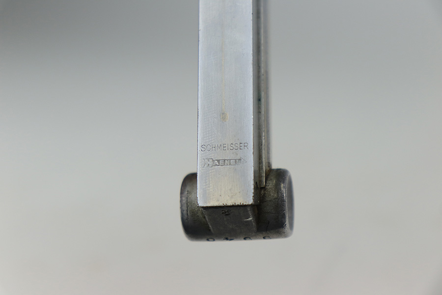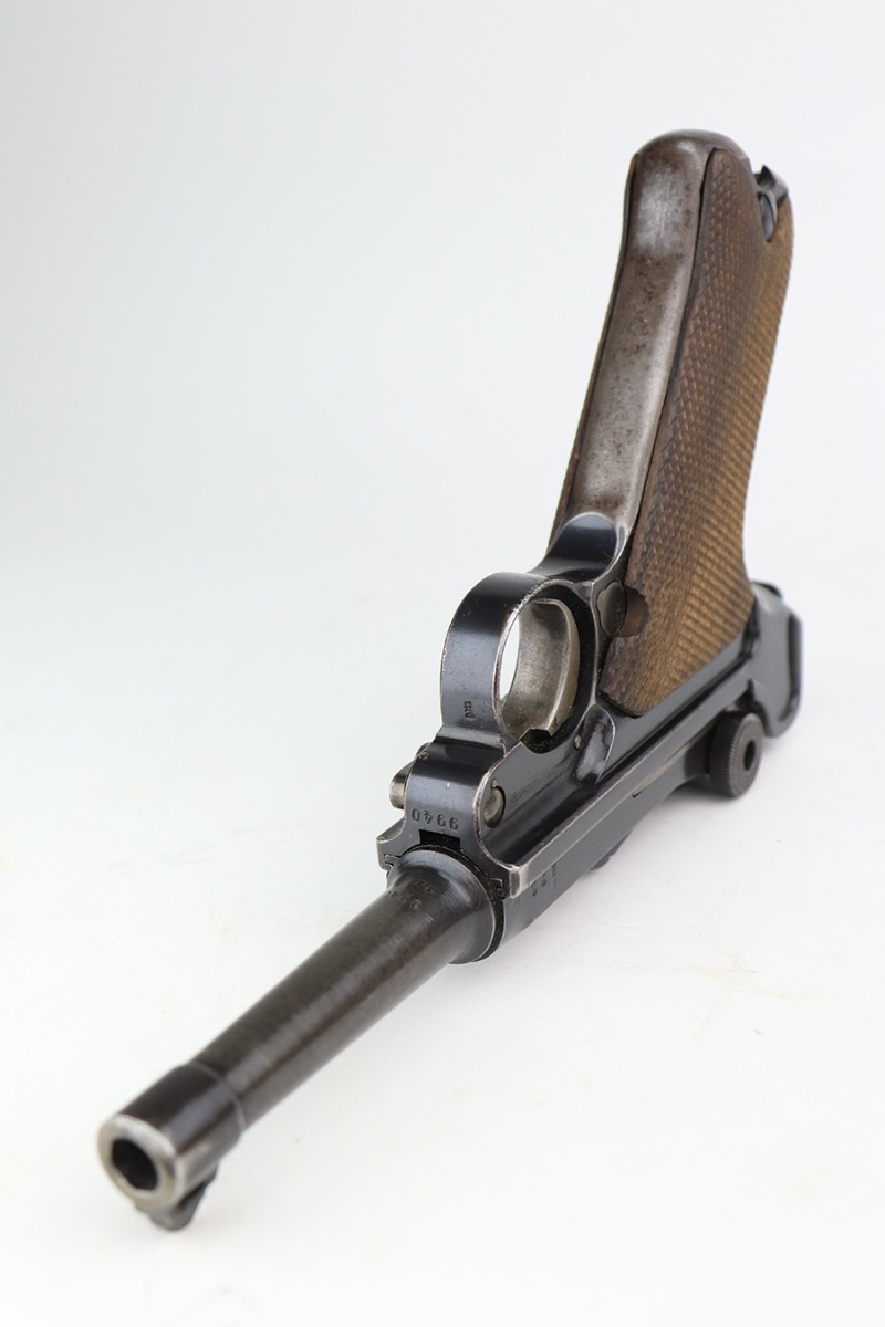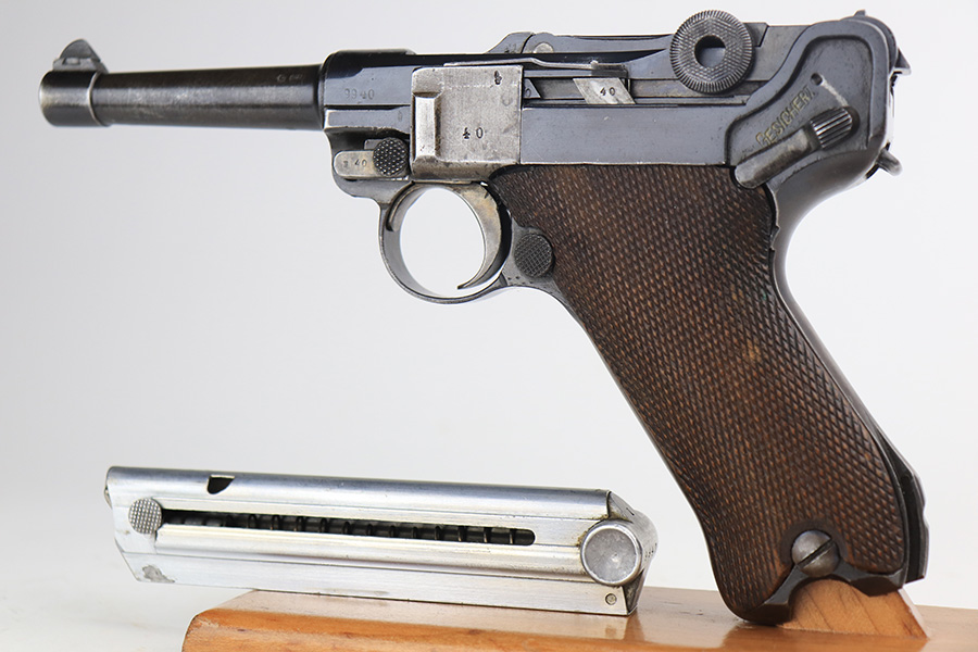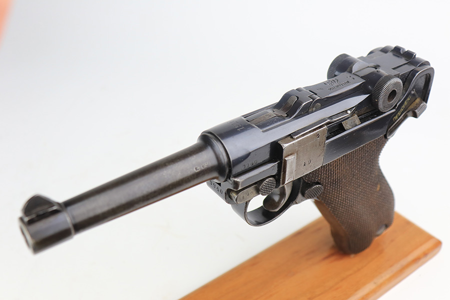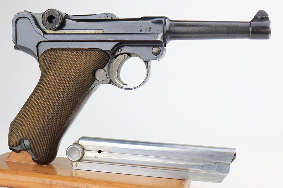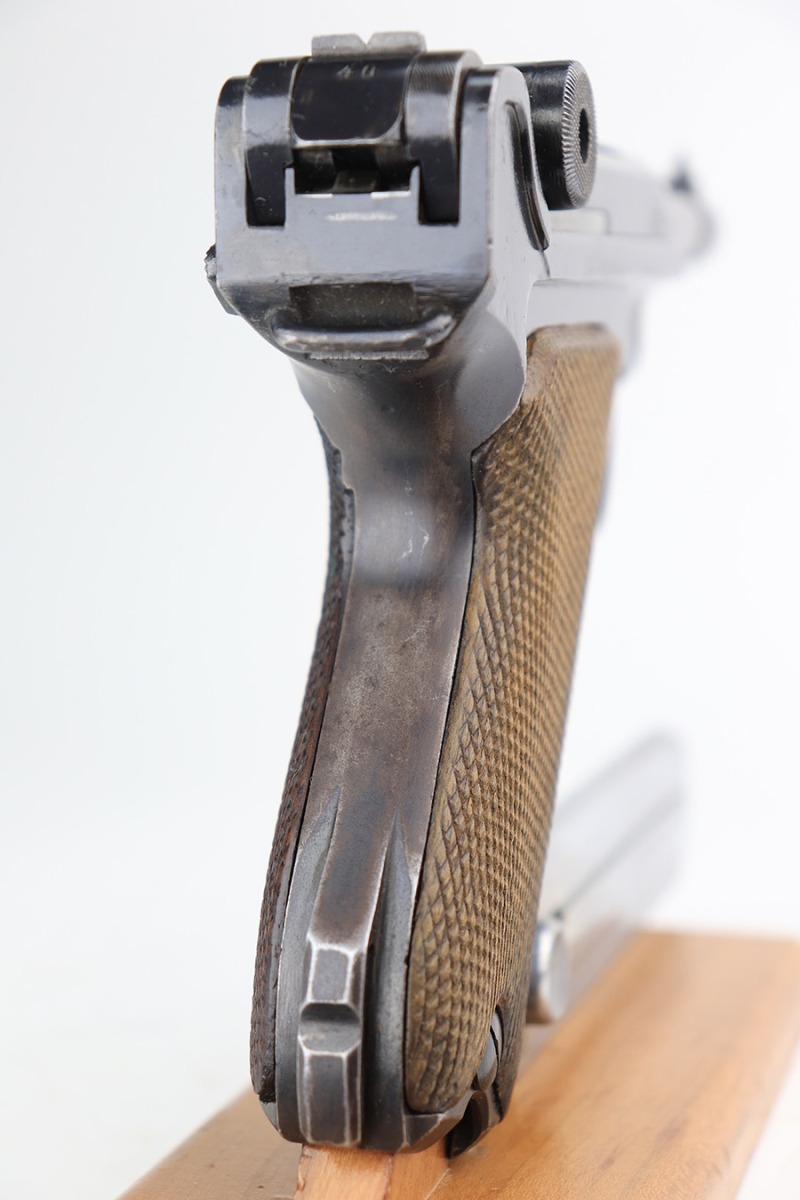 3/1/22 – This is a nice example of an Erfurt Luger manufactured in 1916. It was initially issued to the Imperial German military, as evidenced by the Imperial proofs on the right side of the slide. It was later reworked and issued to the German police, as evidenced by the added police sear safety and added matching-numbered Haenel police magazine. The gun is all matching and has the proper Erfurt markings throughout. It has retained roughly 65% of its finish. The majority of the finish loss is on both grips straps and on the side plate, where there is also spotty oxidation. There is also minor muzzle wear, very minor wear on the side rails, and minor thinning on the barrel. The left grip is marked “S/42” and the right grip panel is blank. The bore has decent rifling, but there is very minor pin-pricking throughout and some tiny pits here and there.