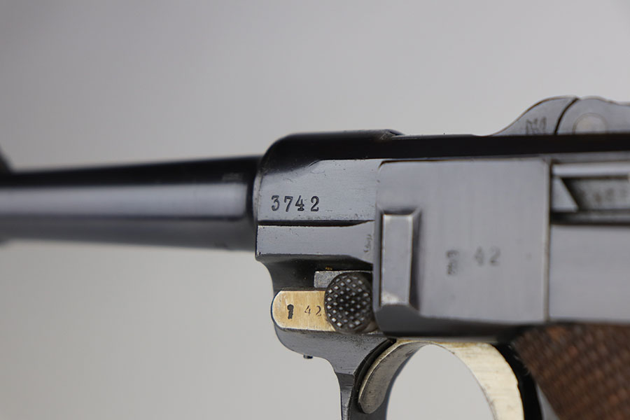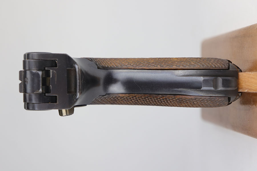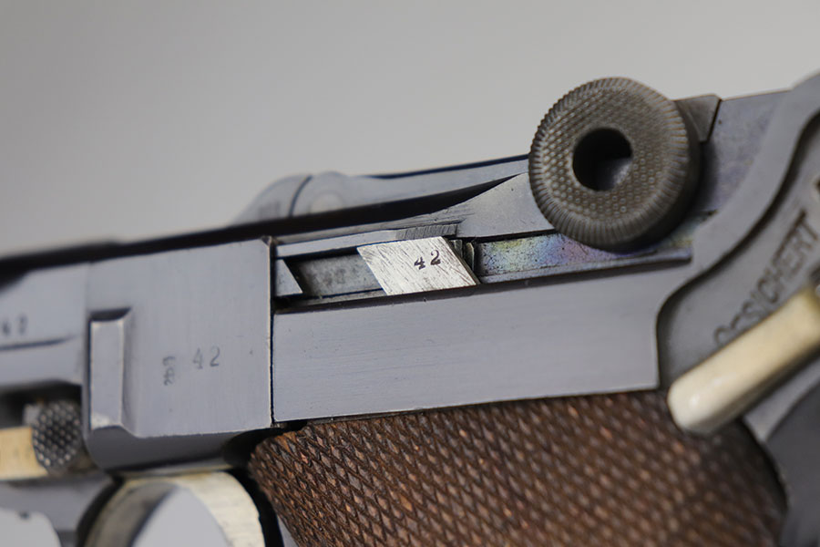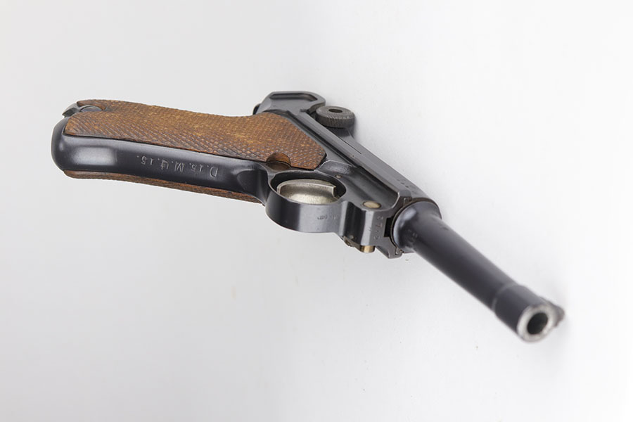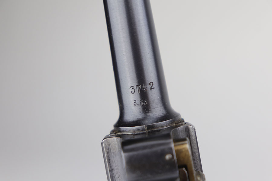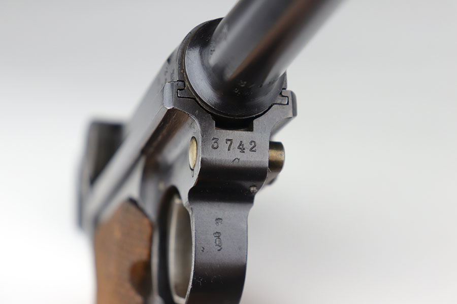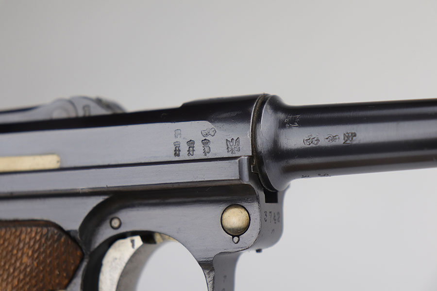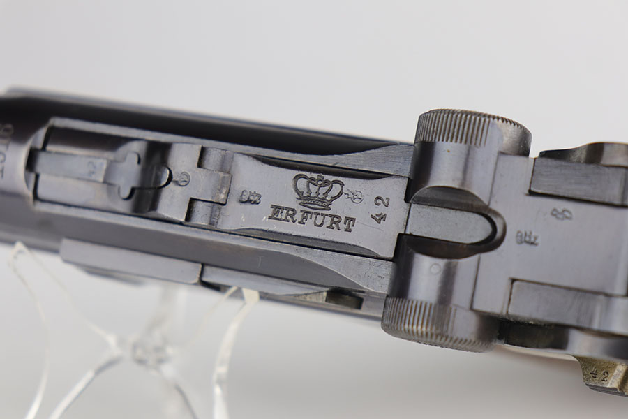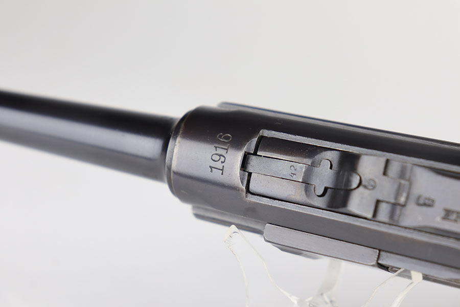8/14/20 – This is a beautiful looking military Erfurt Luger rig from 1916. The bluing rates at 98-99% but this pistol does have various additional commercial proofs on it and we believe the finish was restored when it was sold commercially. Unsure the meaning or origin of the proofs but could be British. The pistol has military acceptance stamps on the receiver and front strap is unit marked “D.15.M.G.13” which indicates it went to a machine gun unit. The original matching grips are present and in excellent shape. The rig includes two period original magazines with wood bottom, but both are mismatched to the gun. Unfortunately, the bore on this one is notably pitted throughout. An original imperial tool is included with the rig, and it’s completed by an original 1916 dated holster. The holster body is in good condition but the top flap shows a good amount of cracking and wear.