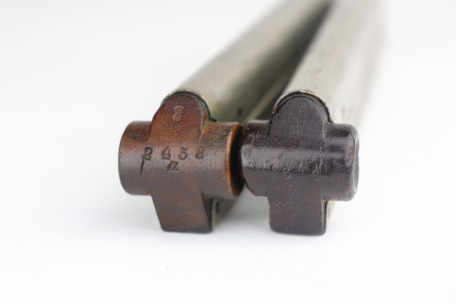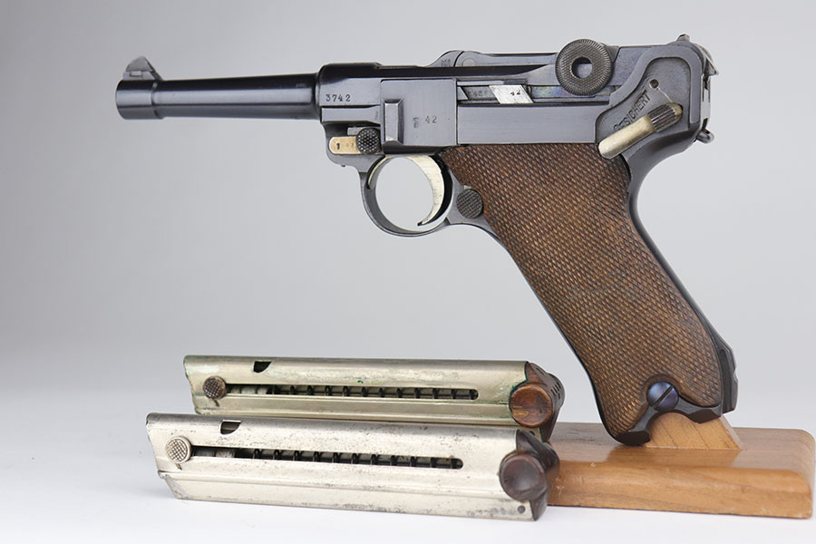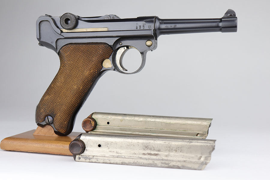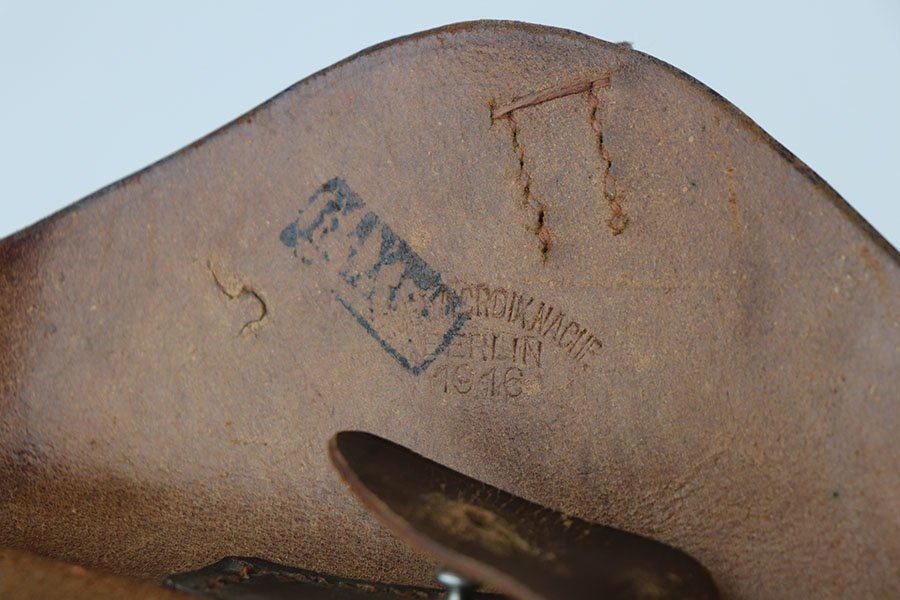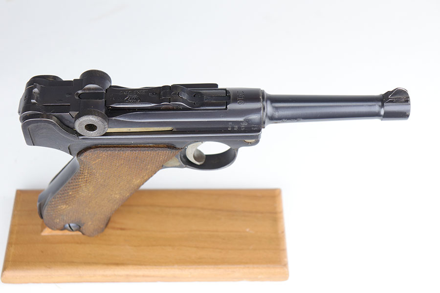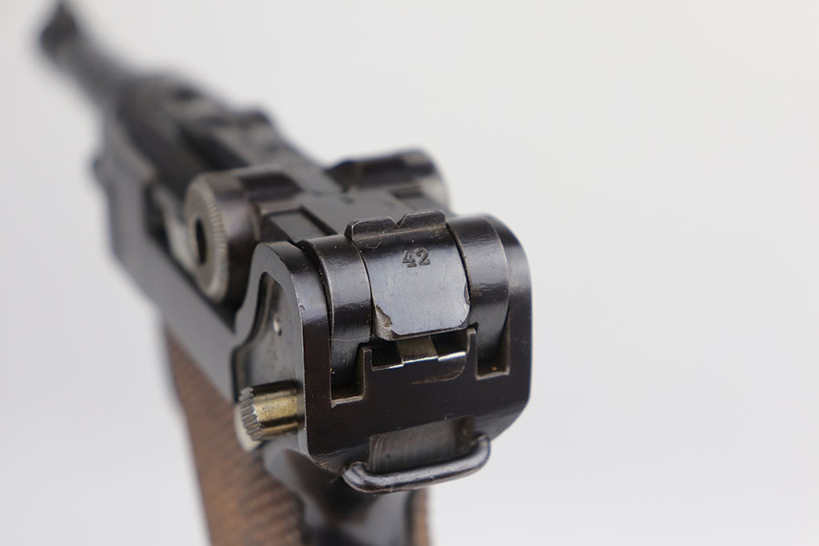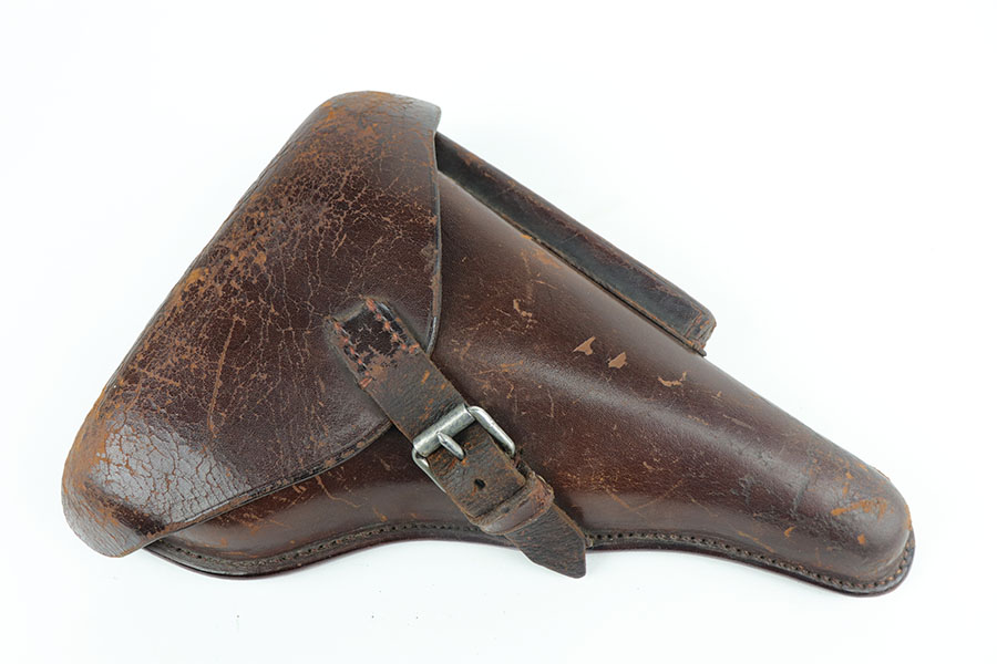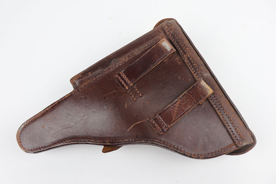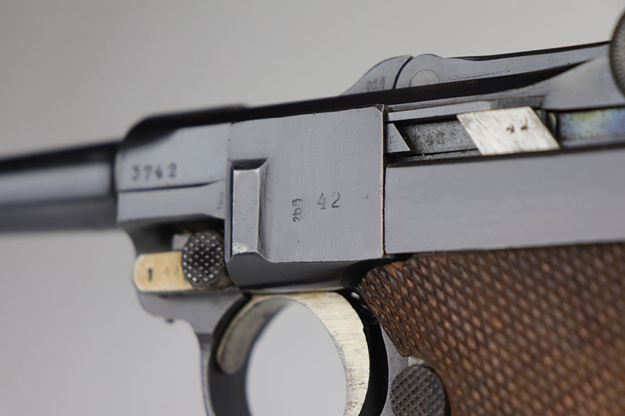 8/14/20 – This is a beautiful looking military Erfurt Luger rig from 1916. The bluing rates at 98-99% but this pistol does have various additional commercial proofs on it and we believe the finish was restored when it was sold commercially. Unsure the meaning or origin of the proofs but could be British. The pistol has military acceptance stamps on the receiver and front strap is unit marked “D.15.M.G.13” which indicates it went to a machine gun unit. The original matching grips are present and in excellent shape. The rig includes two period original magazines with wood bottom, but both are mismatched to the gun. Unfortunately, the bore on this one is notably pitted throughout. An original imperial tool is included with the rig, and it’s completed by an original 1916 dated holster. The holster body is in good condition but the top flap shows a good amount of cracking and wear.