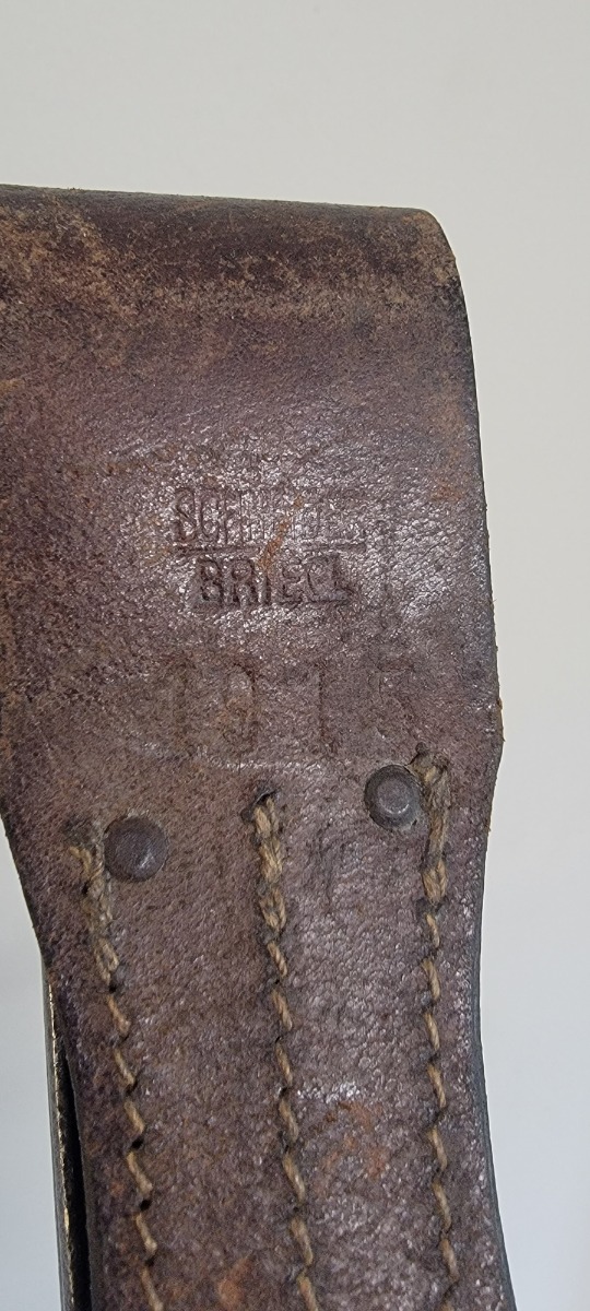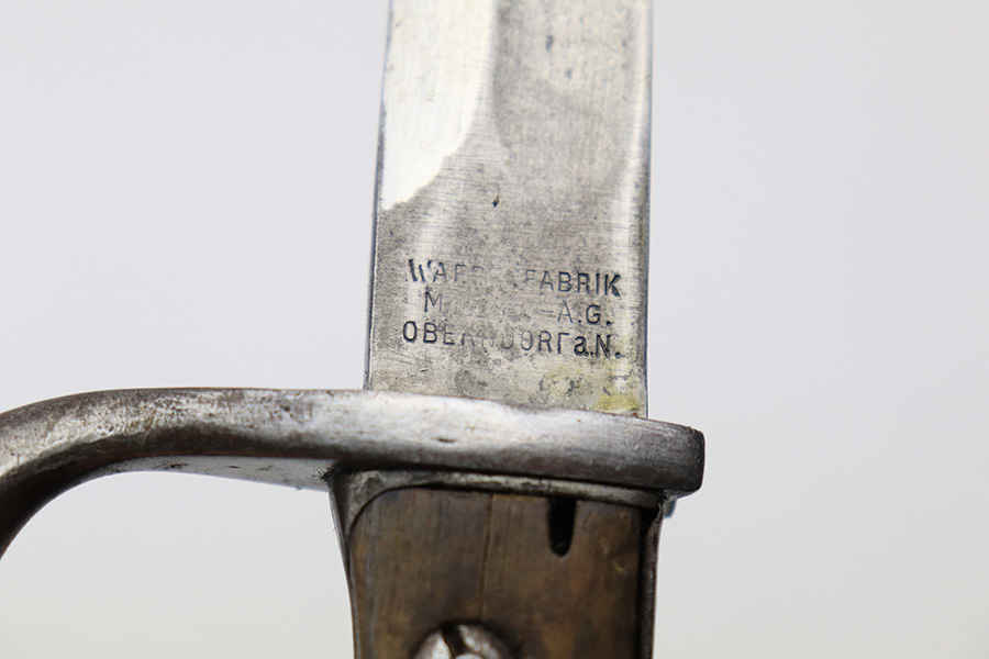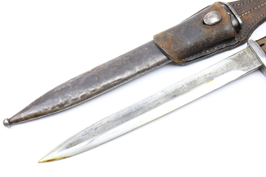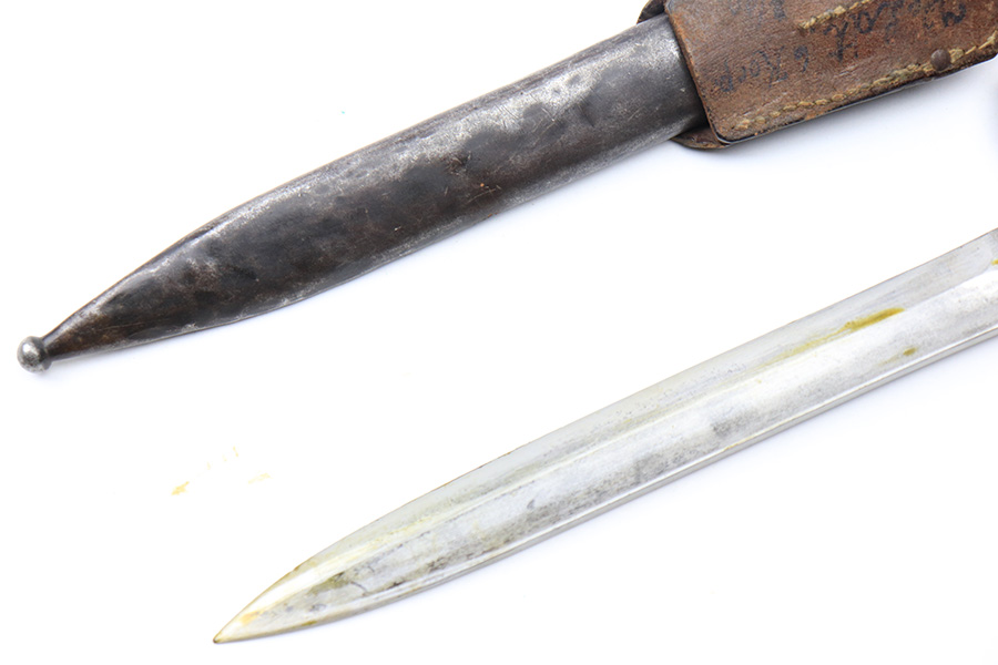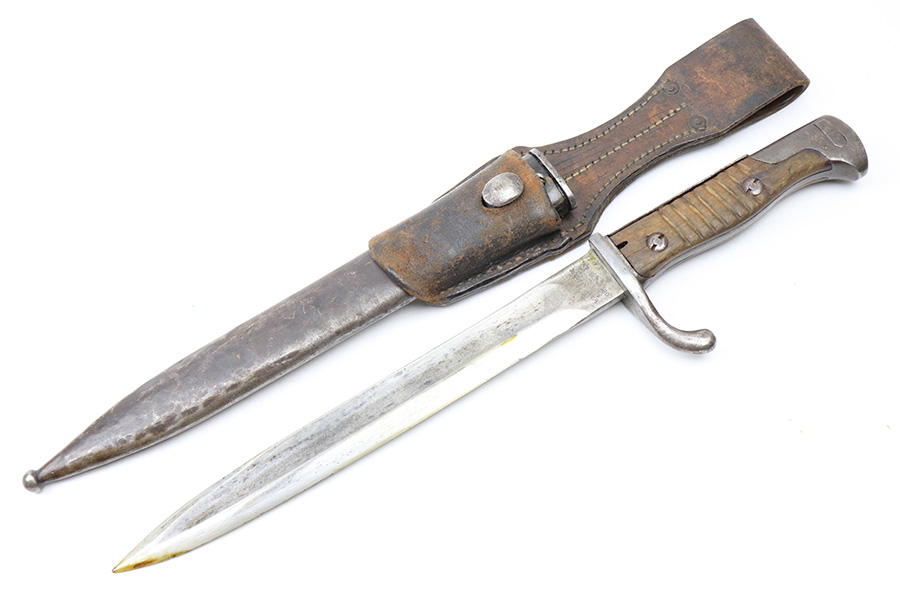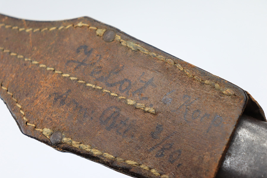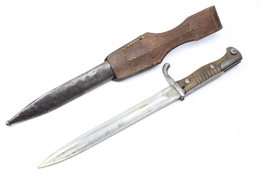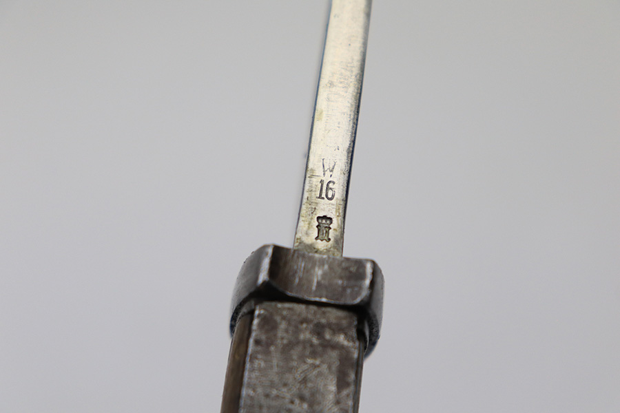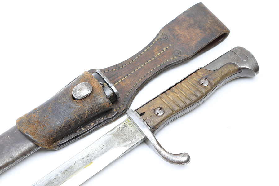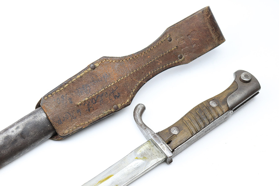 6/3/22 – This is an original 1916 dated WW1 German Gewehr rifle bayonet. The bayonet is in good overall condition. The blade has some mild surface discoloration and oxidation, and the edge shows mild signs of sharpening. The spine of the blade is imperial proof stamped and 1916 dated. The ricasso is maker stamped, but part of this marking is no longer legible. The wood handle is aged but not damaged. There’s some typical surface patina on the metal hand guard and pommel. The pommel also has the added numbers 5397 stamped into the metal. The scabbard is unmarked and slightly dented with small surface dents throughout. There’s dark patina throughout the metal as well. The attached leather frog is maker stamped and dated on the back. Nice leather and stitching.