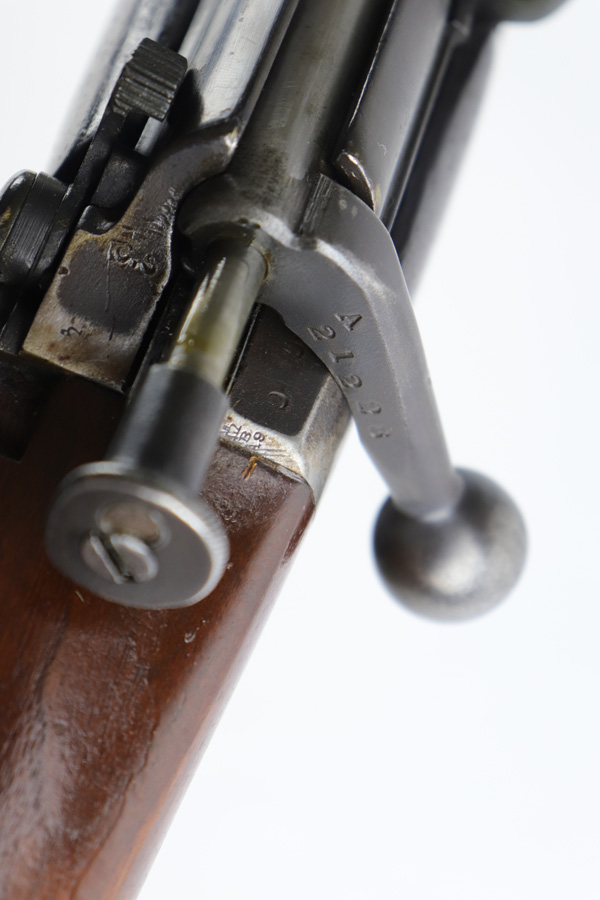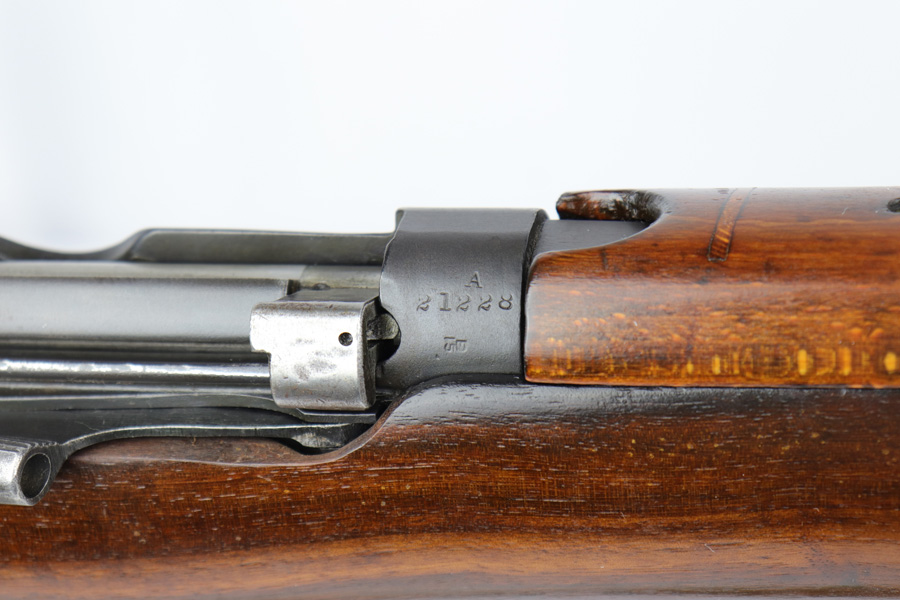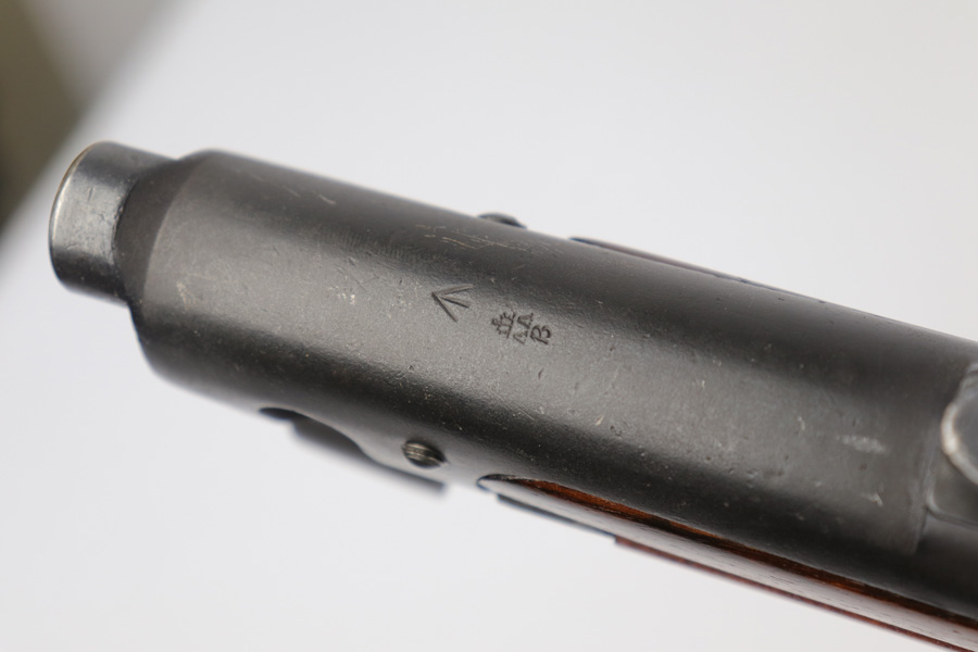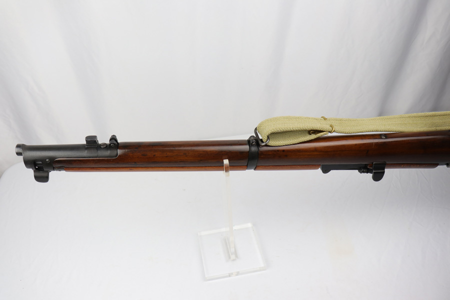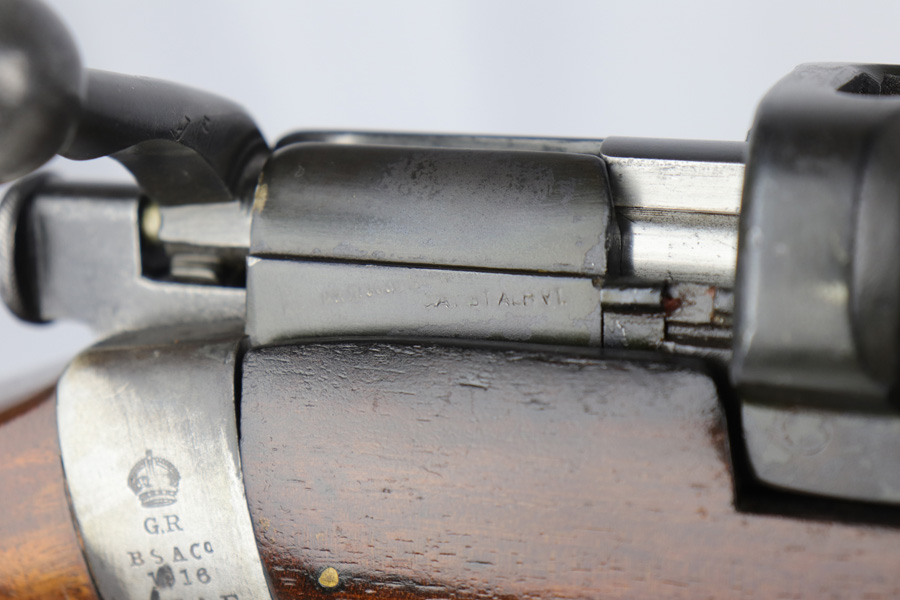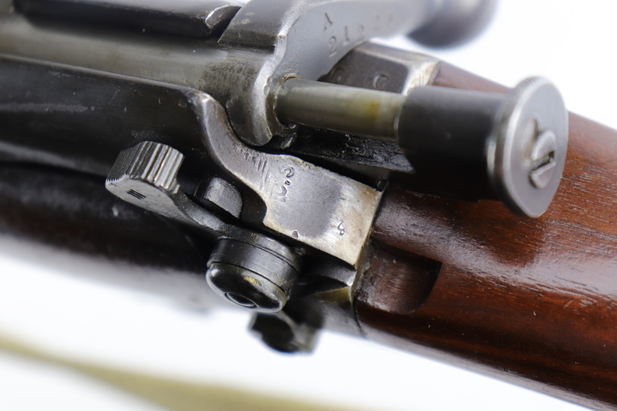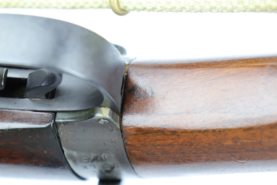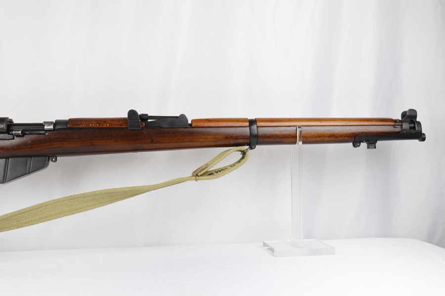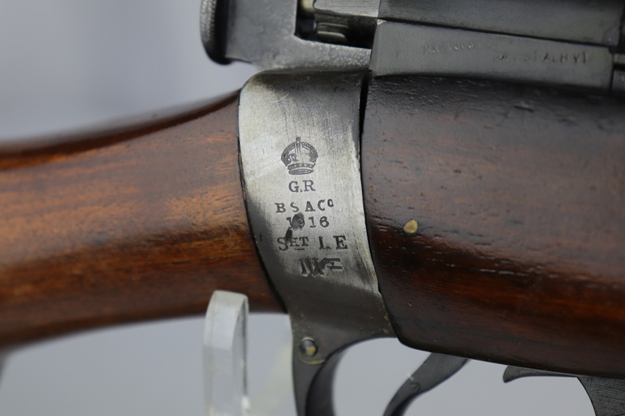 12/13/19 – This is a nice, original Short Magazine Lee-Enfield No 1 Mk III. Made by BSA Company in 1916, all numbered parts are matching including magazine, bolt and receiver. Original round cocking knob is present. Stock is in excellent condition with no cracks. Original sling. Bore is in good shape but does have minor frost throughout and the rifling is slightly worn down. Small import mark on right side of receiver.