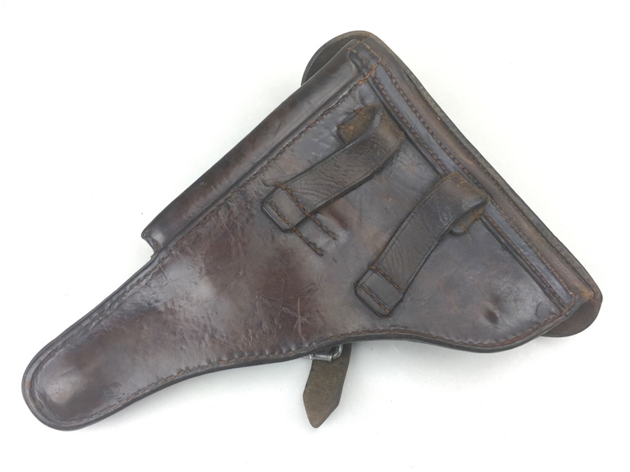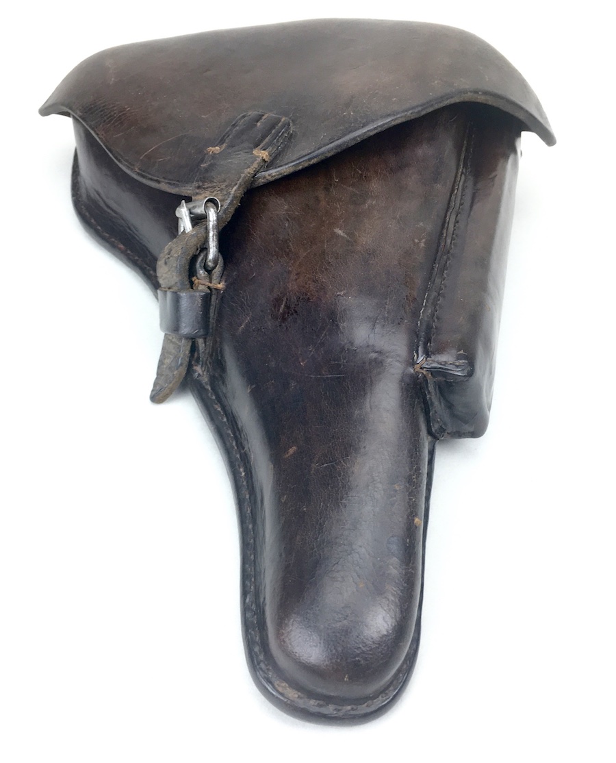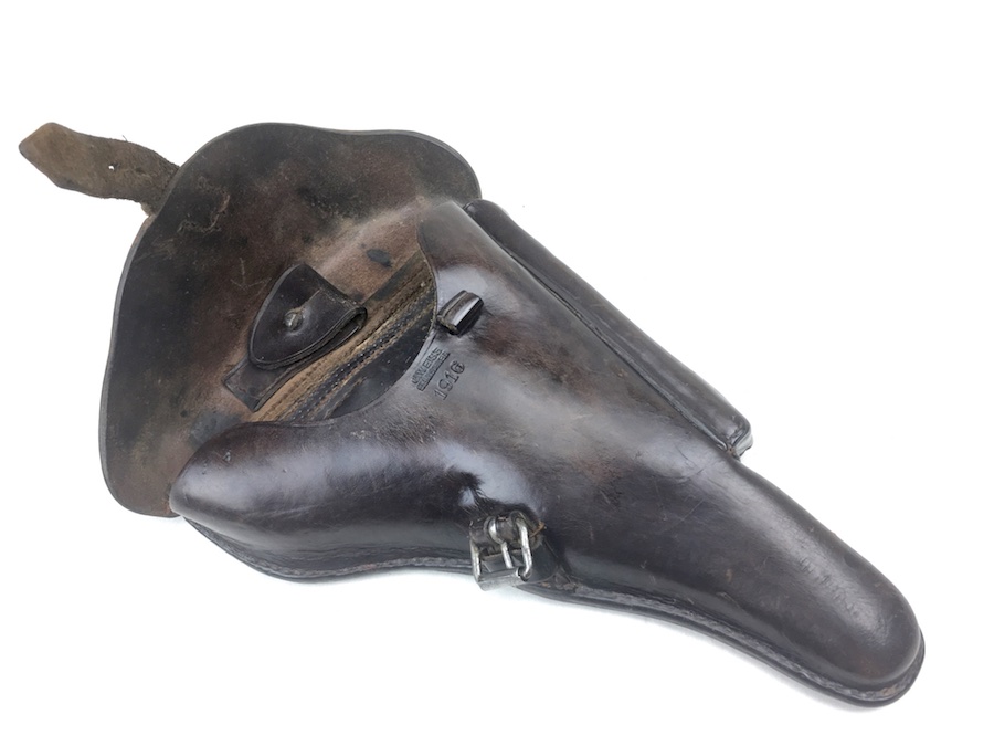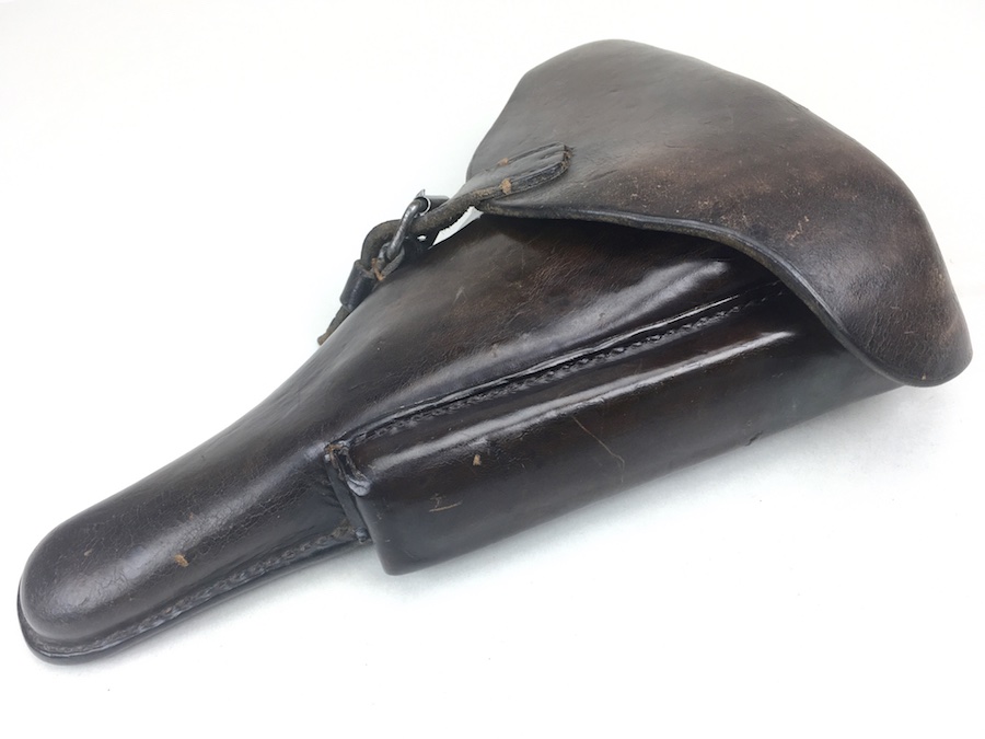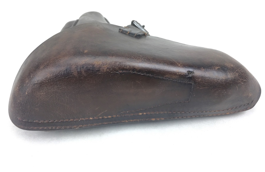 5/22/20 – This is an original WW1 era Luger holster in excellent overall condition. The front of the holster is distinctly maker stamped “C. WEISS” and dated 1916. There are no other markings. The leather has normal pliability and some light exterior scuffing on the back, but no major issues. Minor surface cracking on the closure strap, but overall very nice given its’ age. The stitching is all original and in tact except for about 1/2 inch on the top leather, where the lid hinges with the body of leather. This is on the right side when looking down on the lid of the holster. Clean interior with a secure lift strap. Initials “KK” etched just above the interior tool pouch.