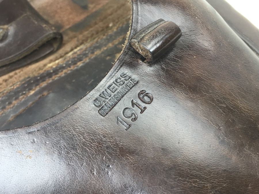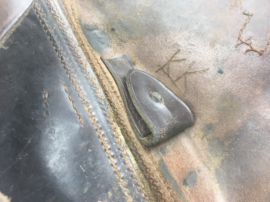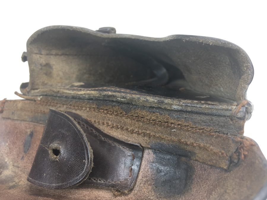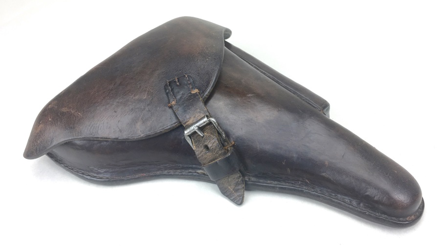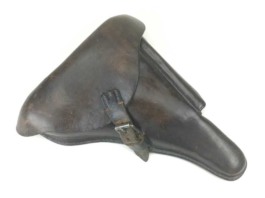 5/22/20 – This is an original WW1 era Luger holster in excellent overall condition. The front of the holster is distinctly maker stamped “C. WEISS” and dated 1916. There are no other markings. The leather has normal pliability and some light exterior scuffing on the back, but no major issues. Minor surface cracking on the closure strap, but overall very nice given its’ age. The stitching is all original and in tact except for about 1/2 inch on the top leather, where the lid hinges with the body of leather. This is on the right side when looking down on the lid of the holster. Clean interior with a secure lift strap. Initials “KK” etched just above the interior tool pouch.