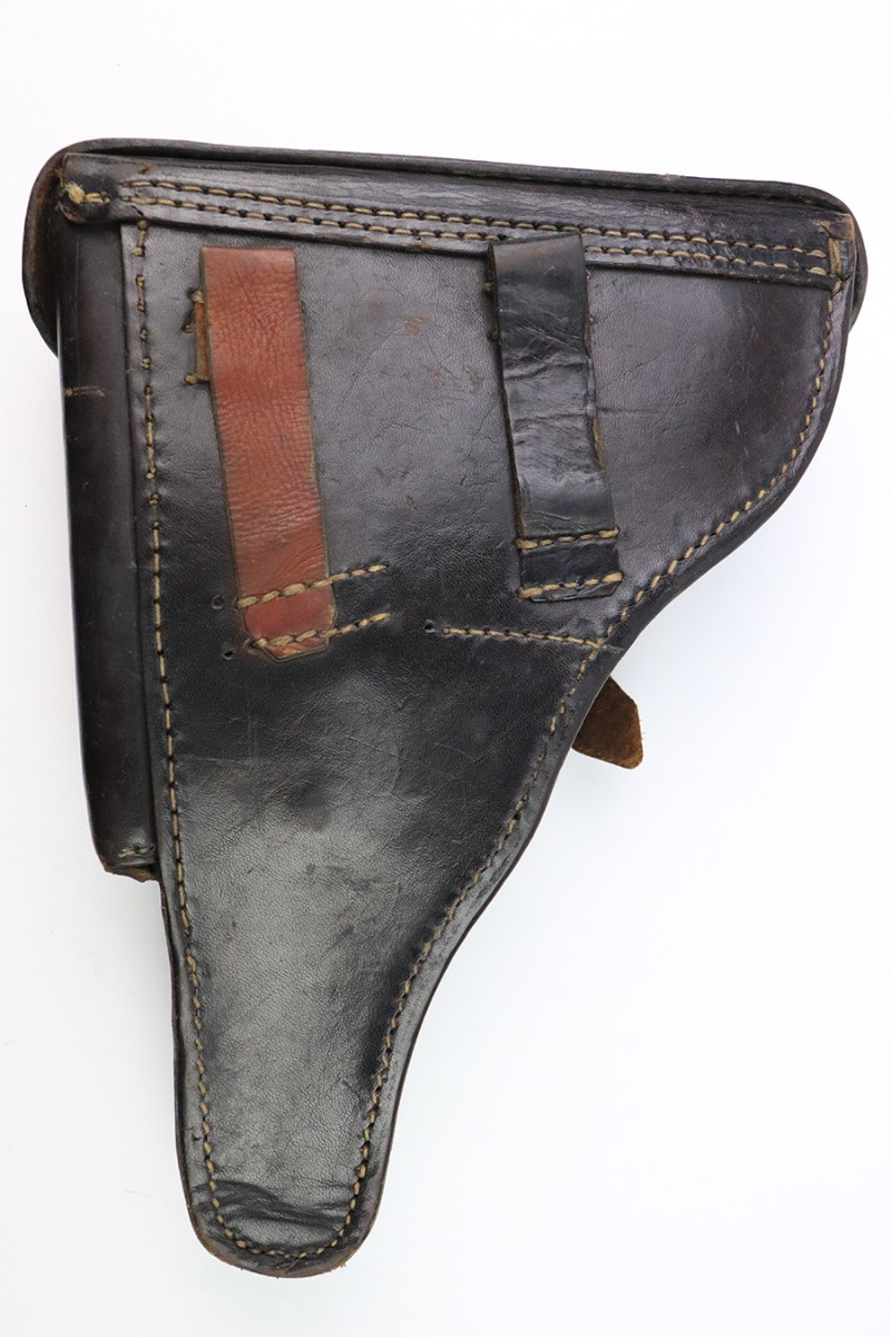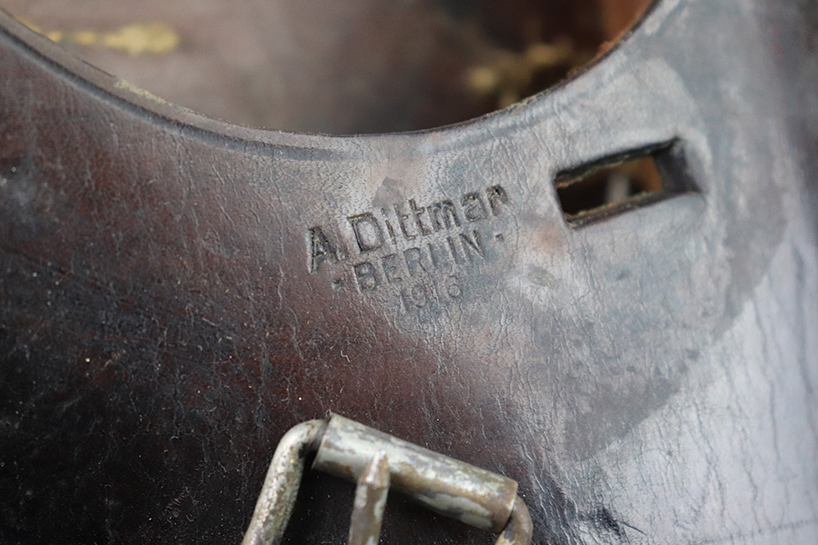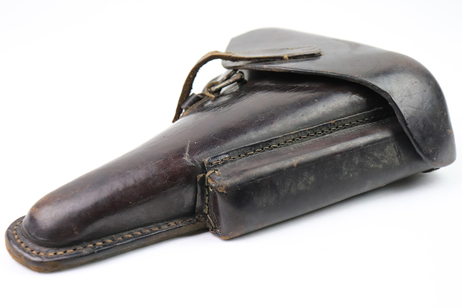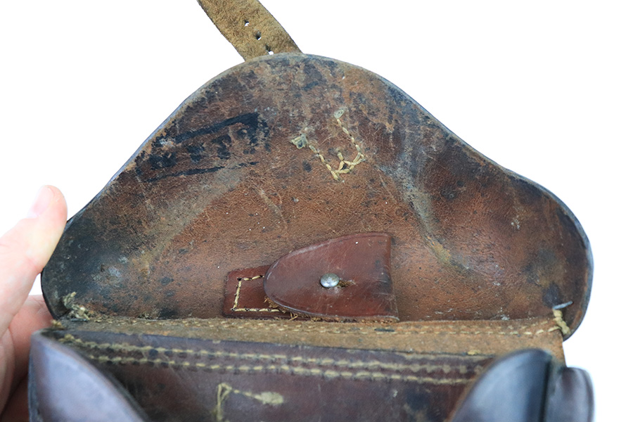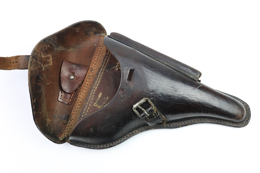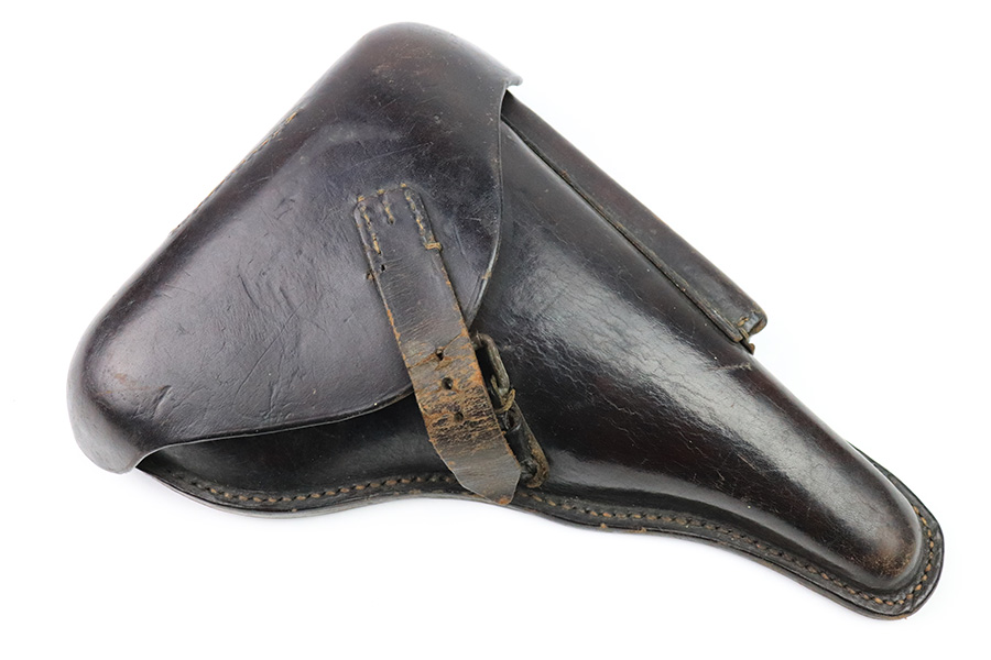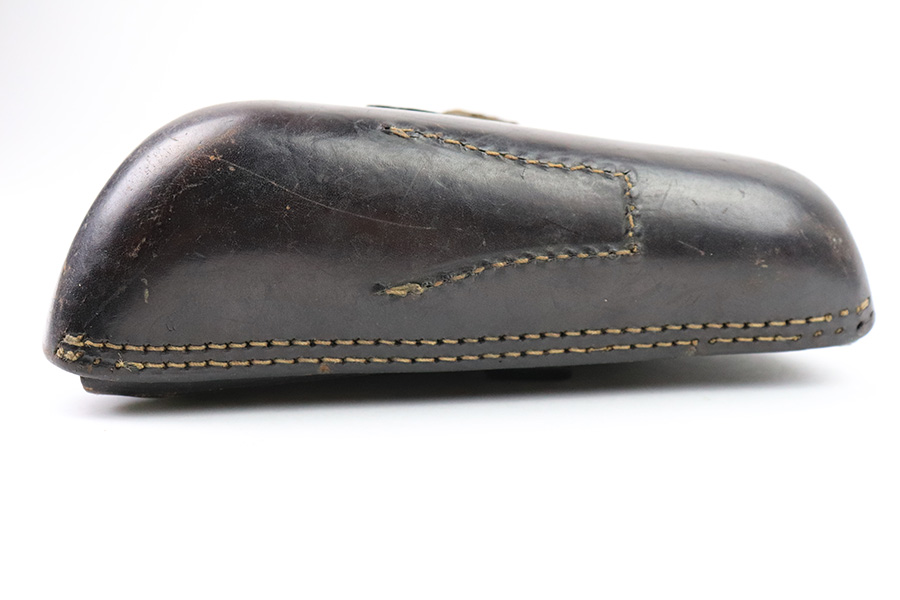 12/21/22 – This is an original WW1 German Luger holster. The holster is maker stamped and dated on the front leather underneath the lid and closure strap. The leather is in great condition throughout the holster, with mild pliability and some light surface wrinkling on the front leather. The closure strap has surface wrinkling and some light cracking but is completely intact. The lift strap is missing. The back of the holster shows one of the belt loops has been replaced, and there’s a half-line of stitching below the belt loops that we can’t explain (it shouldn’t be there). The rest of the stitching is all tight and excellent.