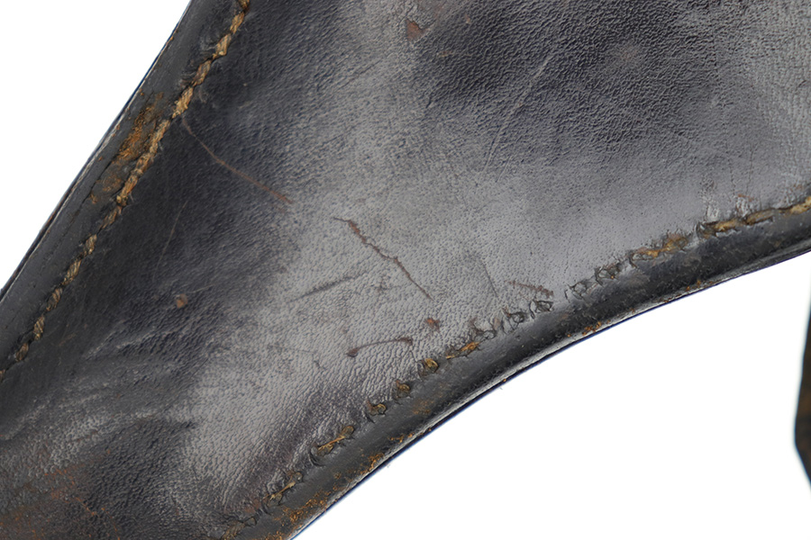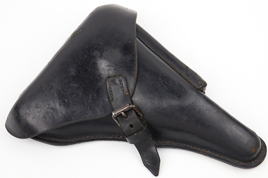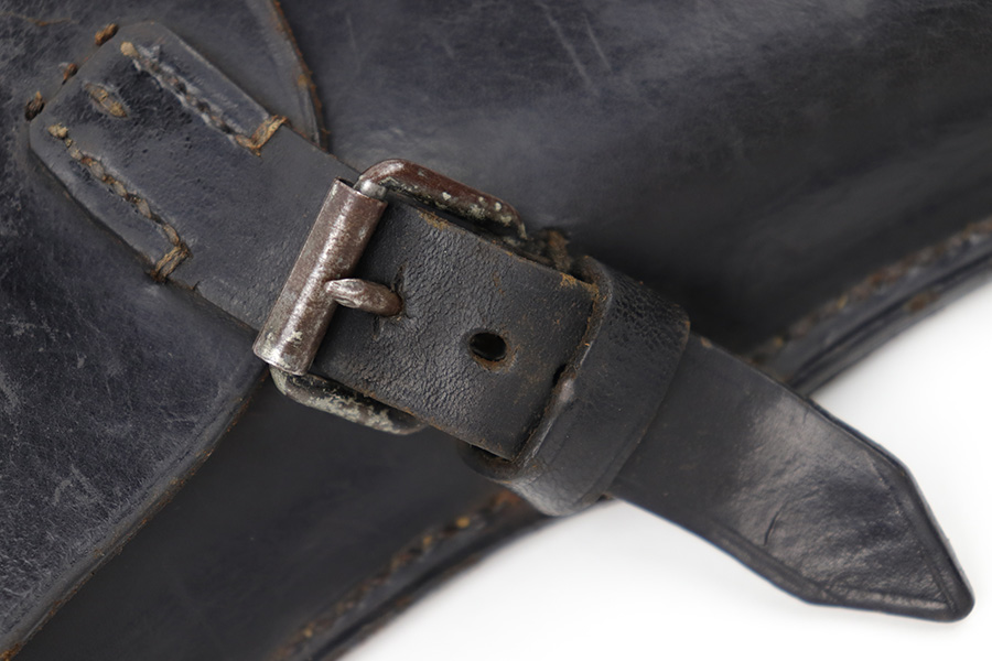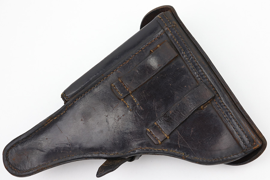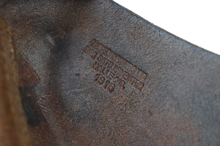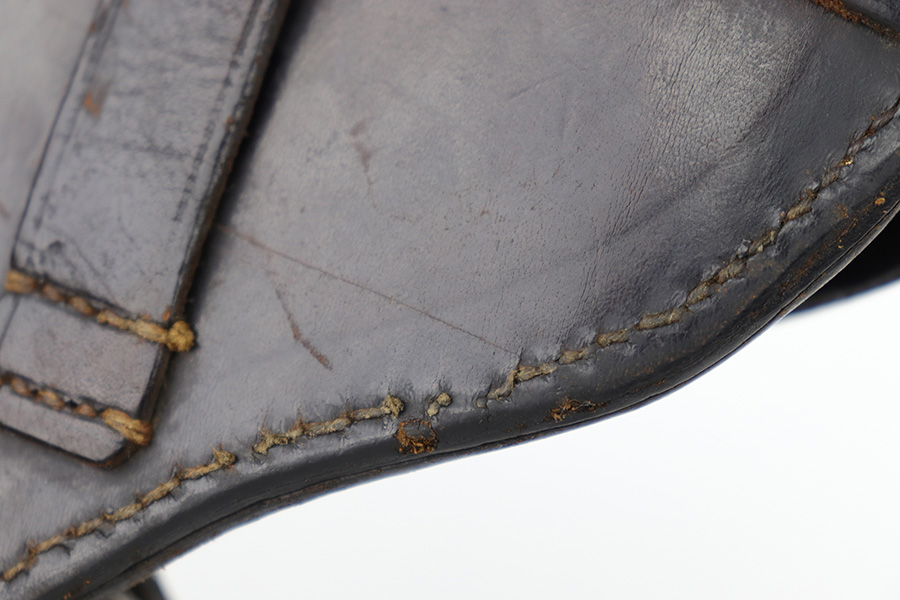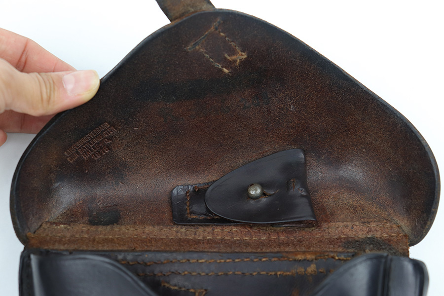 4/17/23 – This is an original 1916 dated Luger holster from WW1. The holster is in great condition with all original leather and stitching. The interior lid of the holster is maker stamped and date stamped. These markings are crisp and still visible, which is fairly uncommon for an early WW1 holster like this. The leather is soft and pliable but has nice shape overall and no major issues. There’s some mild scuffing on the front toe of leather and magazine pouch. Fairly clean interior leather, with some mild cracking on the tool pouch. The stitching is all original with a few semi-loose stitches shown on the back-toe of leather, but this doesn’t affect functionality nor does it create any separation in the leather.