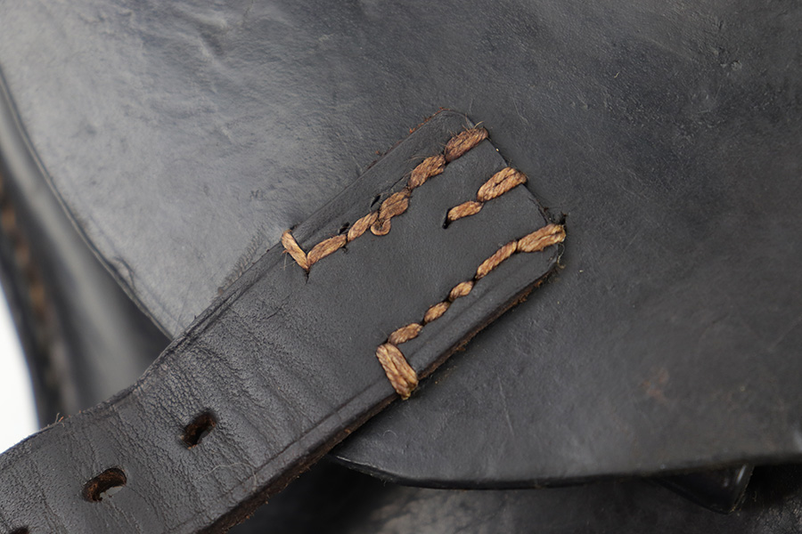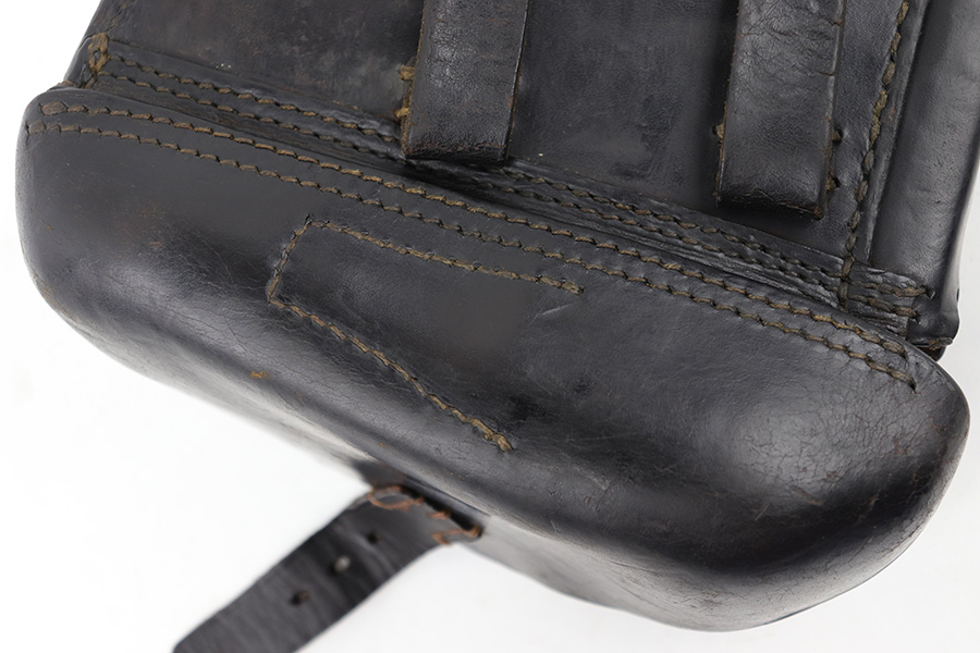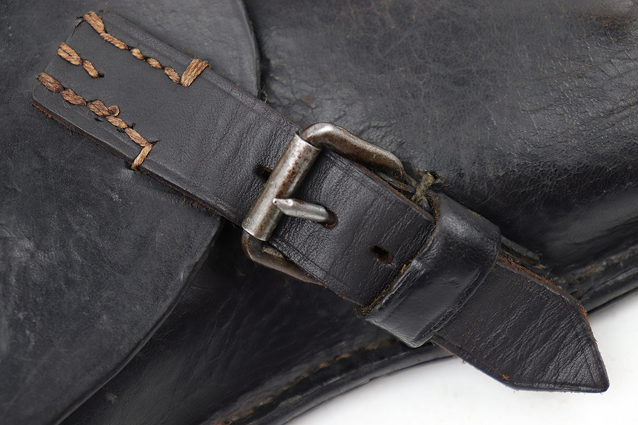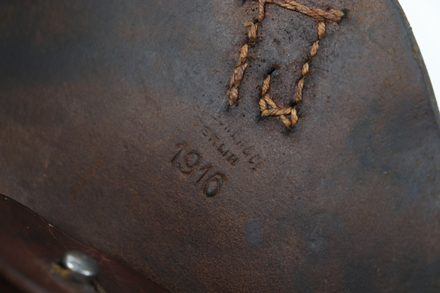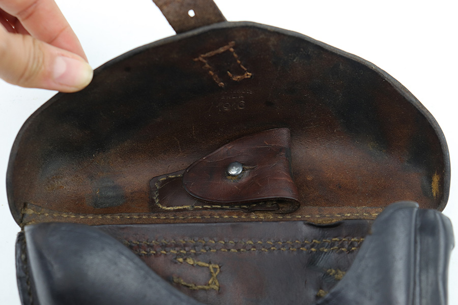 5/2/23 – This is an original 1916 dated Luger holster from WW1. The holster is in great overall condition, but the front closure strap has been replaced. This is a professional-looking replacement with both the leather and stitching looking aged and period correct with matching colors to the original components elsewhere on the holster. The leather is soft and pliable with mild surface wrinkling and scuffing on the front leather, mostly near the toe. Maker stamped and date stamped on the interior lid, as shown. The leather has normal pliability and all stitching is tight and intact.