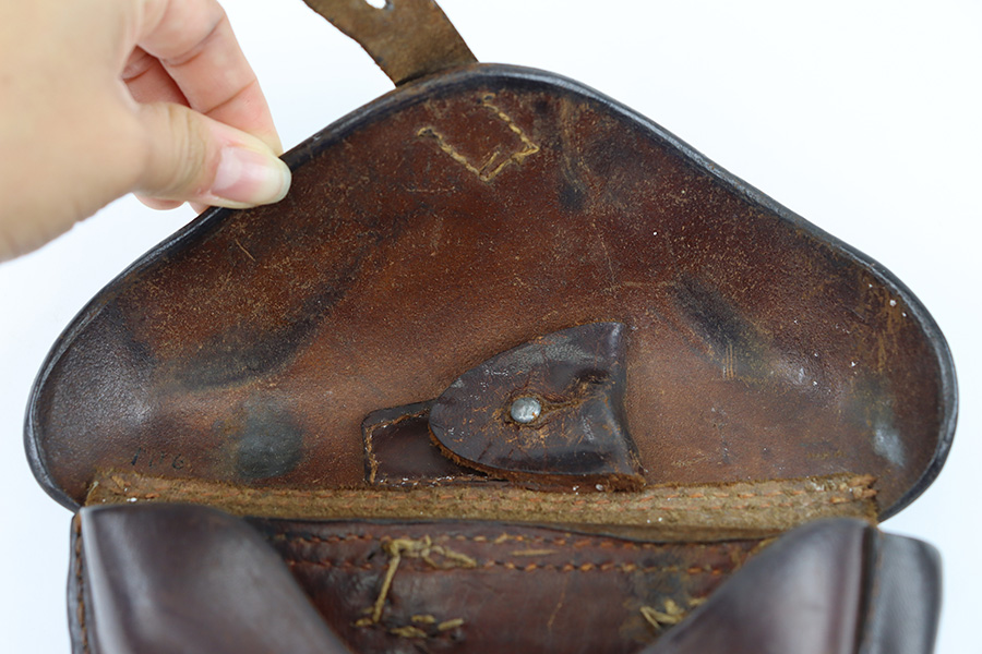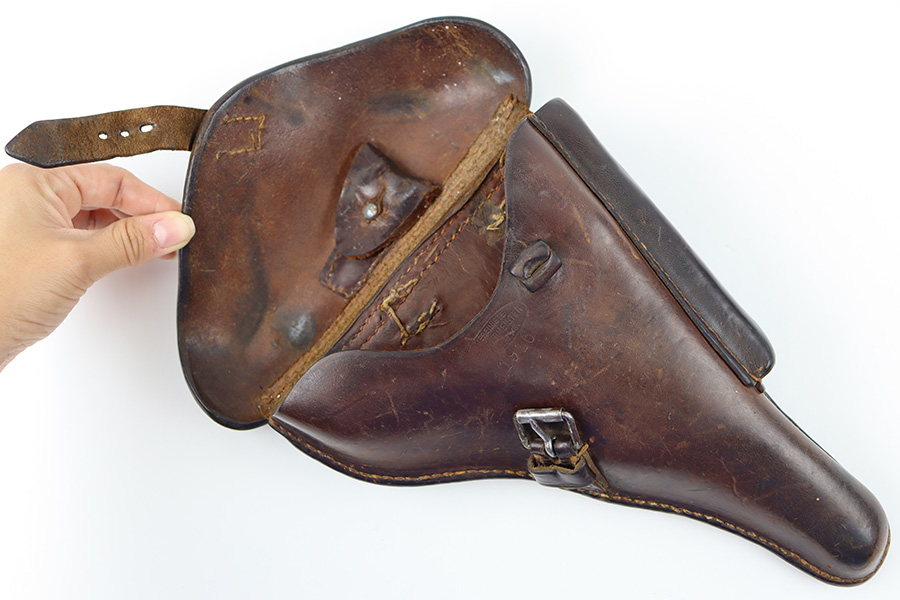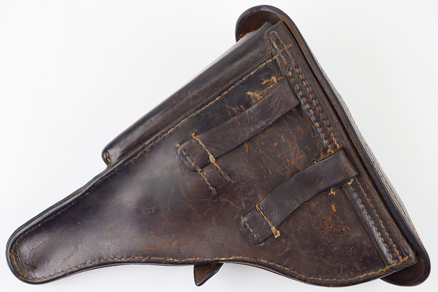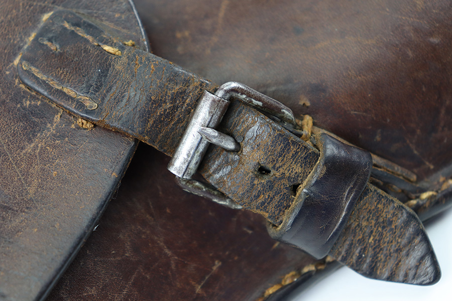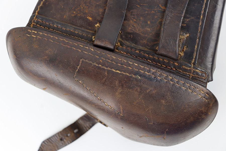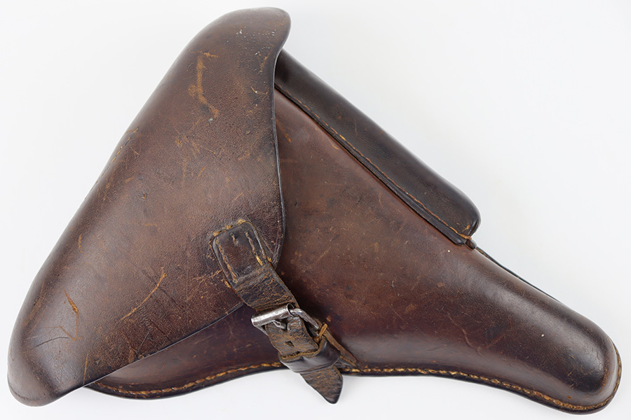 10/3/23 – This is an original WW1 era production Luger holster. The holster is in great overall condition with some normal signs of aging and previous use. The leather is all original and has normal pliability. Maker and date stamped on the front leather, just under the lid / closure strap area. The back belt loops appear to have been re-stitched, but the stitching looks period correct and this is likely a field repair of some kind. The rest of the stitching is original and tight. A few exterior scuffs but no major issues. A very nice wartime production example.