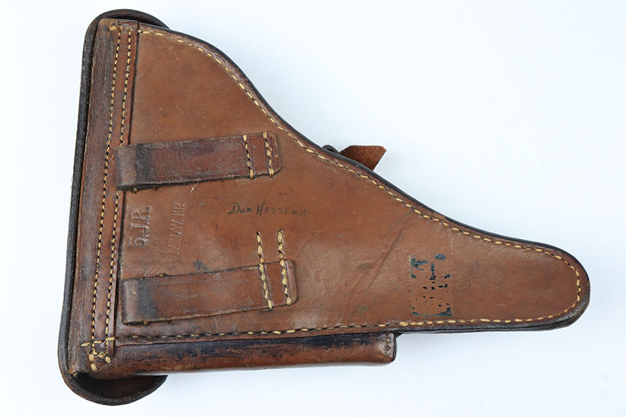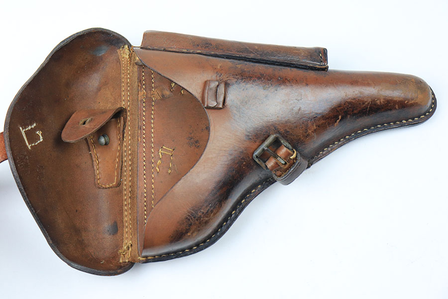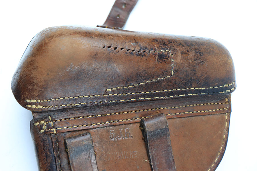 7/28/21 – This is an very nice WW1 era Luger holster dated 1916. The holster has strong leather that’s very hard to find for holsters this old. The leather has minimal pliability and excellent stitching throughout. The only issue is the closure strap appears to be replacement. The markings are excellent and crisp, with a maker stamp, date, and unit stamp on the interior of the lid. A very nice collectible example.
