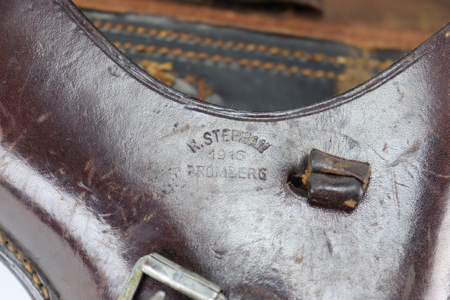 3/23/22 – This is an original WW1 production Luger holster in excellent condition. The holster is stamped on the front leather with a maker and date stamp, as shown. The leather is firm and clean throughout without any notable issues. The magazine pouch has a few mild scuffs, as does the closure strap, but this is typical. No stitching issues either. Clean interior as well makes this a highly collectible, early production Luger holster.