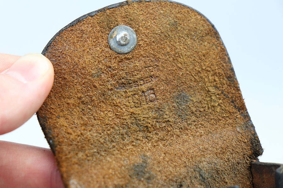3/18/21 – This is an original WW1 era Luger magazine pouch. These were paired with artillery lugers, as part of the rig attached to the shoulder straps. The leather is in good overall condition with some surface cracking on the lid as well as the side of the pouch. There’s also some minor scuffing along the edges of the leather. The interior lid is maker stamped and dated 1916. The stitching is all original and in tact.