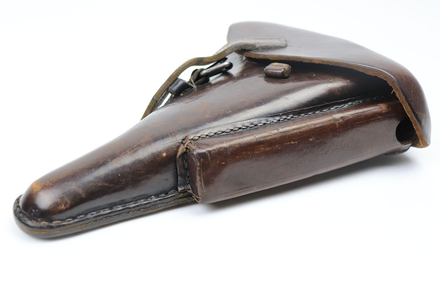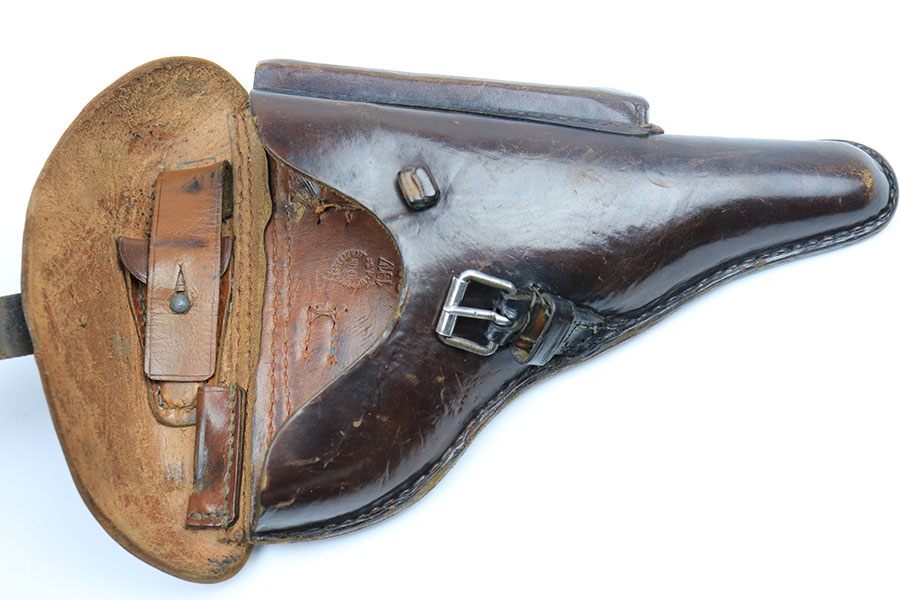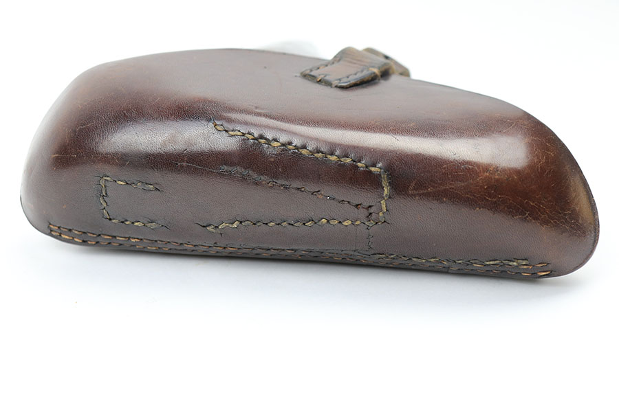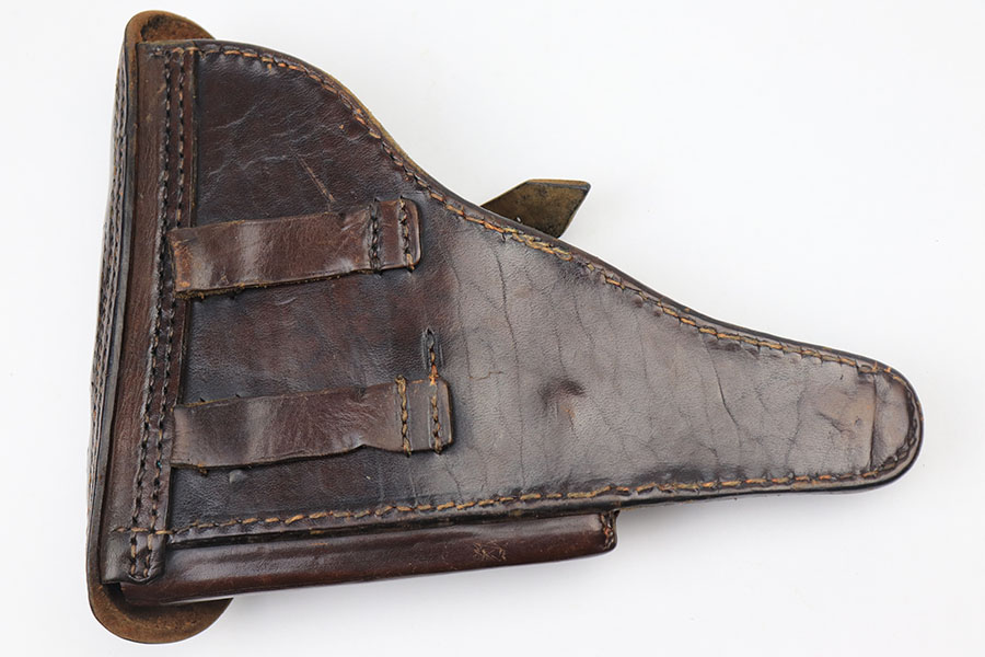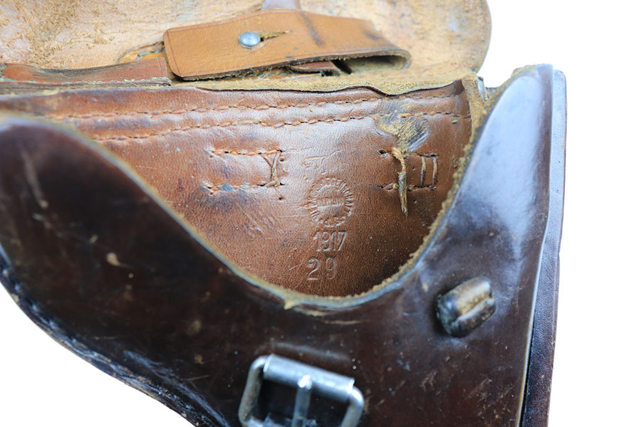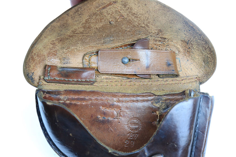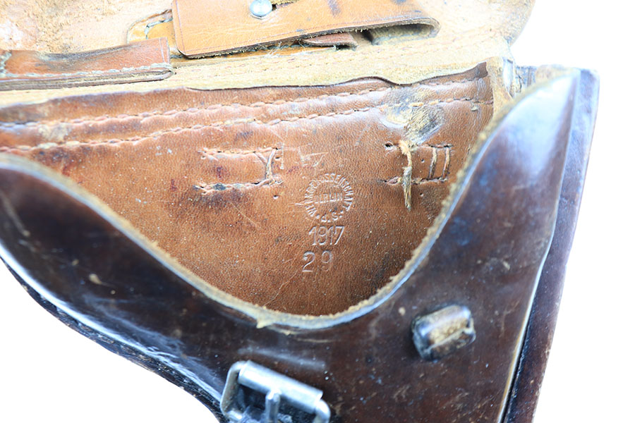 2/12/21 – This is a WW1 luger holster later repurposed for commercial use / police use during the Weimar era. A perfect holster for a Simson Luger, as the holster has space for a cleaning rod, luger tool, and spare magazine. The holster is maker stamped, and double dated on the interior leather as shown. Strong, original stamps. The leather is in great overall condition and has no major issues. All original stitching in tact as well. A great piece of history for luger collectors.