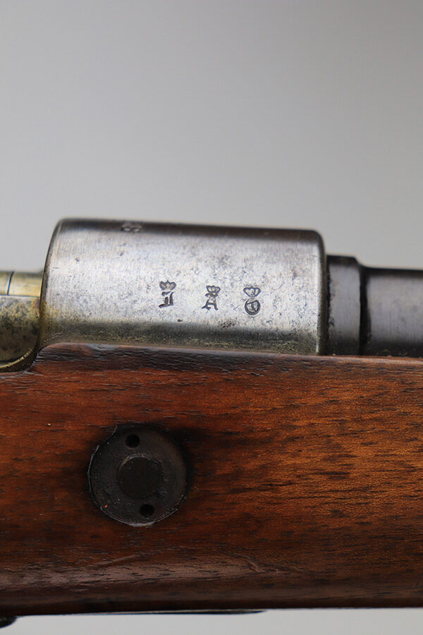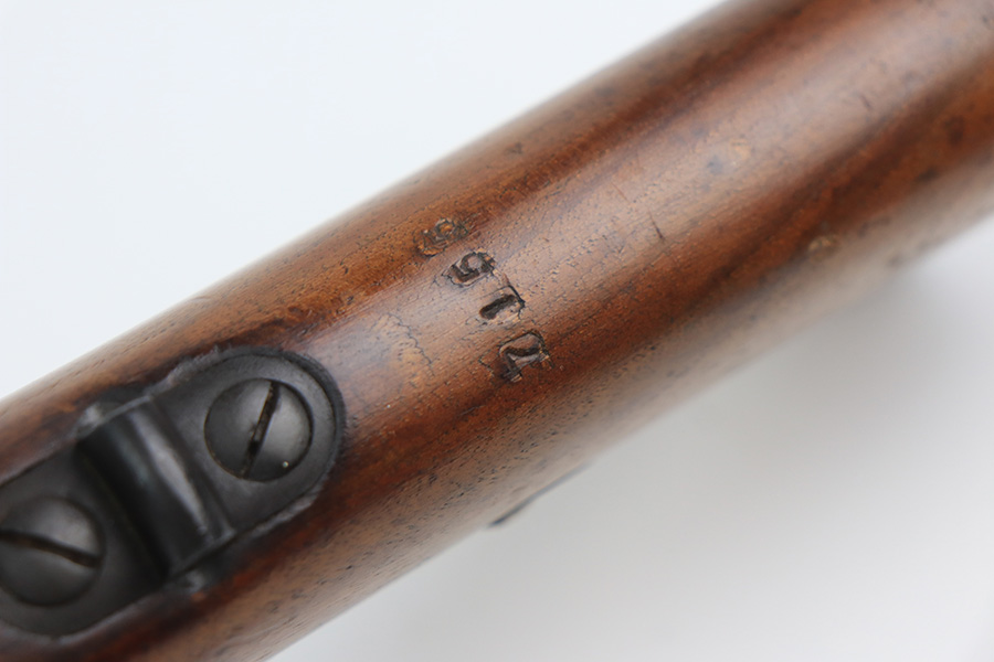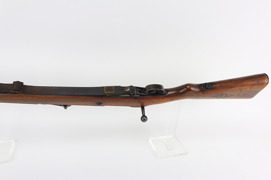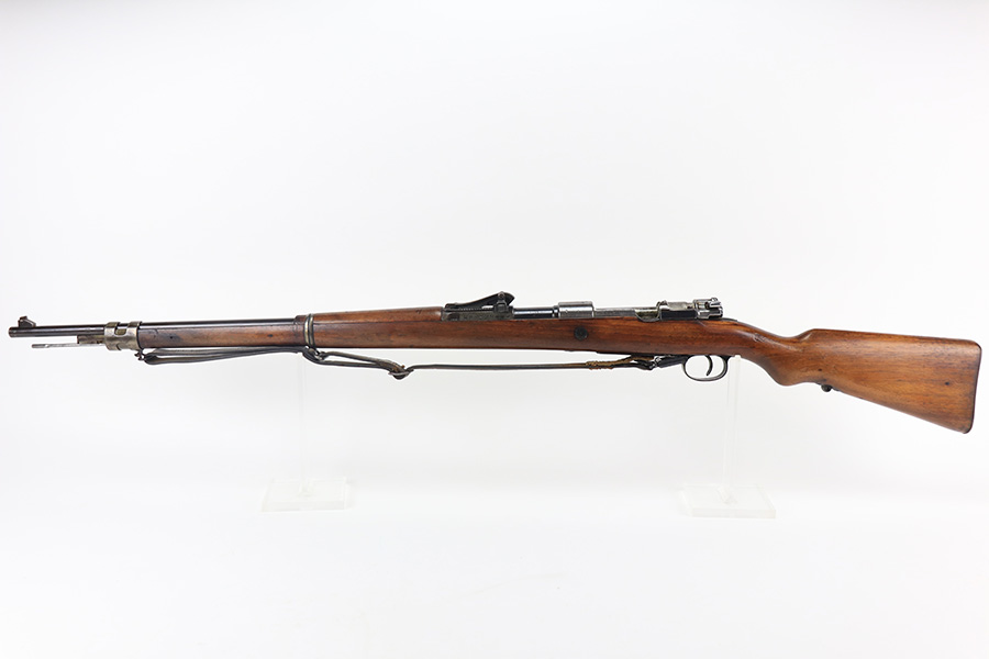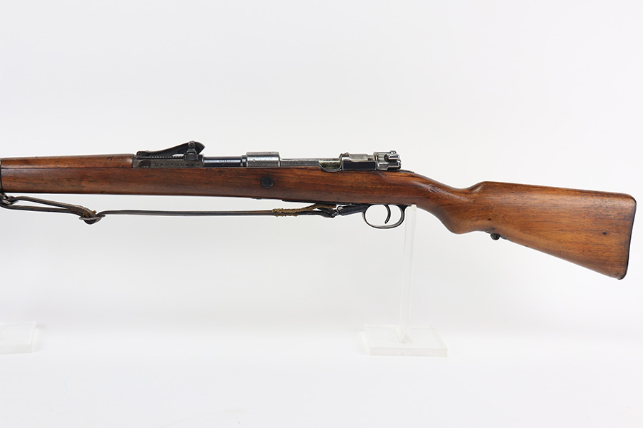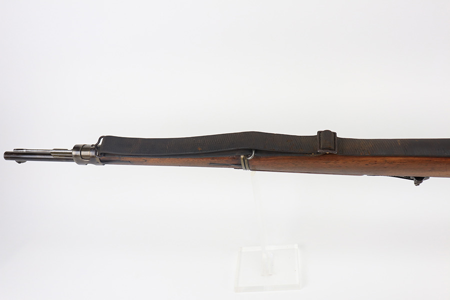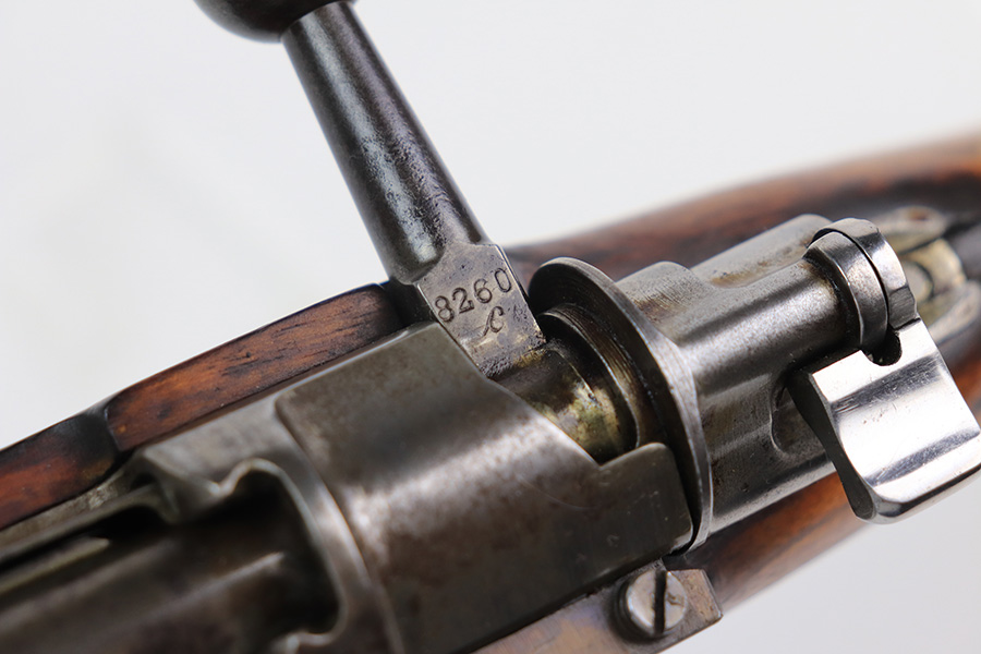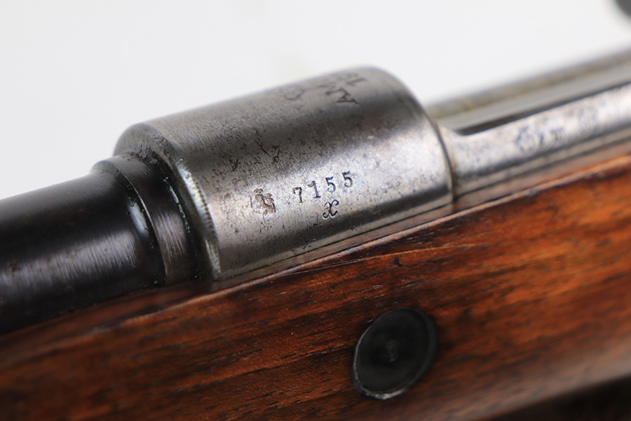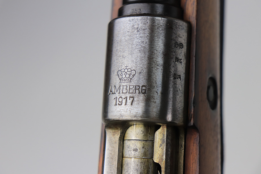 2/1/22 – This is a nice example of an Amberg Gewehr 98 rifle issued to the Imperial German military in 1917. The gun is mostly matching (including the stock, rear sight, and butt plate) except for bolt, follower, and floor plate. Comes with an original cleaning rod and leather sling. It has the proper Imperial German proofs throughout, including on the wood stock. Some of the parts have lost most of their finish including the receiver, barrel bands, bolt, floor plate, and trigger group. Small dots of oxidation covering most of the metal parts. There is an area of pitting on the left side of the barrel and on the left side of the front barrel band. Some spotty oxidation and a few small spots of light surface rust on the butt plate. The stock is very nice with only minor dings, dents, and bruises here and there. The bore is shiny with good rifling with very minor pin-pricking in the grooves.