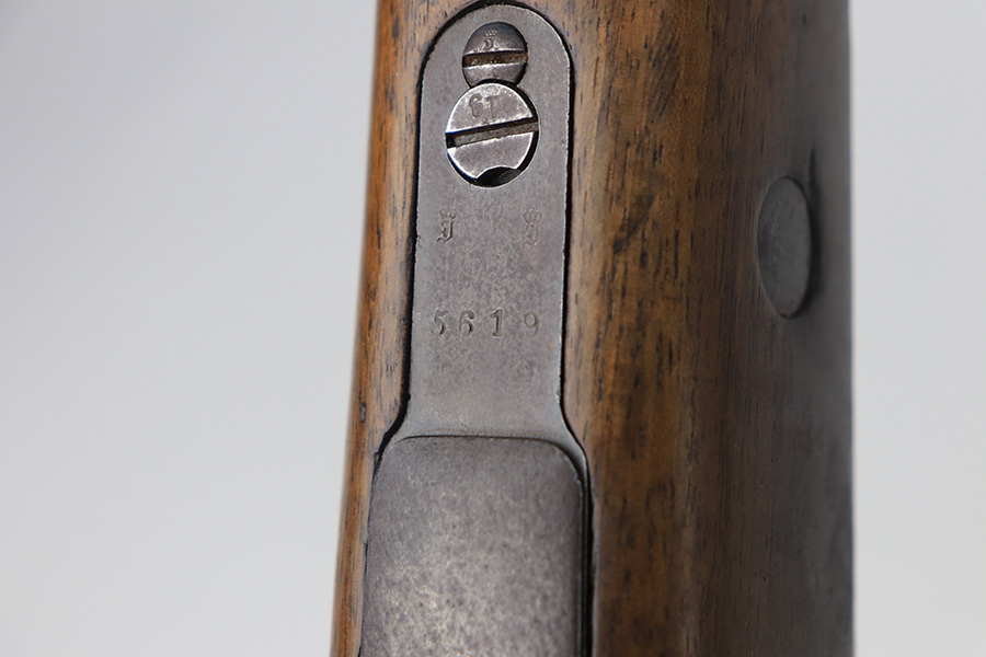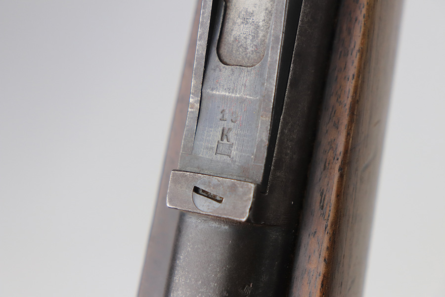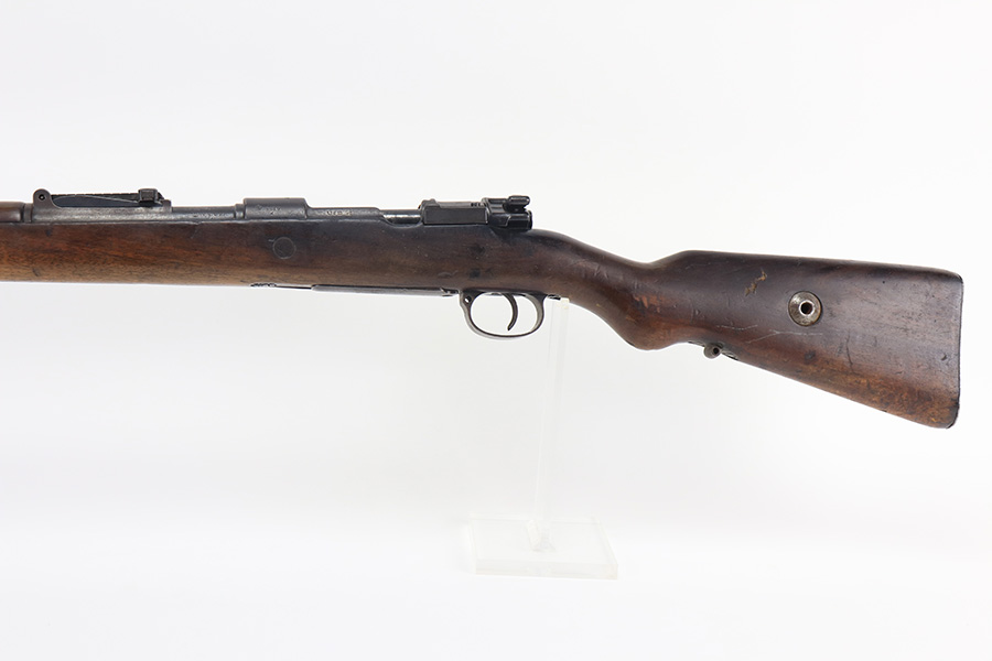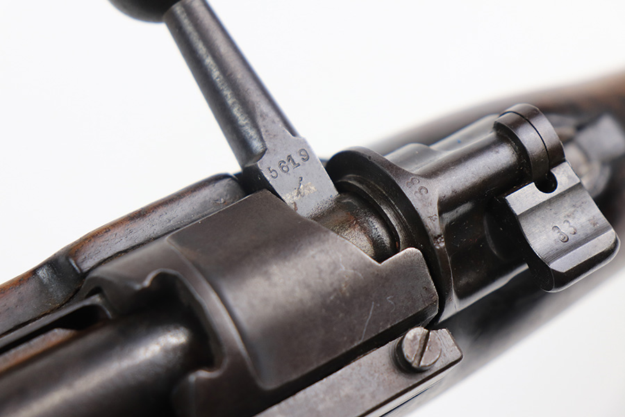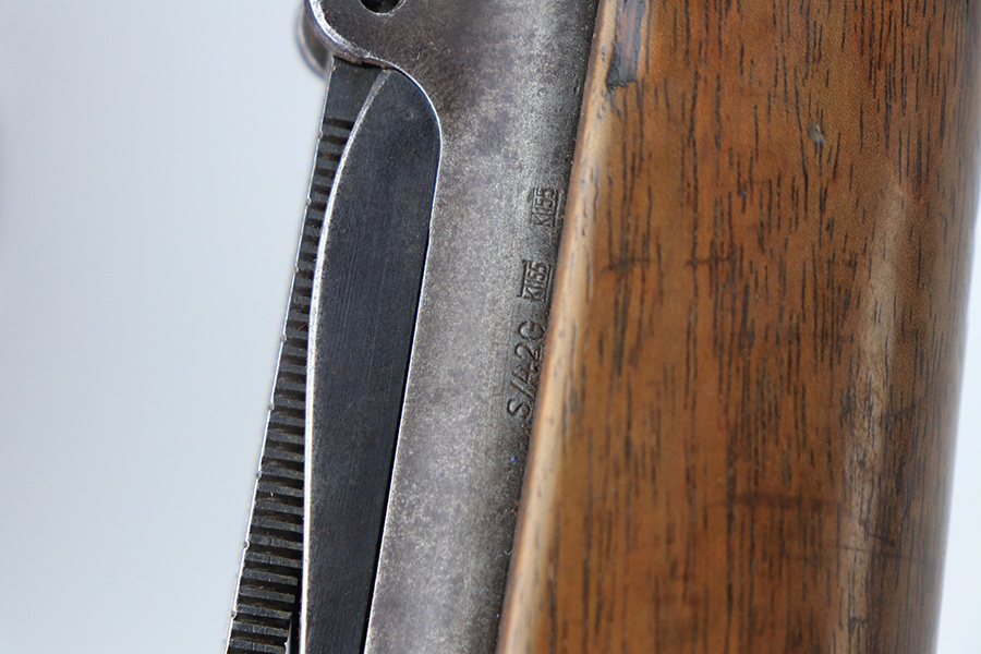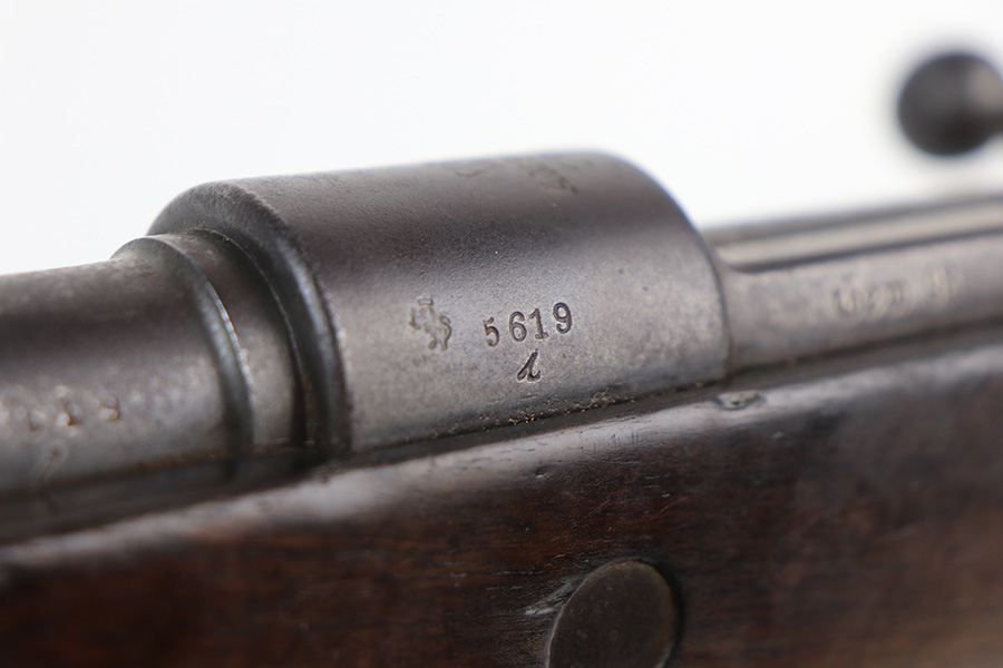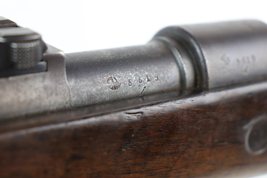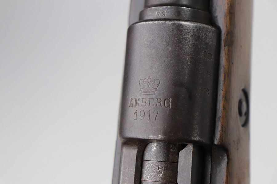 1/28/22 – This is a nice example of an Amberg Gewehr 98. It was initially issued to the Imperial German military in 1917. It has the proper Imperial proofs throughout. It was then reworked and issued to the Nazi military, as evidenced by the Nazi military wafffen proofs on the receiver and the right side of the barrel. The barrel is also marked with a “G Date” Mauser proof, “S/42G”, indicating the barrel was replaced. The wood stock has Imperial proofs but also has Weimar-era military proofs. Comes with a cleaning rod. The gun is entirely matching (including the stock), except for a few small parts at the back of the bolt. There is heavy brown patina and spotty oxidation on virtually all of the metal parts. The stock has noticeable dings, dents, and scratches throughout with a few more noticeable gouges on the butt stock. There is a rectangular wood repair on the right side of the butt stock. The bore is shiny with strong rifling and some minor oxidation near the muzzle.