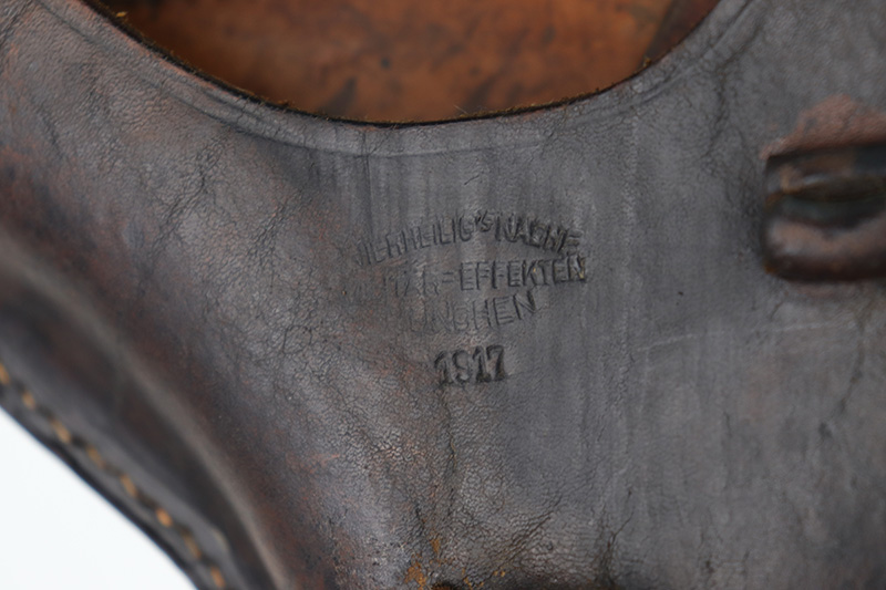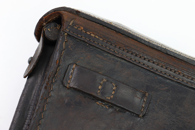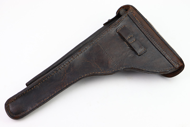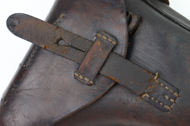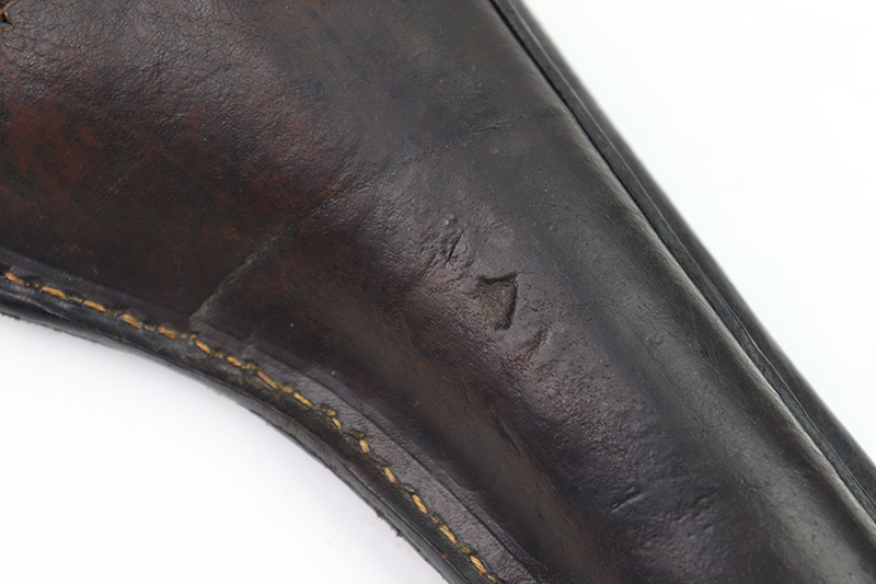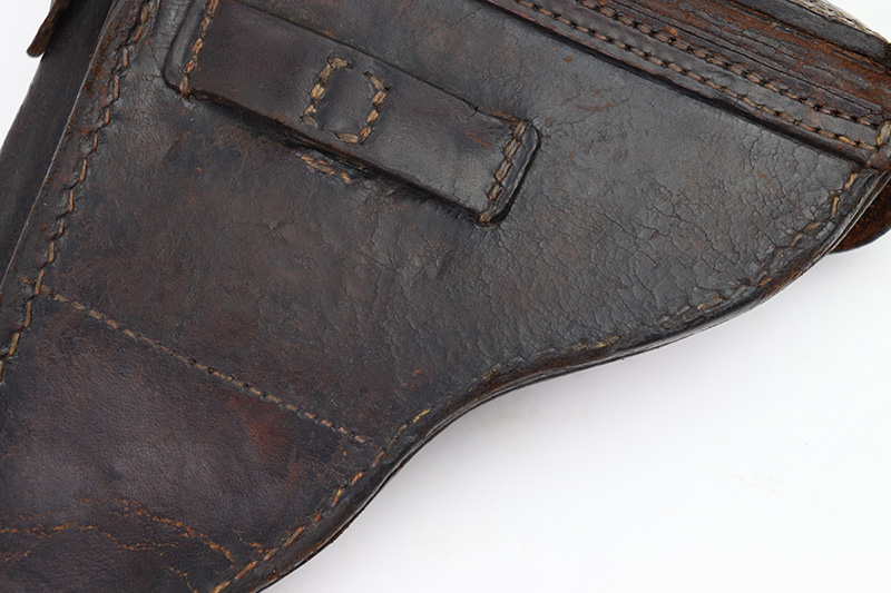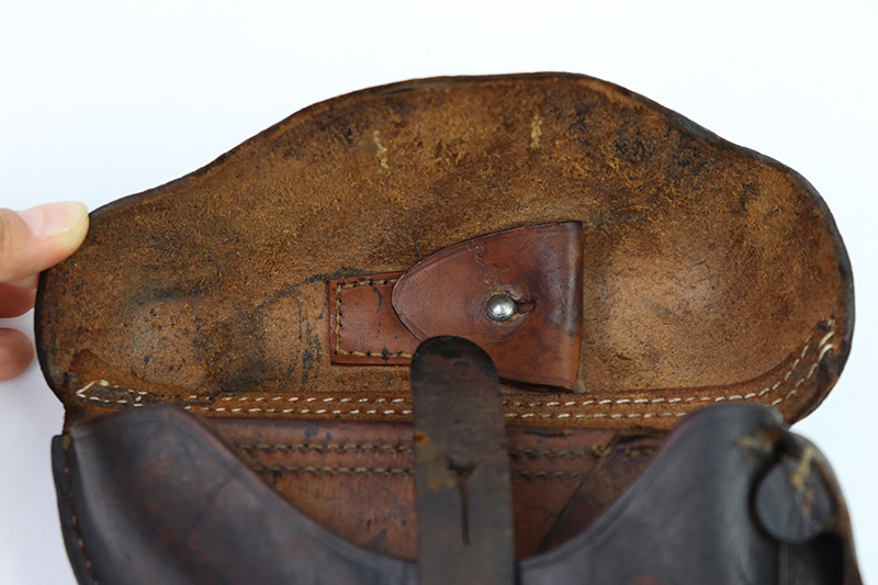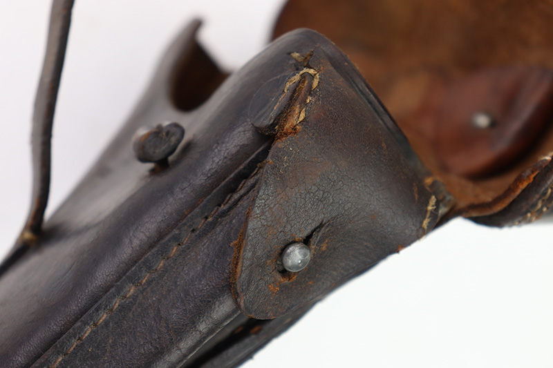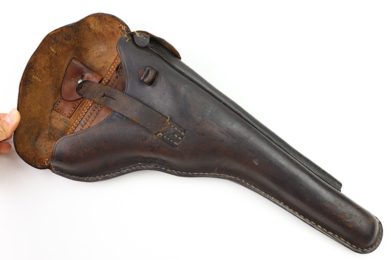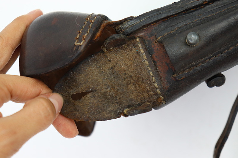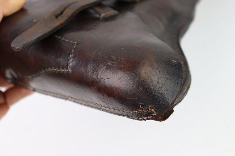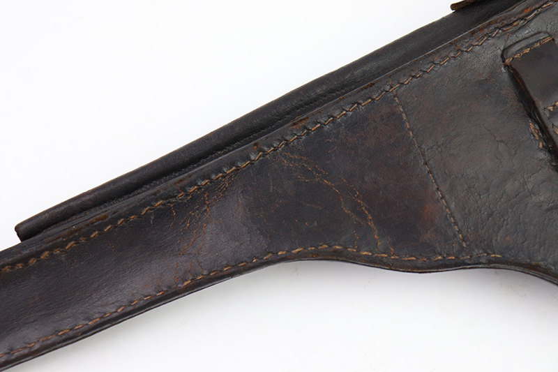 8/24/22 – This is an original 1917 dated Artillery Luger holster. The holster is maker stamped and dated on the front leather. The maker stamp is a double-stamp so it’s somewhat difficult to read. The leather is slightly pliable with surface discoloration and some mild scuffing. There’s also some surface wrinkling and typical signs of aging throughout the holster. No notable stitching flaws, and the side cleaning rod pouch is still intact. Fairly clean interior leather as well.