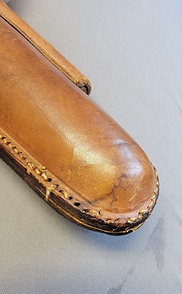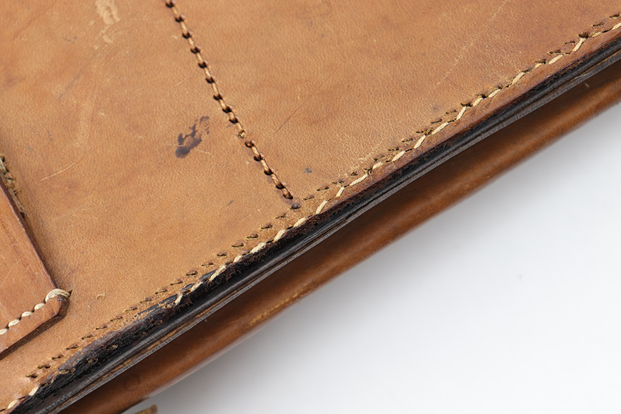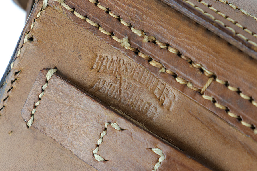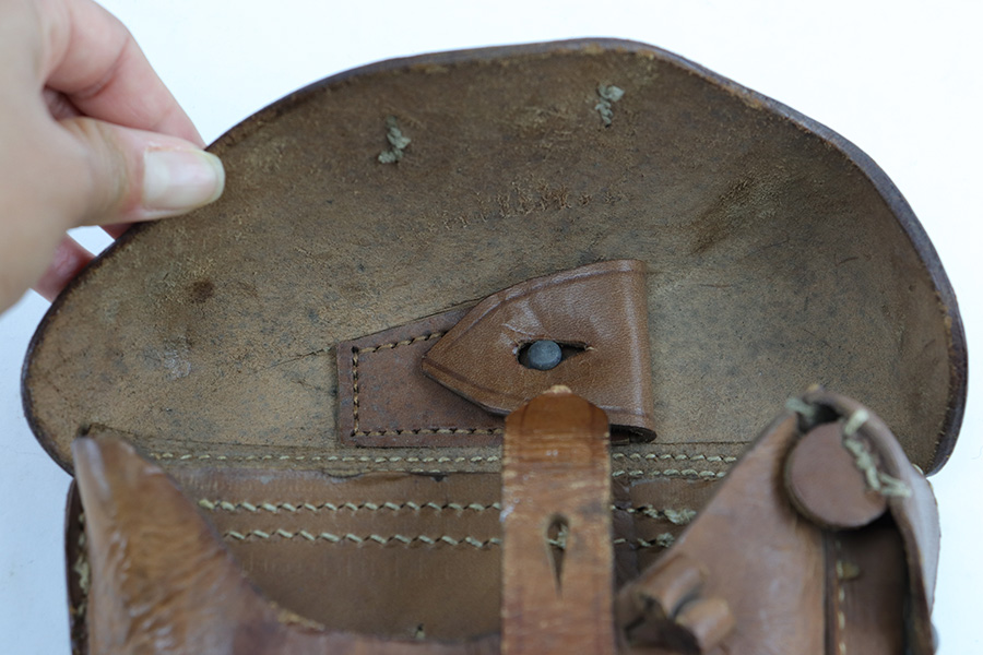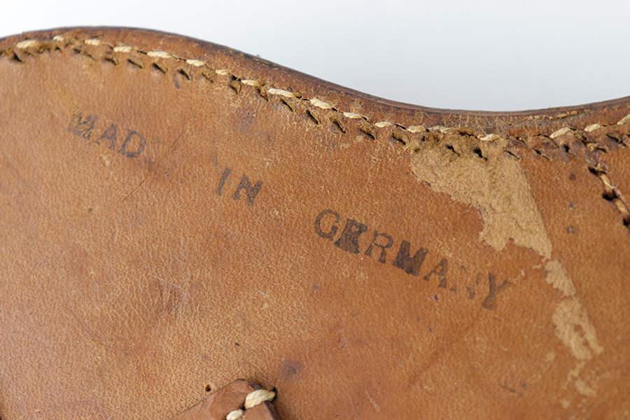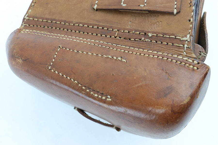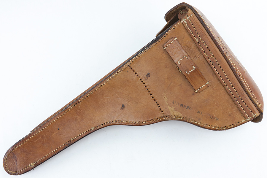 7/11/23 – This is an original WW1 production Artillery Luger holster. The holster is in great overall condition with very nice light brown leather. The stitching is all tight and intact, but there’s evidence of restitching or perhaps a mistake in the original stitching on this example. This is evidenced by the extra stitching holes showing on the back leather. Further, there are a few loose and broken stitches at the toe of the holster. This doesn’t affect function or fit, but is worth noting. Price reduced accordingly. All the stitching does appear to be period correct, and based on the stitching style and double-stamped maker and date stamps, this suggests perhaps this holster was rushed production or a manufacturing fluke. The back leather is maker and dated 1917. There’s also a “MADE IN GERMANY” ink stamp on the back leather, meaning this was exported from Germany likely after WW1. The leather is strong and clean overall. A very nice example.