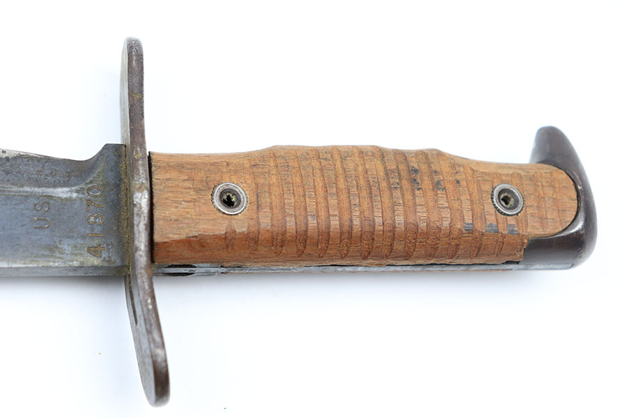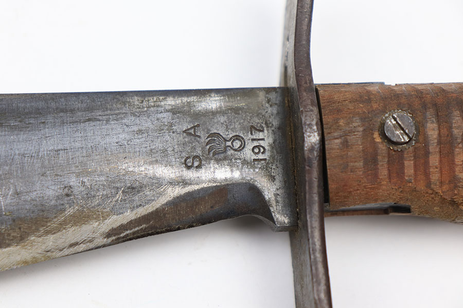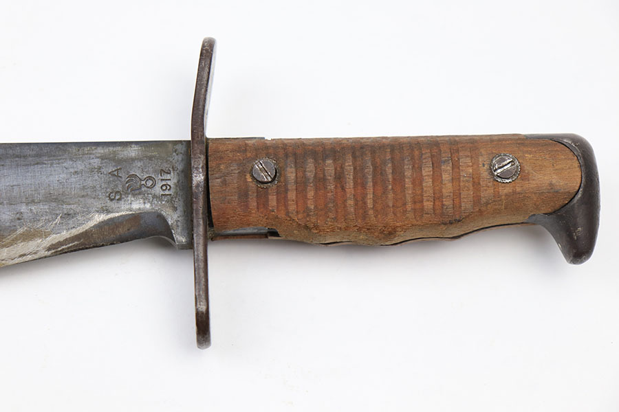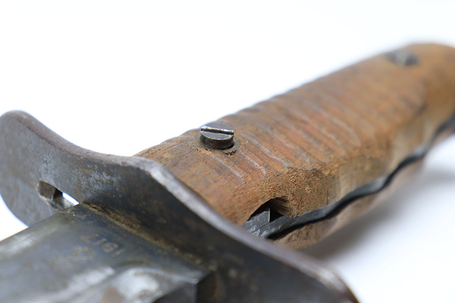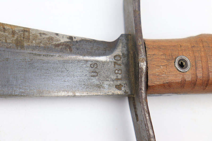 3/12/21 – This is a Springfield Armory 1917 Bolo knife from WW1. The blade is US stamped and serial numbered on one side, dated, ordnance stamped, and SA stamped on the other. The blade shows signs of use and mild sharpening. There’s also some dark oxidation / aging wear. The wood handles are in good condition, but one of the handle screws is slightly raised. The scabbard is excellent with the original canvas and leather toe still in tact. The toe is maker stamped and dated 1918. See photos.