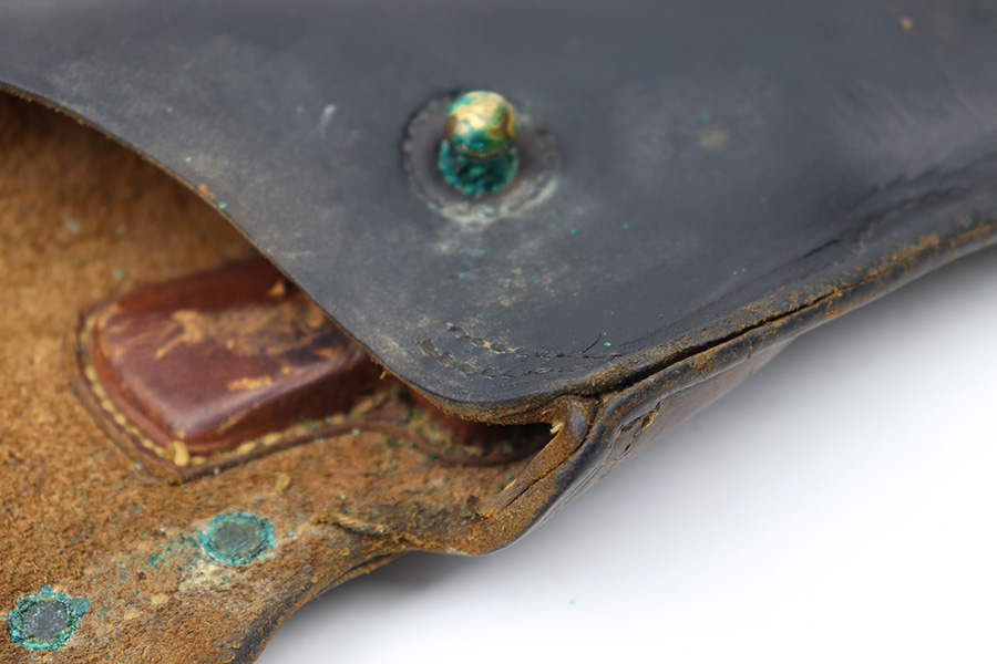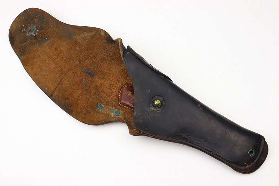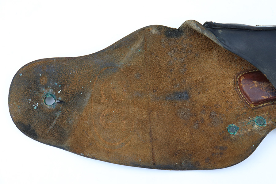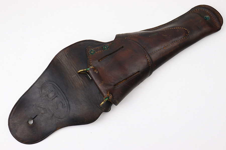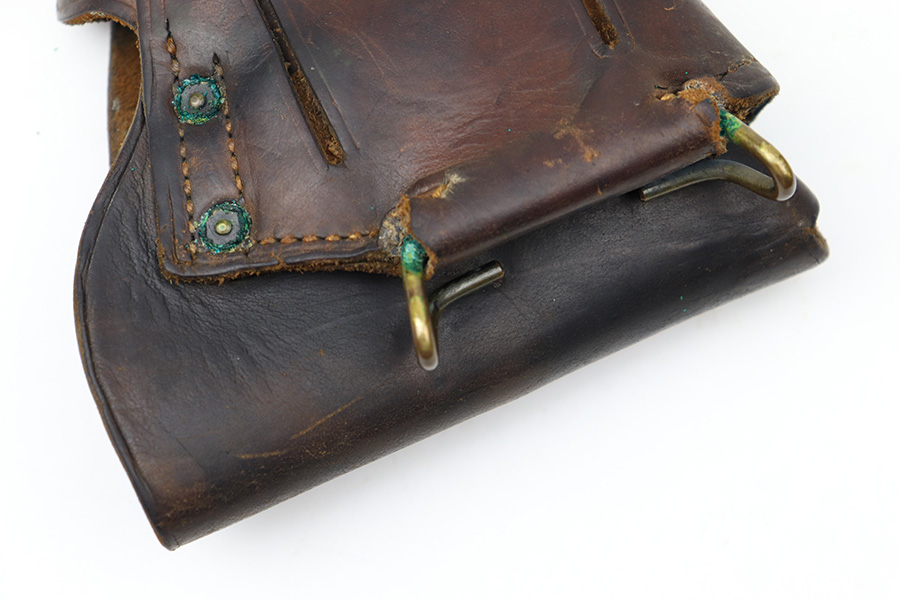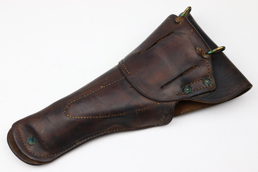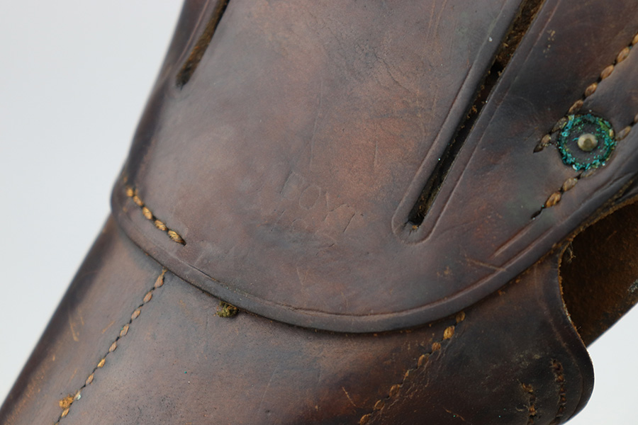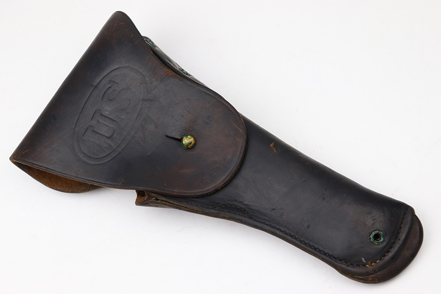 7/21/22 – This is an original WW1 production M1916 holster for a model 1911 pistol. The holster is in very good condition with soft, pliable leather. The leather has some dark coloring from aging and previous use, but the leather and stitching are all original and intact. The interior leather shows signs of previous use as well. The back leather is maker stamped and dated “BOYT 1917”. This is a faint stamp, but still visible. The front leather is “US” stamped. There are no other markings.