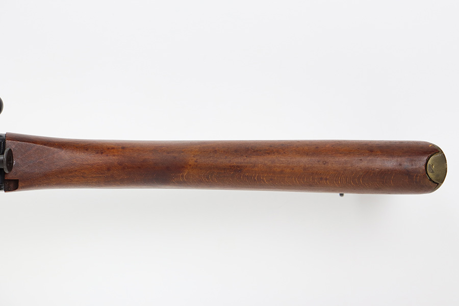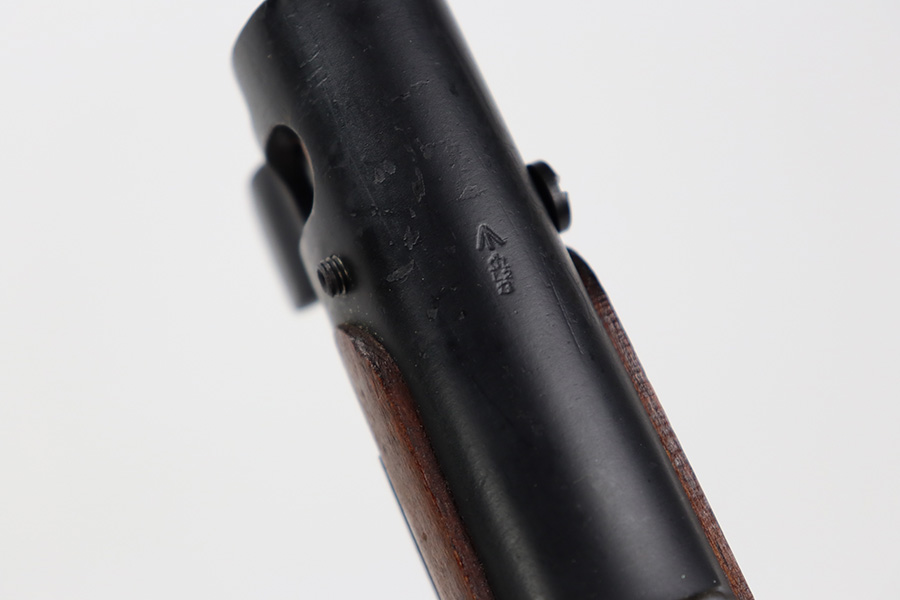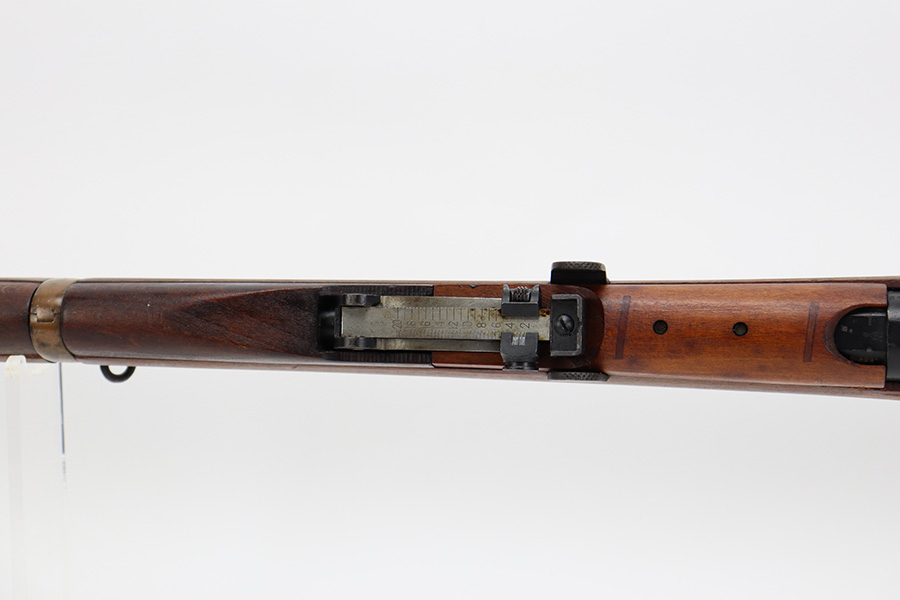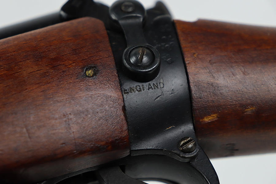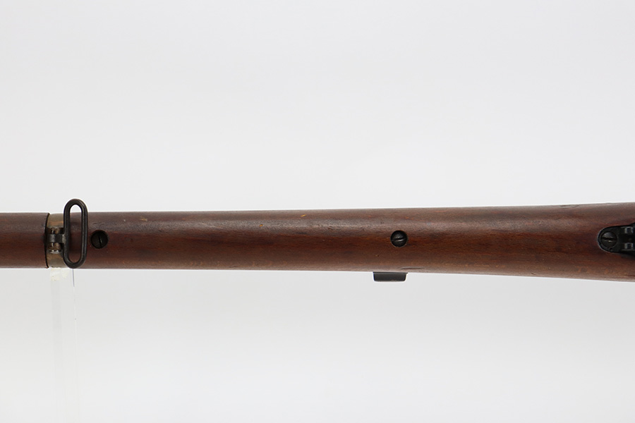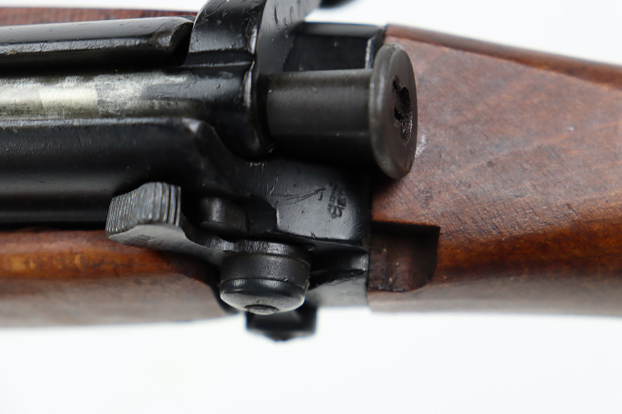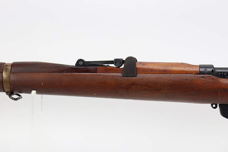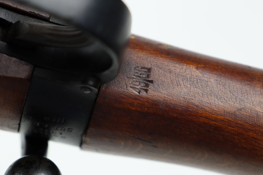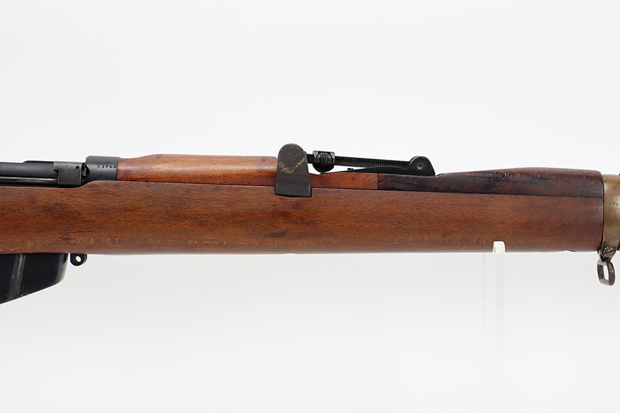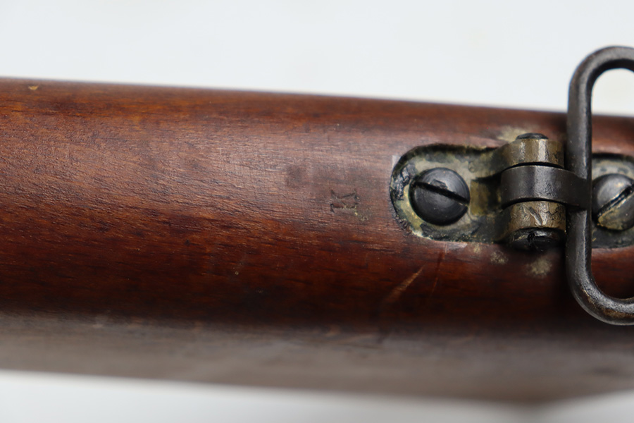 7/26/23 – This is an excellent example of a BSA Enfield SHTLE III* Rifle issued to the British military in 1917. It is all matching and has the proper British proofs throughout. There is an “FTR 1953” marking on the receiver, indicating it was Factory Thorough Repaired or Reconditioned in 1953. It comes with a 1907-bayonet, leather scabbard, and canvas frog. Unfortunately, the leather scabbard is torn in two pieces (the leather is fairly dry and brittle). The gun itself has retained about 96% of its black enamel finish with just minor high edge in general. Minty wood stock. Mint bore.
