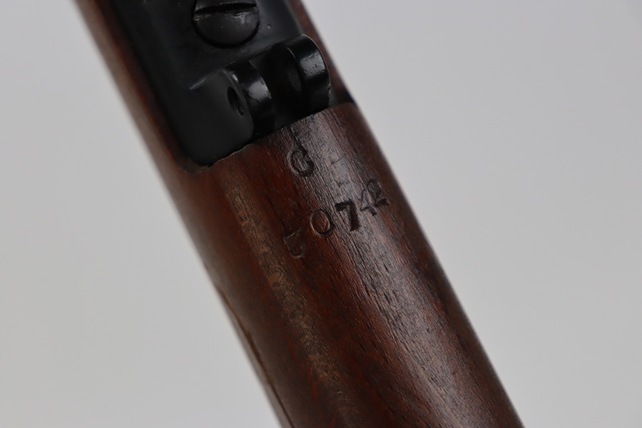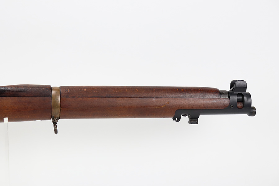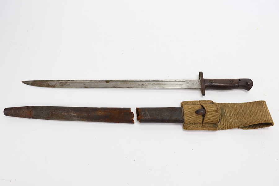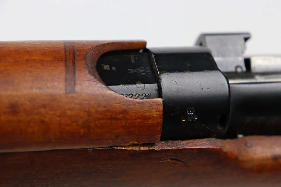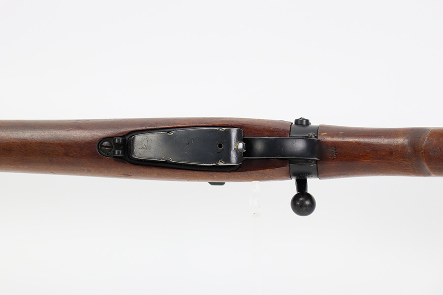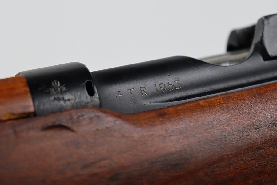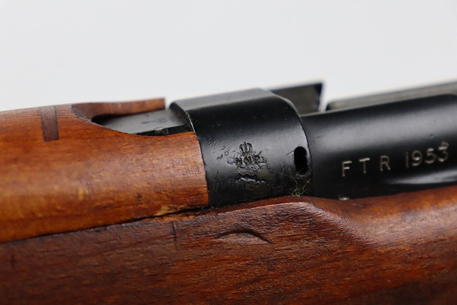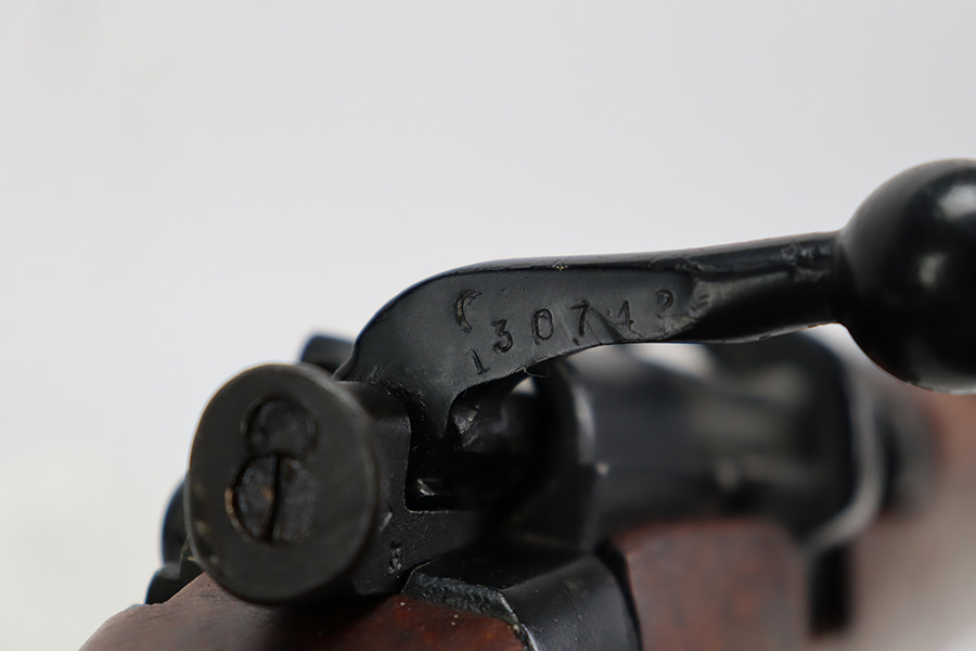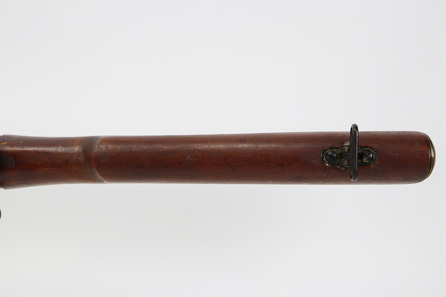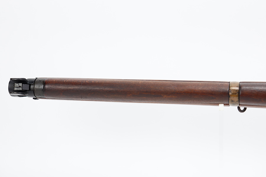 7/26/23 – This is an excellent example of a BSA Enfield SHTLE III* Rifle issued to the British military in 1917. It is all matching and has the proper British proofs throughout. There is an “FTR 1953” marking on the receiver, indicating it was Factory Thorough Repaired or Reconditioned in 1953. It comes with a 1907-bayonet, leather scabbard, and canvas frog. Unfortunately, the leather scabbard is torn in two pieces (the leather is fairly dry and brittle). The gun itself has retained about 96% of its black enamel finish with just minor high edge in general. Minty wood stock. Mint bore.