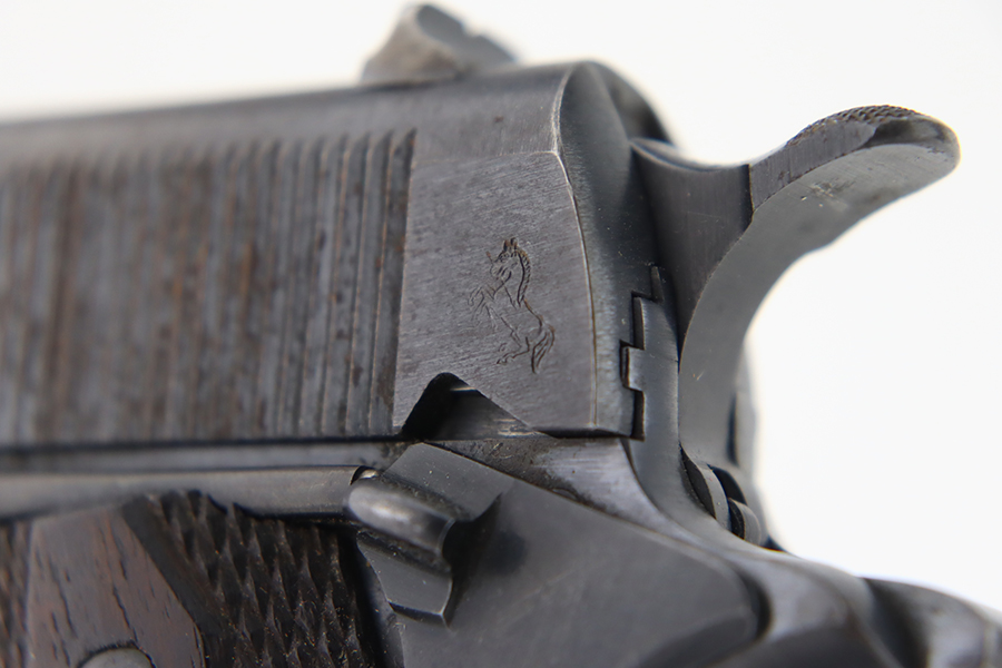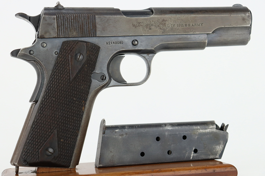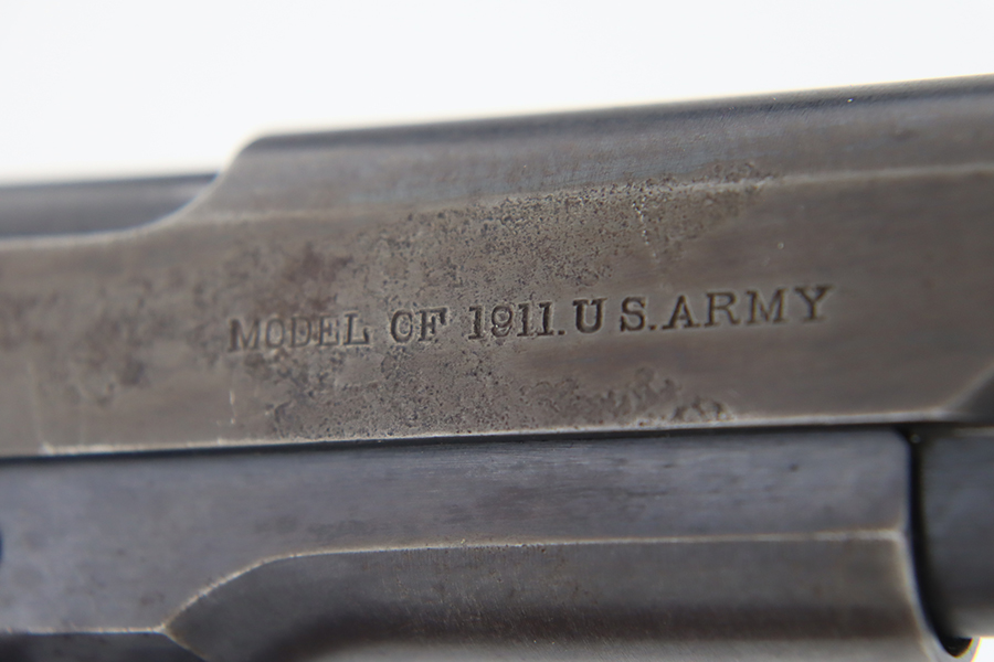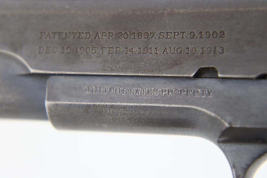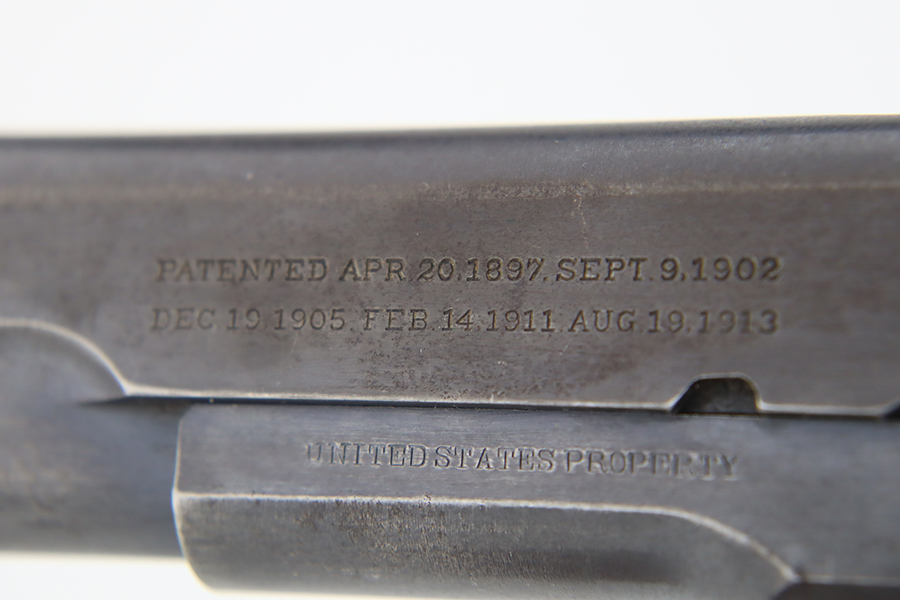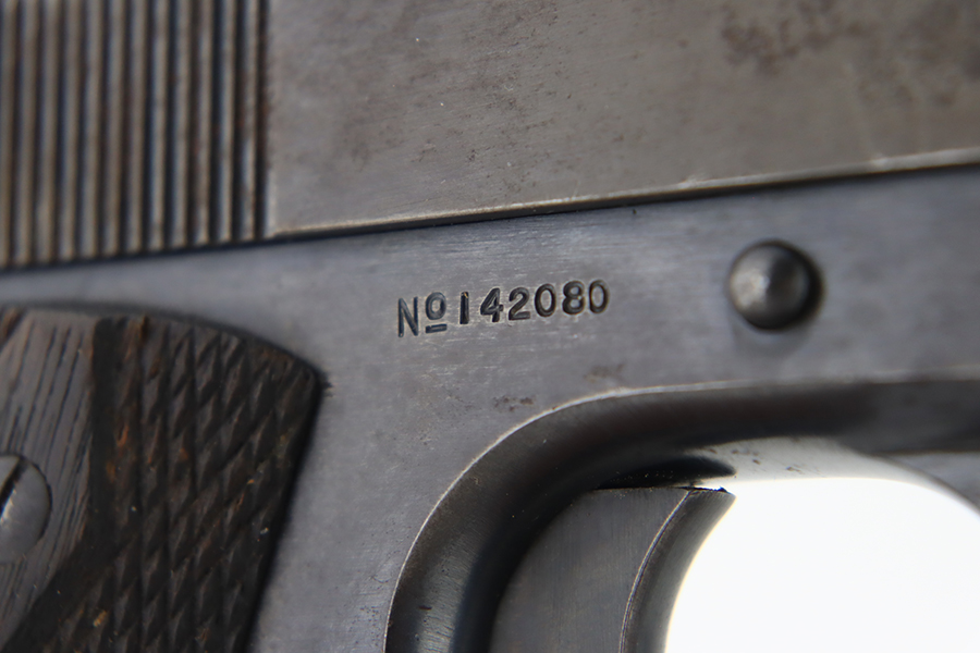 3/5/24 – This is a nice example of Colt Model 1911 issued to the US military in 1917. It is all correct and has a proper “H P” Colt barrel. Comes with a later magazine. The gun has retained roughly 85% of its original finish. While there isn’t a ton of actual finish loss, there is brown patina and spotty oxidation throughout. An area of noticeable pitting on the right side of the slide. Fitted with period-correct wood grips. The bore has good rifling, but there is some frosting in the grooves.