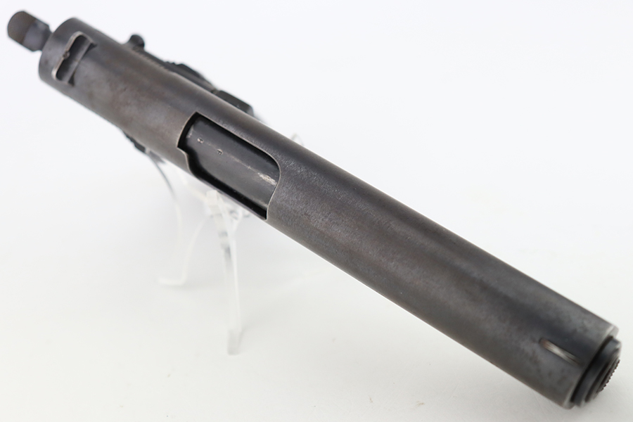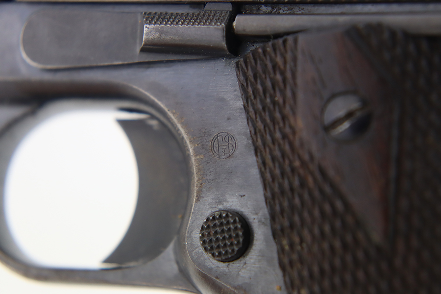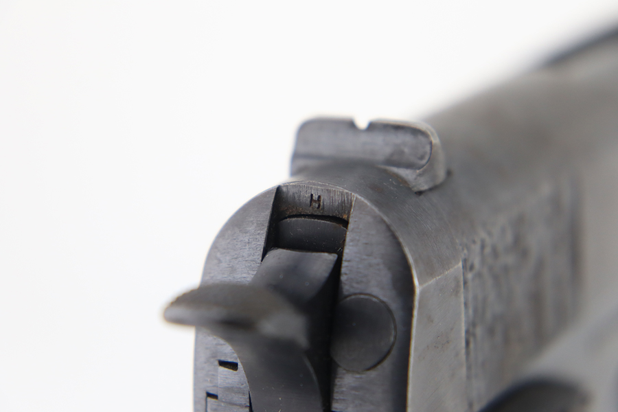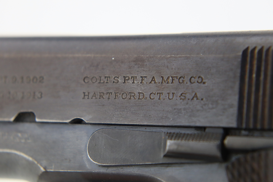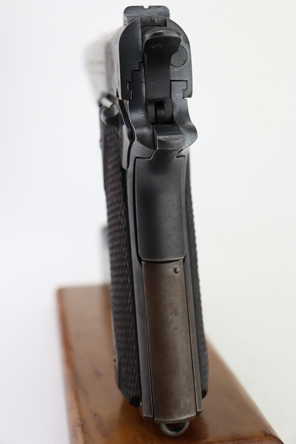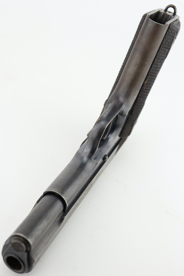 3/5/24 – This is a nice example of Colt Model 1911 issued to the US military in 1917. It is all correct and has a proper “H P” Colt barrel. Comes with a later magazine. The gun has retained roughly 85% of its original finish. While there isn’t a ton of actual finish loss, there is brown patina and spotty oxidation throughout. An area of noticeable pitting on the right side of the slide. Fitted with period-correct wood grips. The bore has good rifling, but there is some frosting in the grooves.