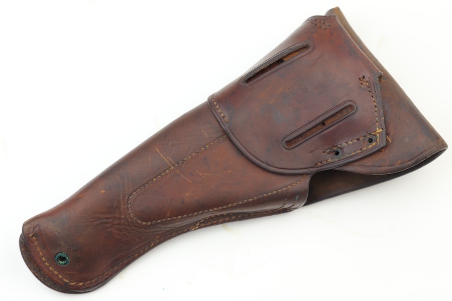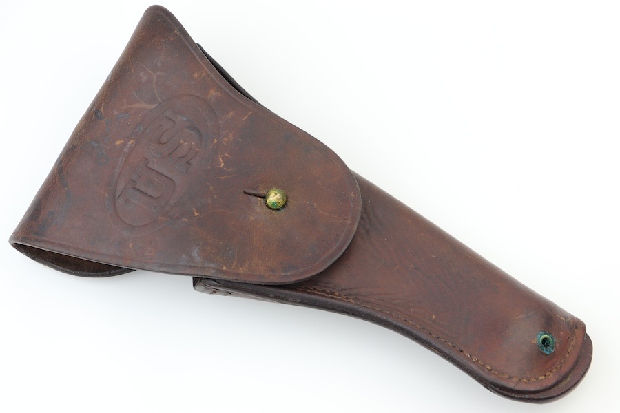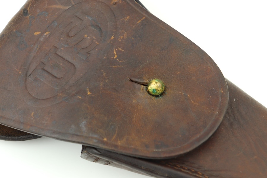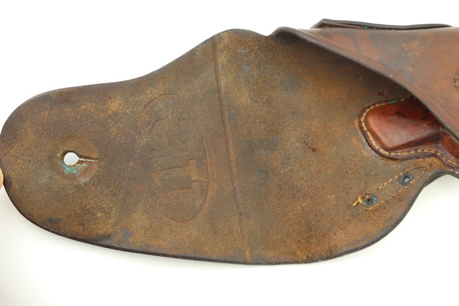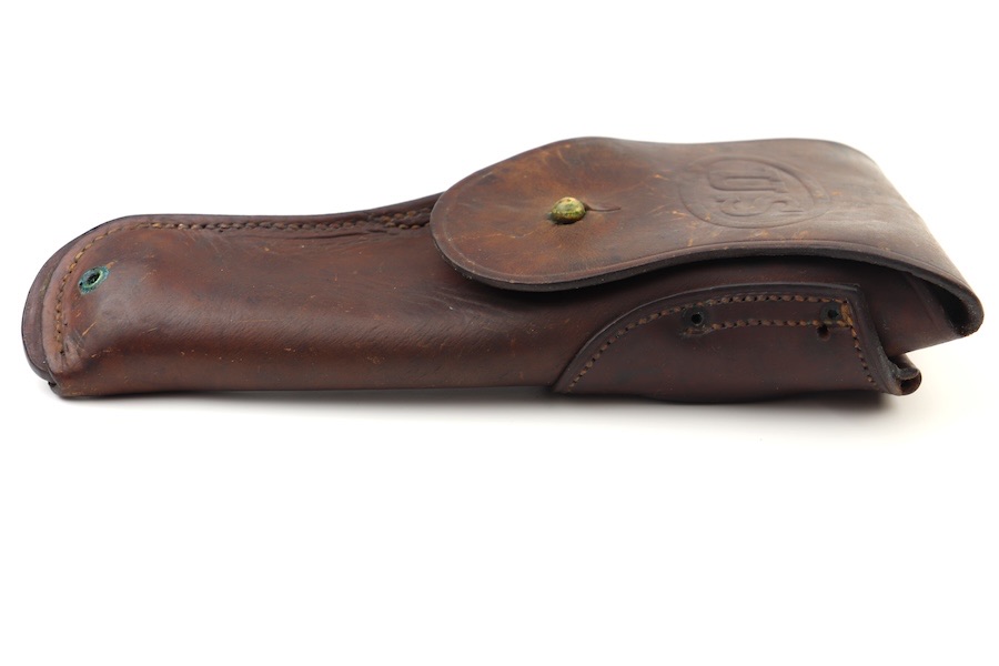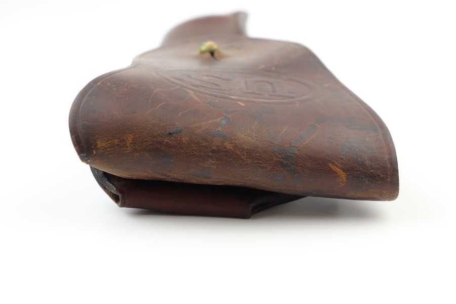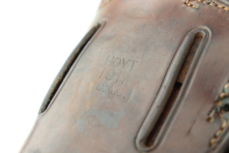 12/22/23 – This is an original WW1 production M1916 leather holster by Hoyt. Made for the M1911 Colt pistol, this holster is in good overall condition with signs of aging and use throughout. The leather is soft and pliable, with wrinkling and surface wear throughout. The front “US” stamp is still visible, and the back leather has a very nice maker stamp, a visible date stamp, and an inspector’s initial stamp. Excellent stitching throughout, all original and complete.