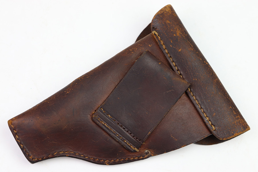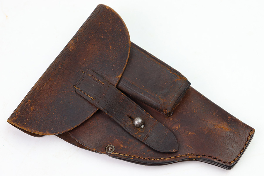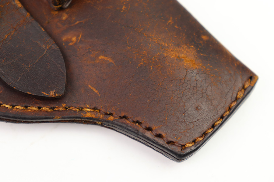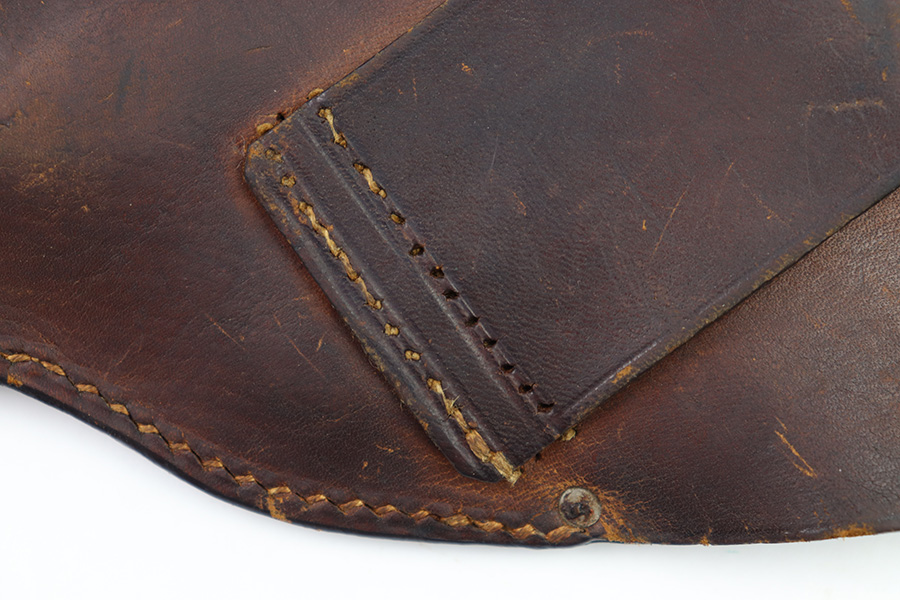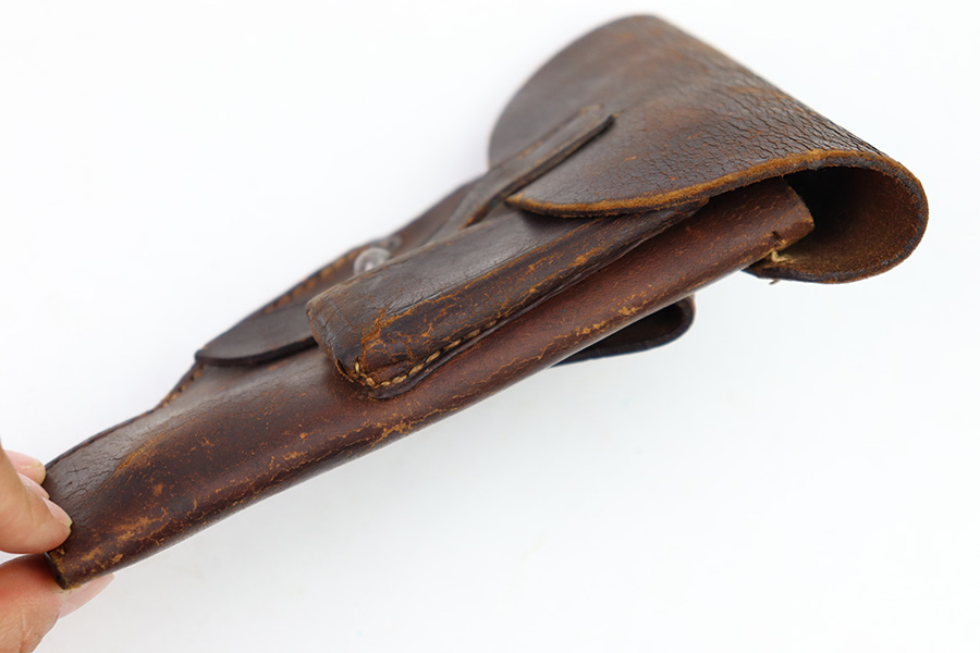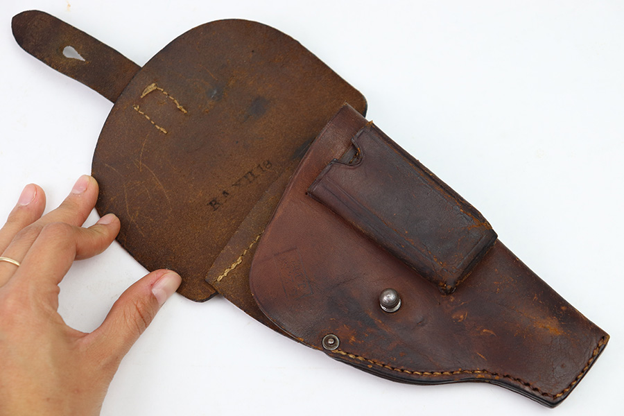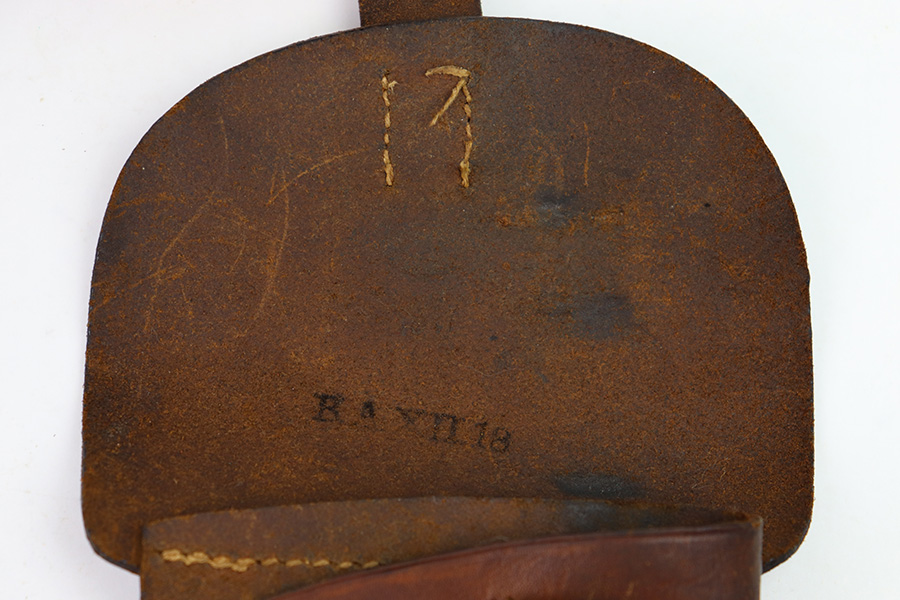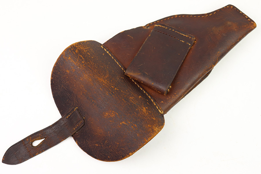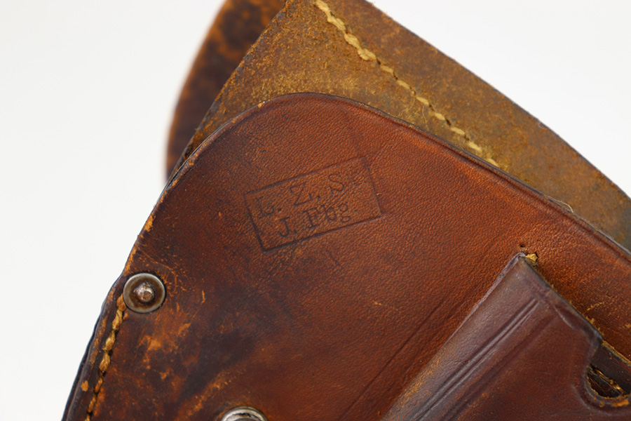 8/17/22 – This is an original WW1 era production leather pistol holster. Likely for a Mauser M1910 or Sauer M1913. The holster is about 6.75 inches long when closed, and about 5 inches wide at the widest point. The front leather is distributor stamped “L.Z. St. / J. Fbg.”. The interior leather has a faint maker stamp (we can’t decipher), 1917 date stamp, and a Roman Numeral stamp, as shown. The leather is all intact despite some surface wear and scuffing, along with typical use wear and pliability. There’s some loose stitches on the front leather near the toe, and there’s missing stitches on the back belt loop, but this doesn’t affect functionality.