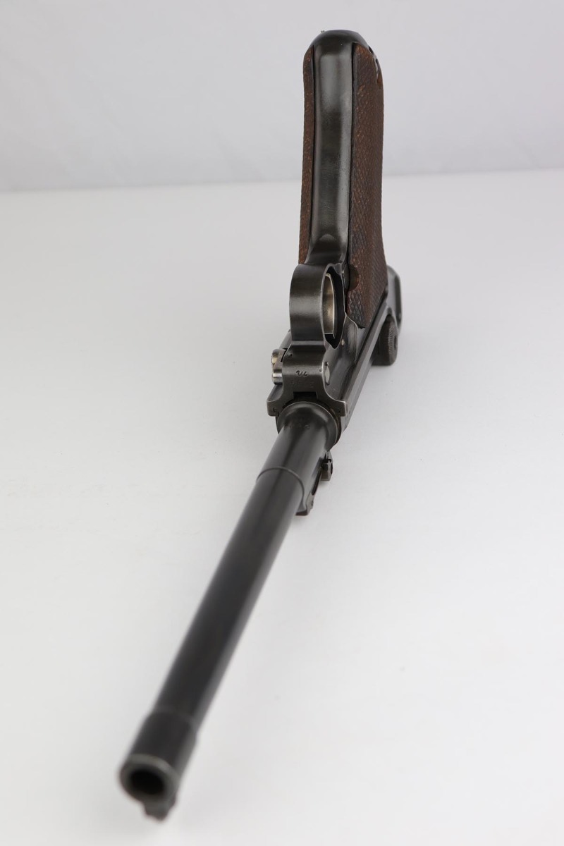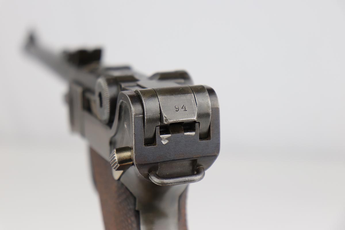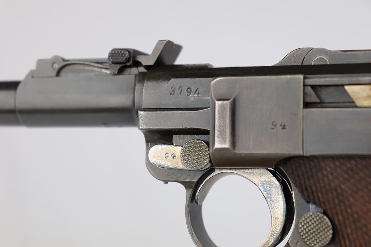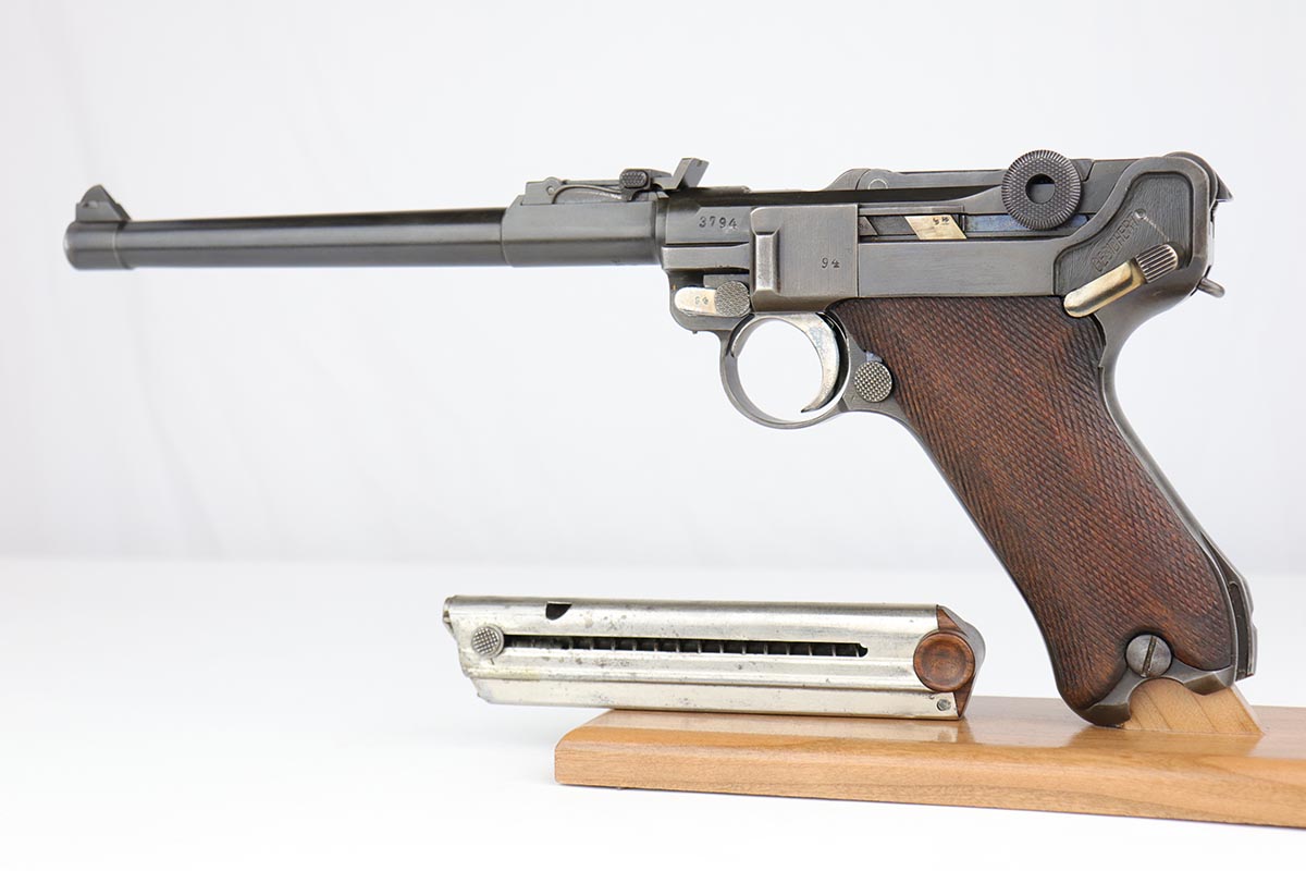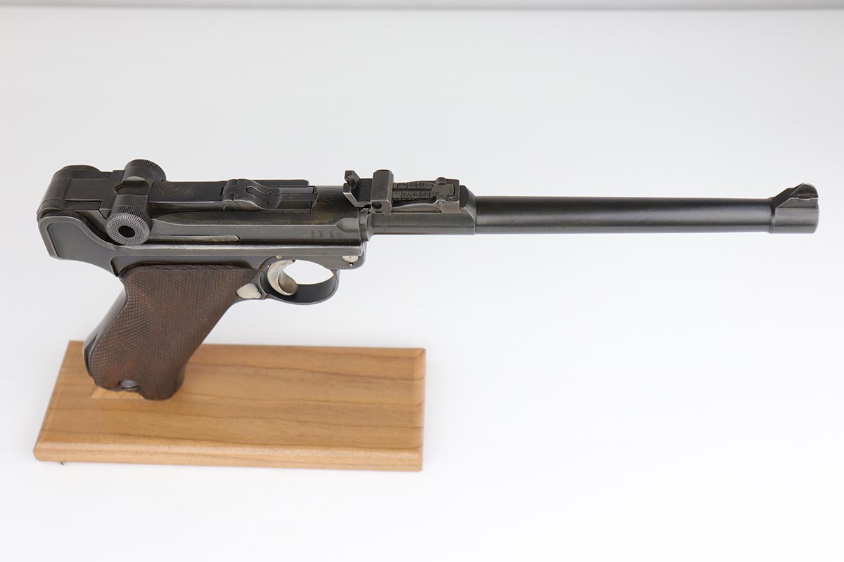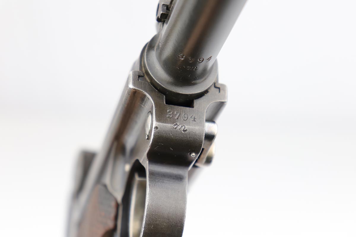 7/22/19 – This is a desirable DWM LP.08 or Artillery Luger from 1917. It is all matching numbers, including the grips. The bluing rates in the mid-90s but it is an old restoration, with patina that has set in on most areas of the pistol. There is some minor freckling under the finish in a few areas, mainly the barrel, but no notable pitting. The magazine is in excellent condition with blank wood bottom. The grips show some age and handling wear but are in very good condition overall. The bore shows minor frost throughout but good rifling and no corrosion. Good mechanics, so this one would make a good shooter, as well.