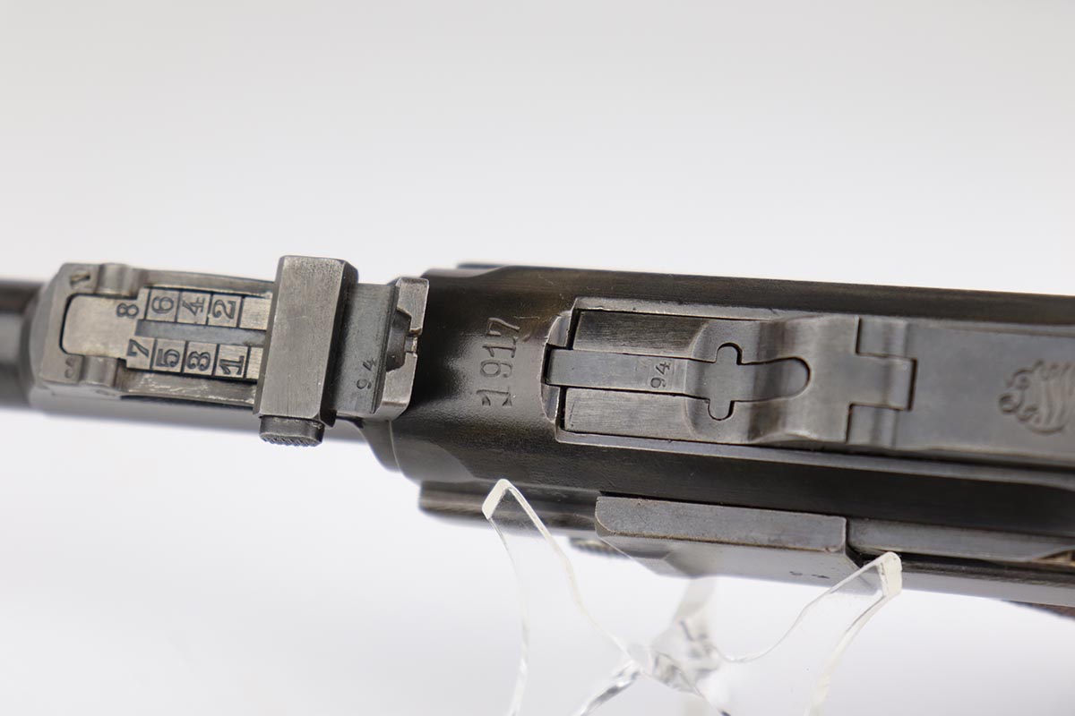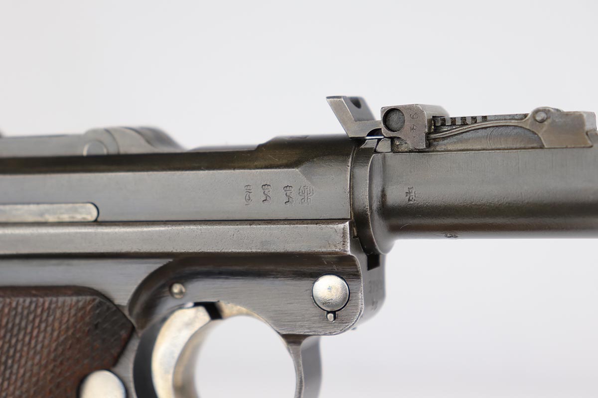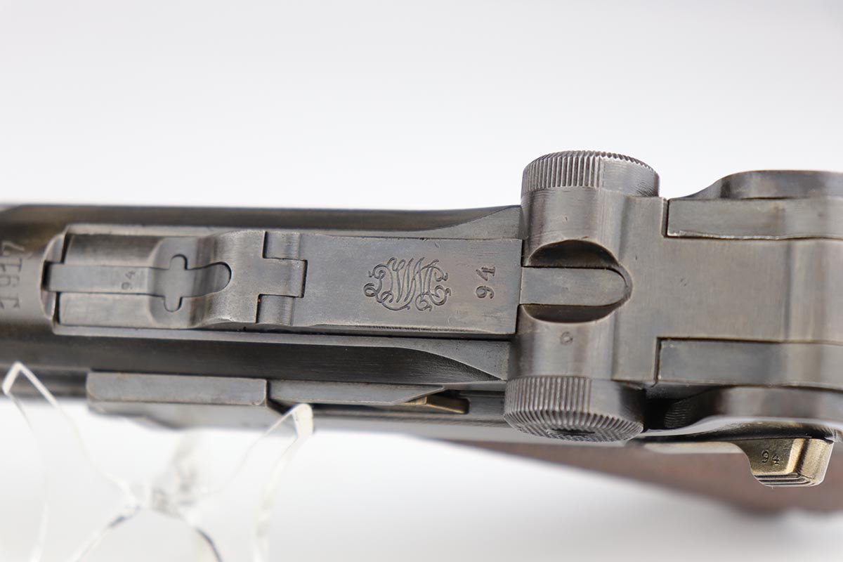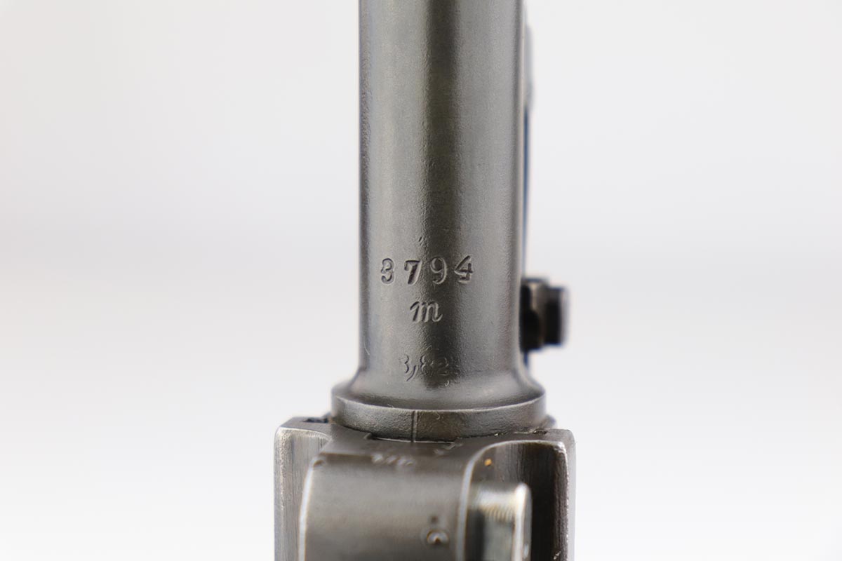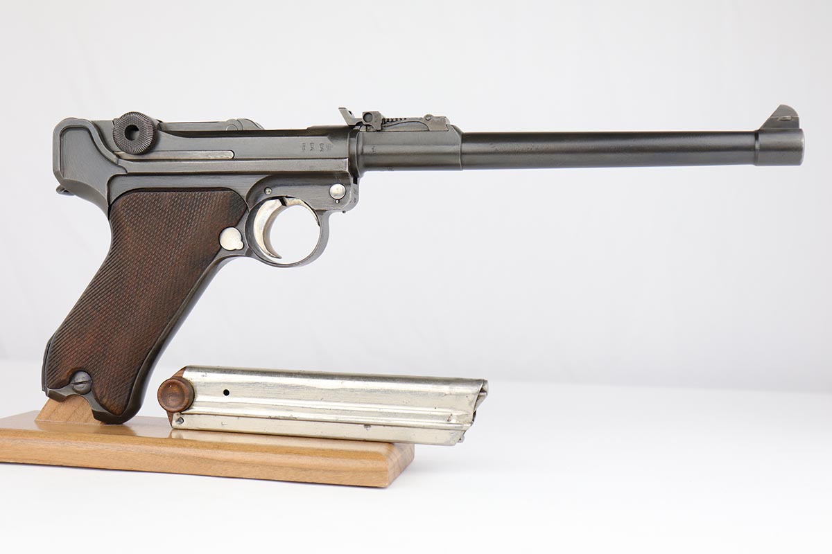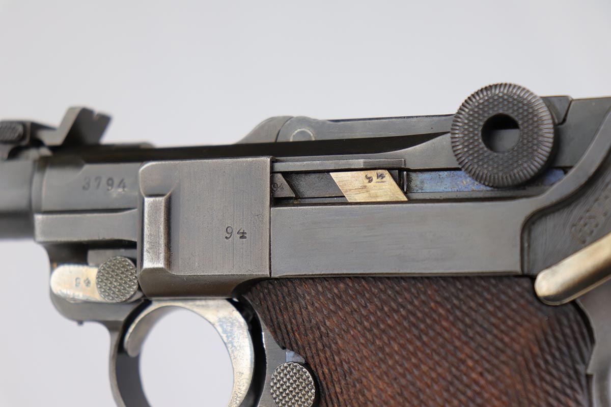 7/22/19 – This is a desirable DWM LP.08 or Artillery Luger from 1917. It is all matching numbers, including the grips. The bluing rates in the mid-90s but it is an old restoration, with patina that has set in on most areas of the pistol. There is some minor freckling under the finish in a few areas, mainly the barrel, but no notable pitting. The magazine is in excellent condition with blank wood bottom. The grips show some age and handling wear but are in very good condition overall. The bore shows minor frost throughout but good rifling and no corrosion. Good mechanics, so this one would make a good shooter, as well.